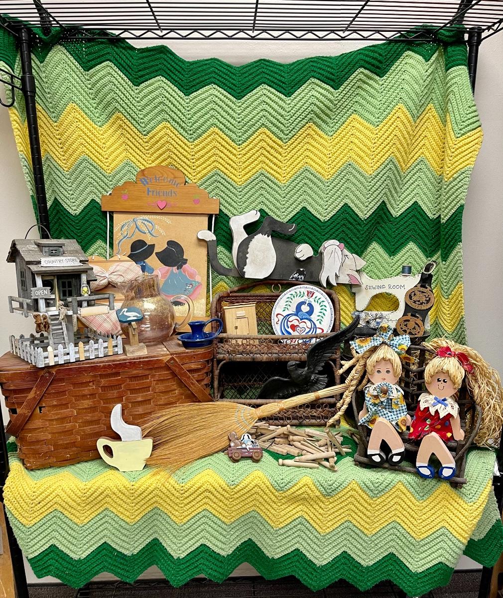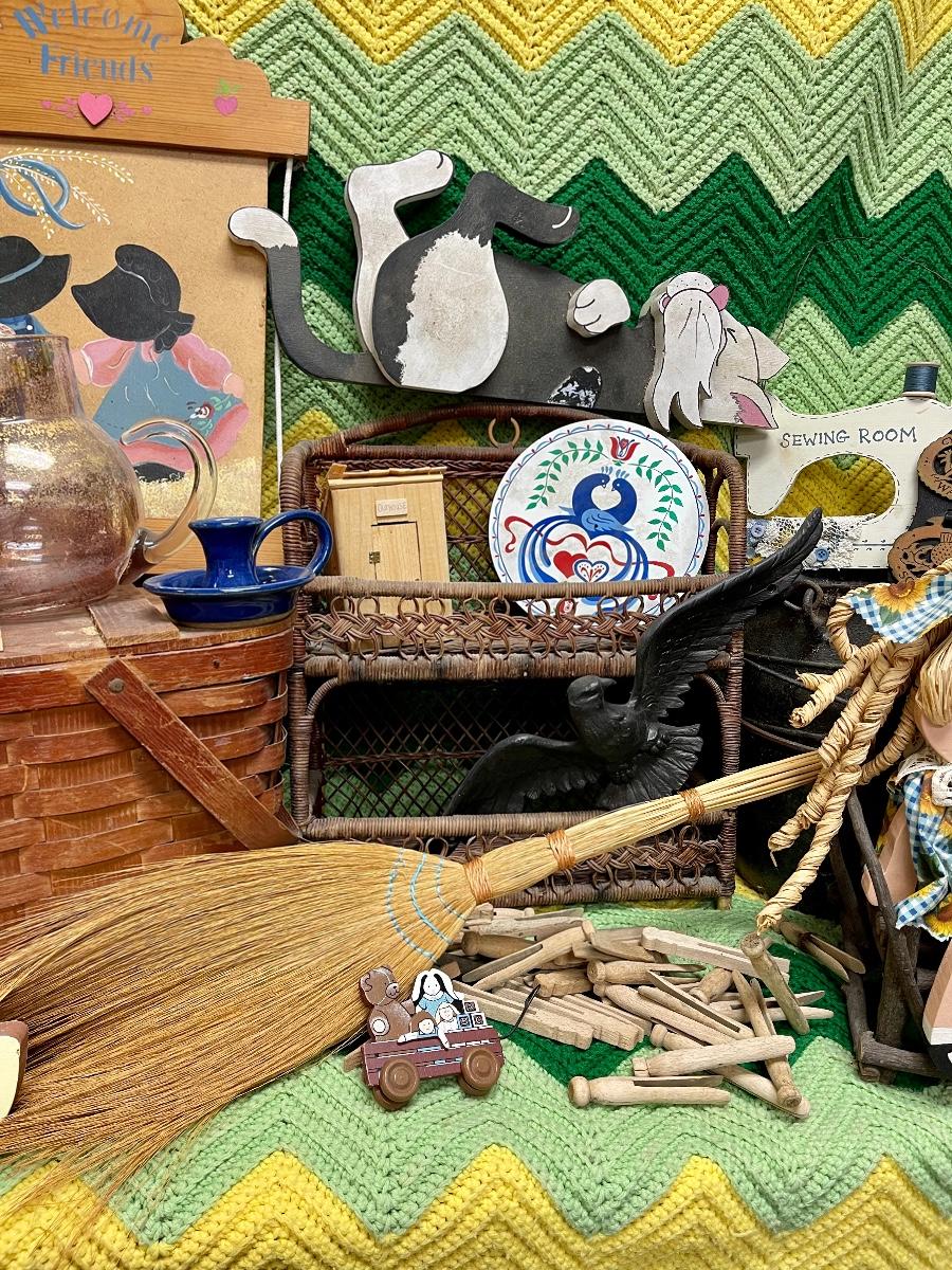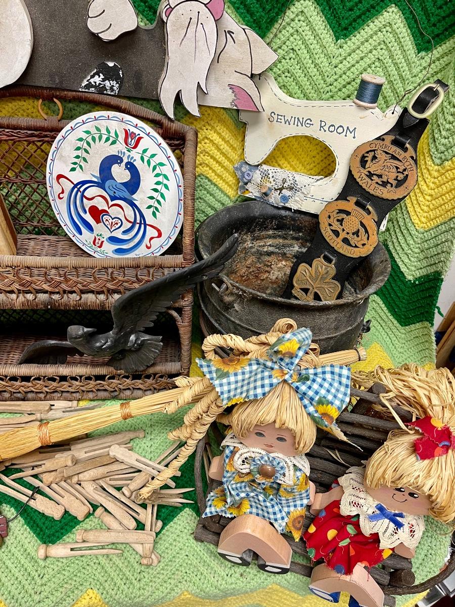 Rustic country decor lot Includes picnic basket, afghan, wicker display shelf, Two with drawls with wood bench, small outhouse, wood plaque, plastic eagle emblem, two cast iron pot’s stuck together, glass pitcher, blue ceramic candle holder, wood cat figurine, vintage wooden clothespins, etc