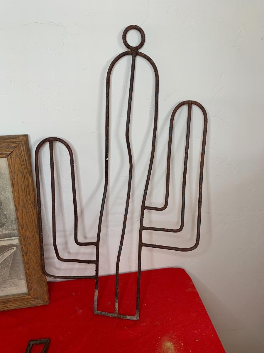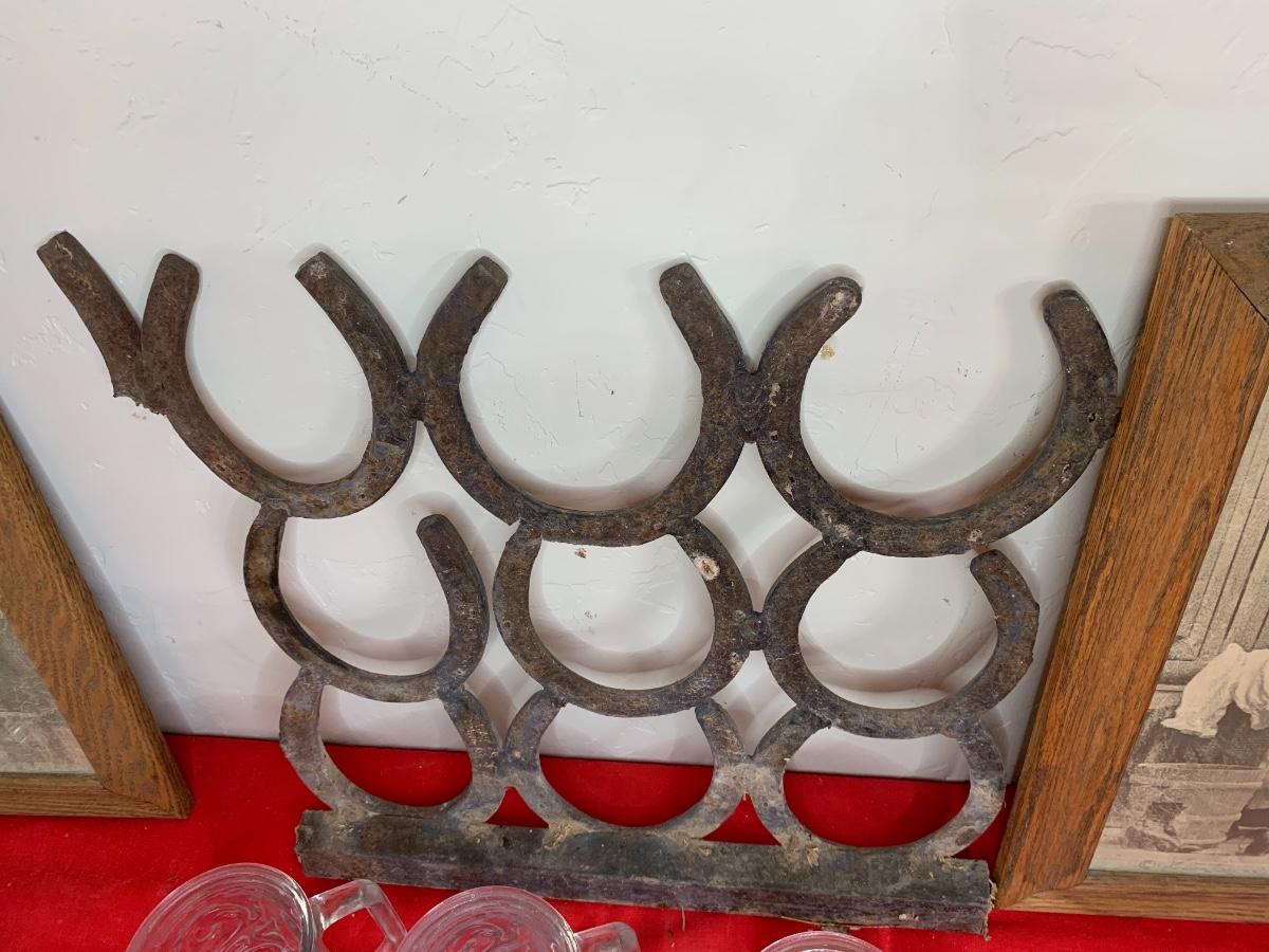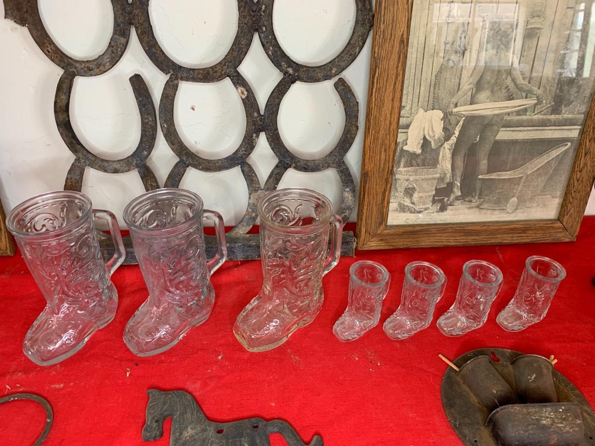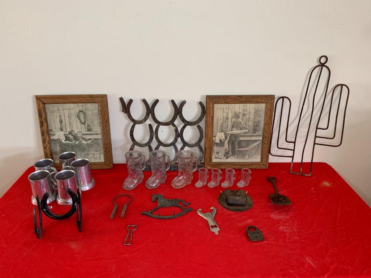 Cowboy decor including two wood framed pictures, iron decor pieces including horseshoes and a cactus, 3 tall and 4 small cowboy boot drinking glasses, 5 silver plated drinking mugs, and an assortment of hanging metal wall decor including a rocking horse key holder, duo lock and matchstick wall pocket.