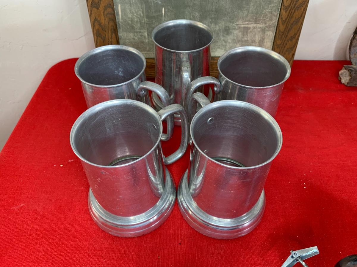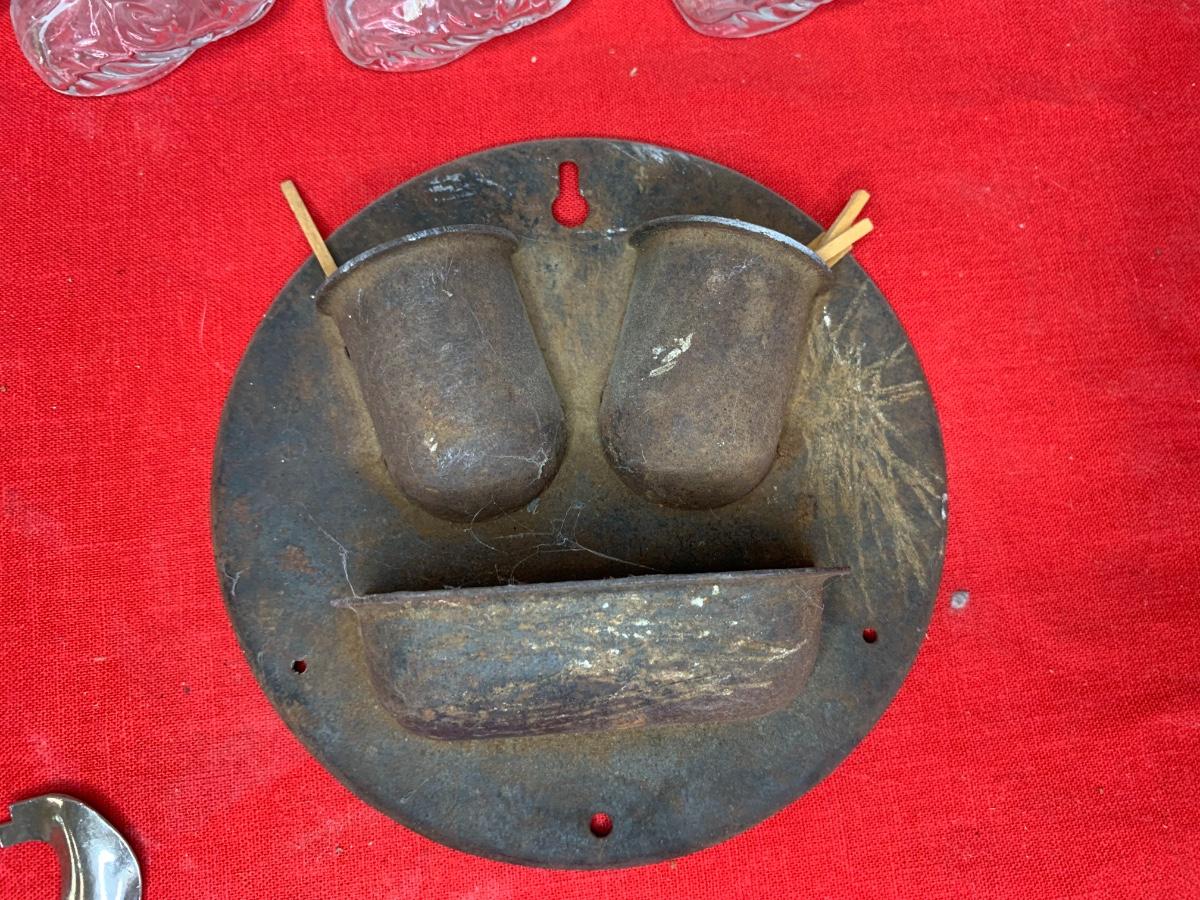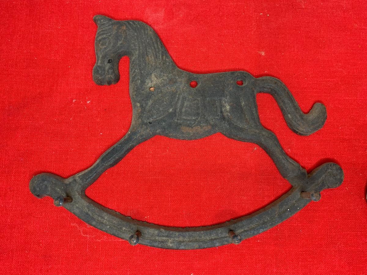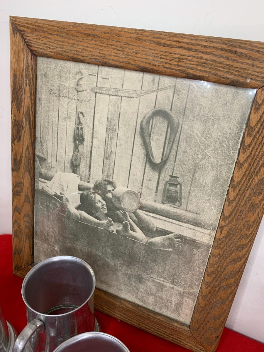 Cowboy decor including two wood framed pictures, iron decor pieces including horseshoes and a cactus, 3 tall and 4 small cowboy boot drinking glasses, 5 silver plated drinking mugs, and an assortment of hanging metal wall decor including a rocking horse key holder, duo lock and matchstick wall pocket.