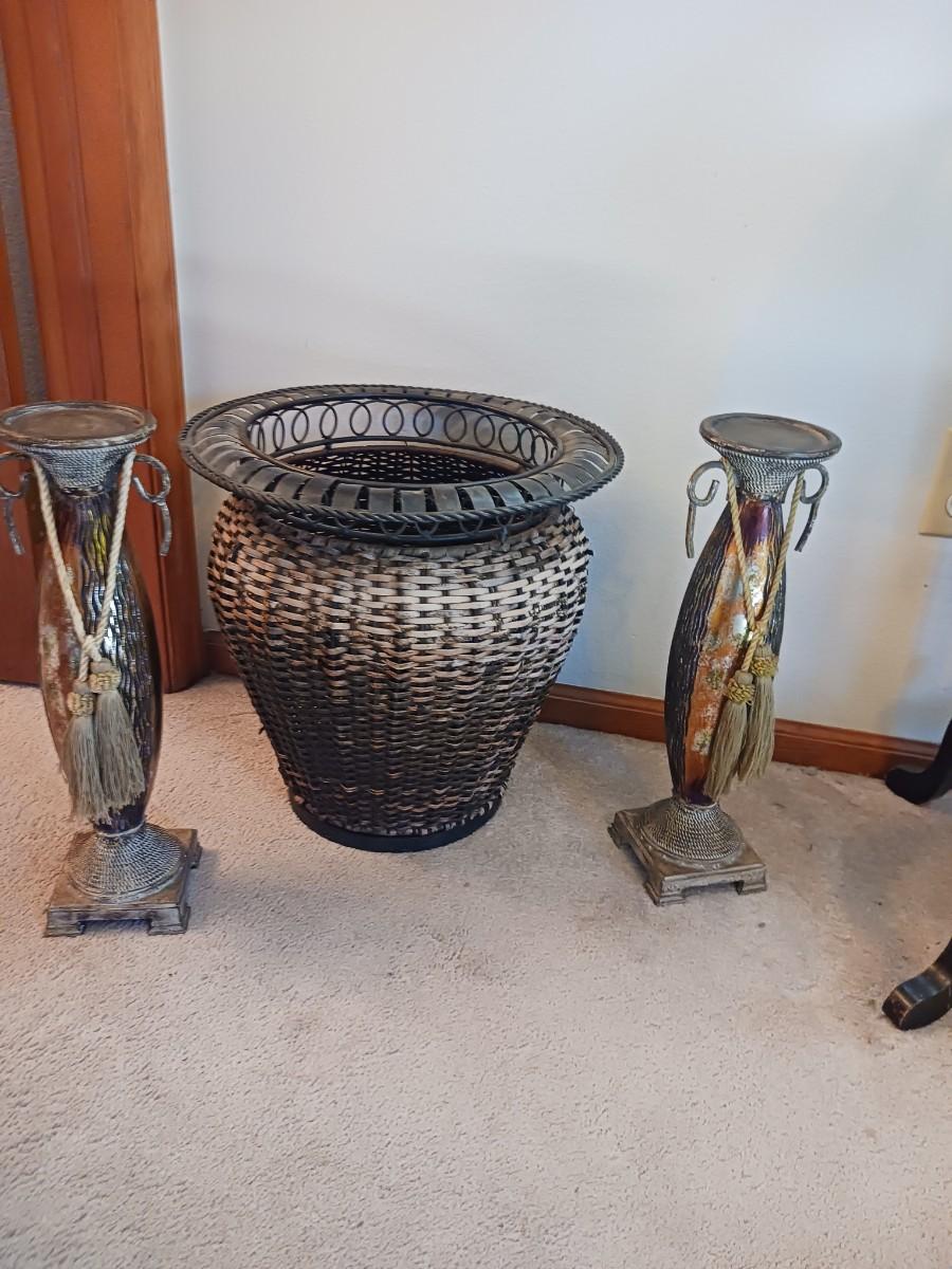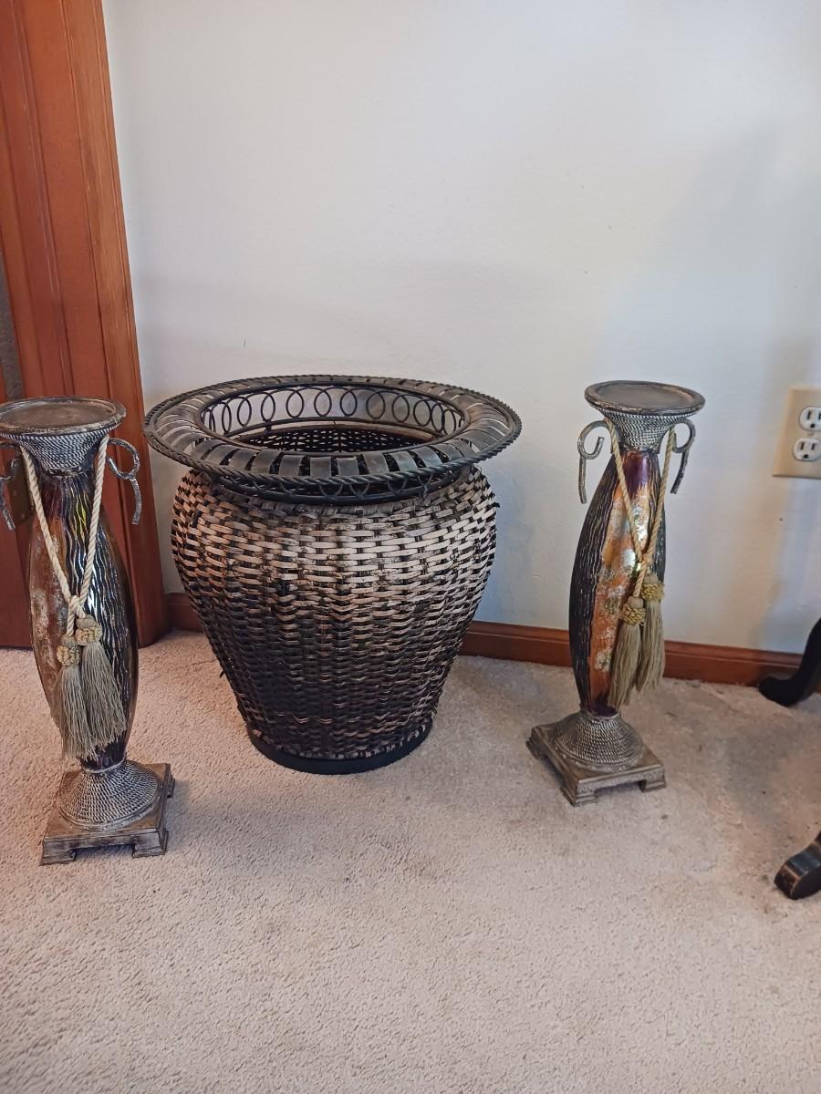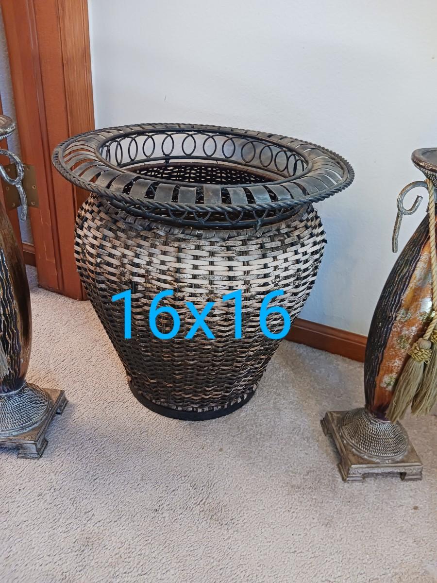WICKER BASKET W/ METAL RIM (16X16) TWO CANDLE HOLDERS