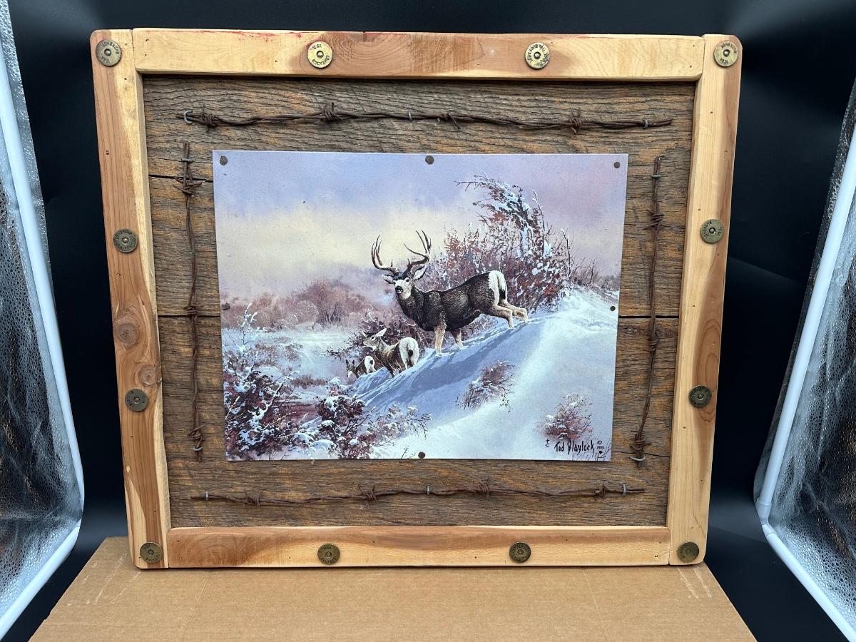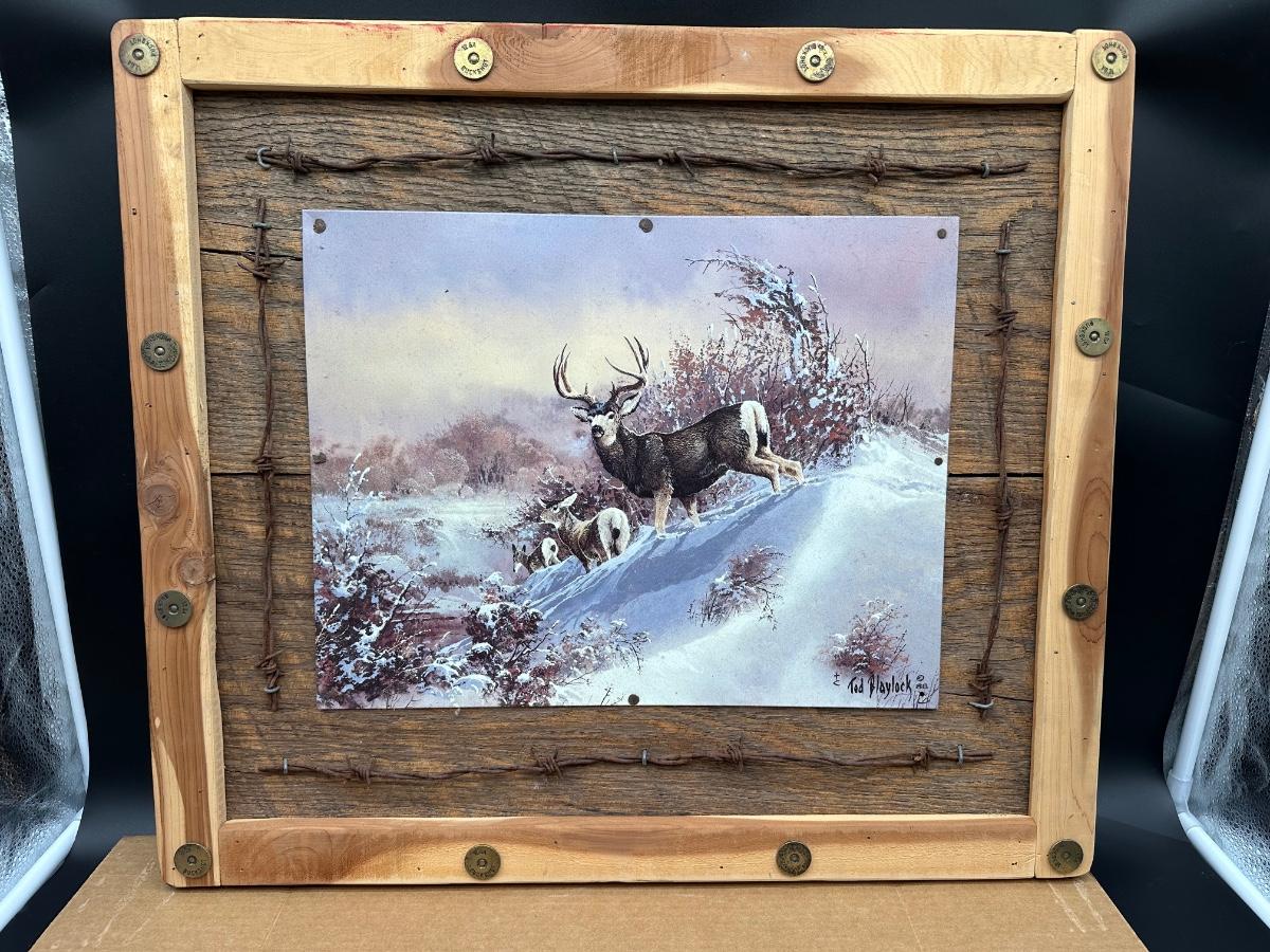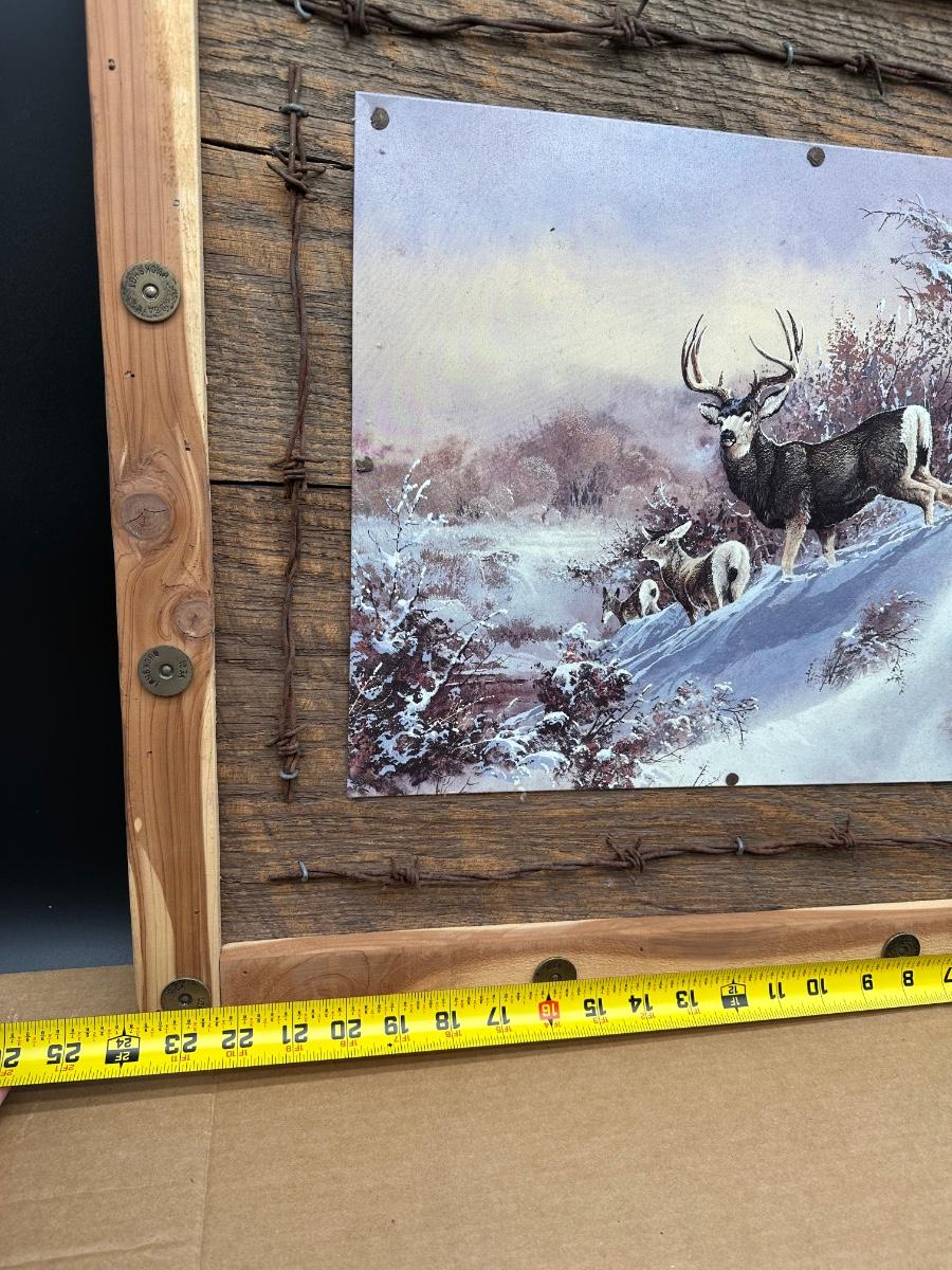 Large rustic wildlife wall art featuring a Ted Blaylock (1988) deer scene printed on a tin/metal panel (not paper or canvas). The tin artwork is mounted to a reclaimed wood backing and framed with barn wood, accented by real barbed wire and decorative cartridge-style fasteners for a true lodge / hunting cabin look.