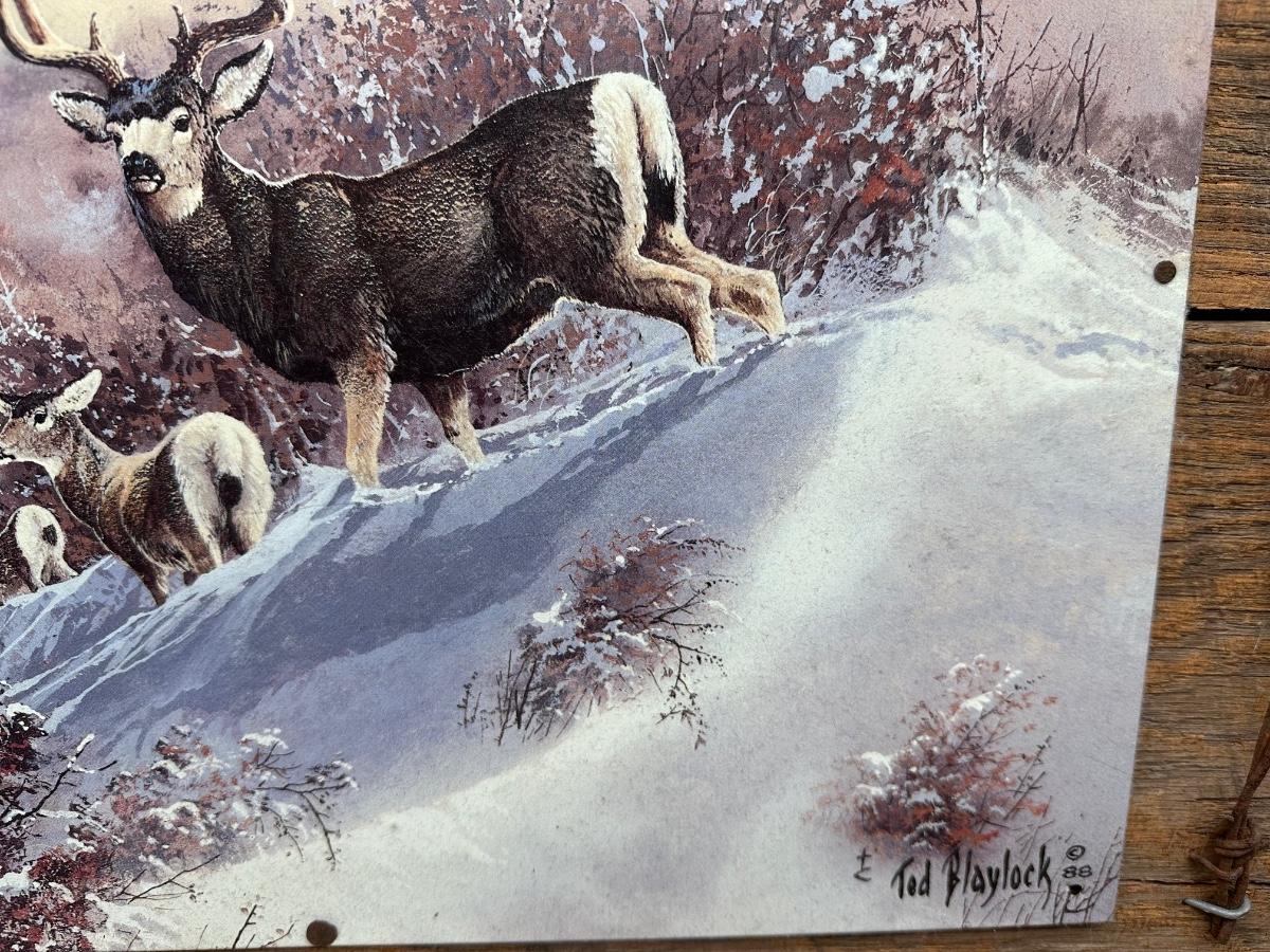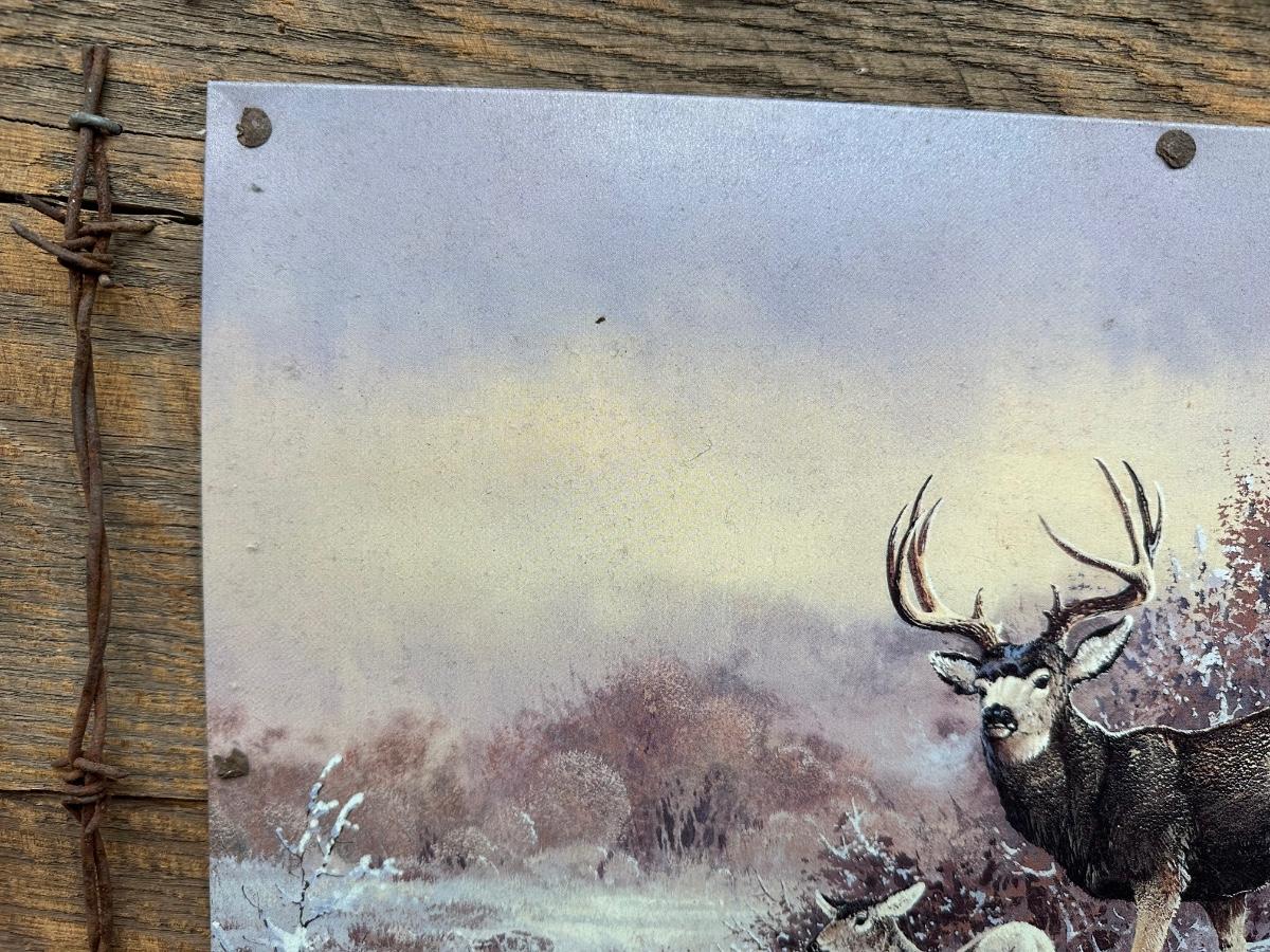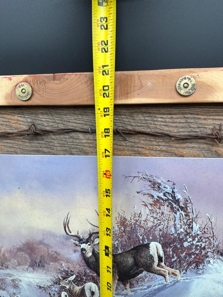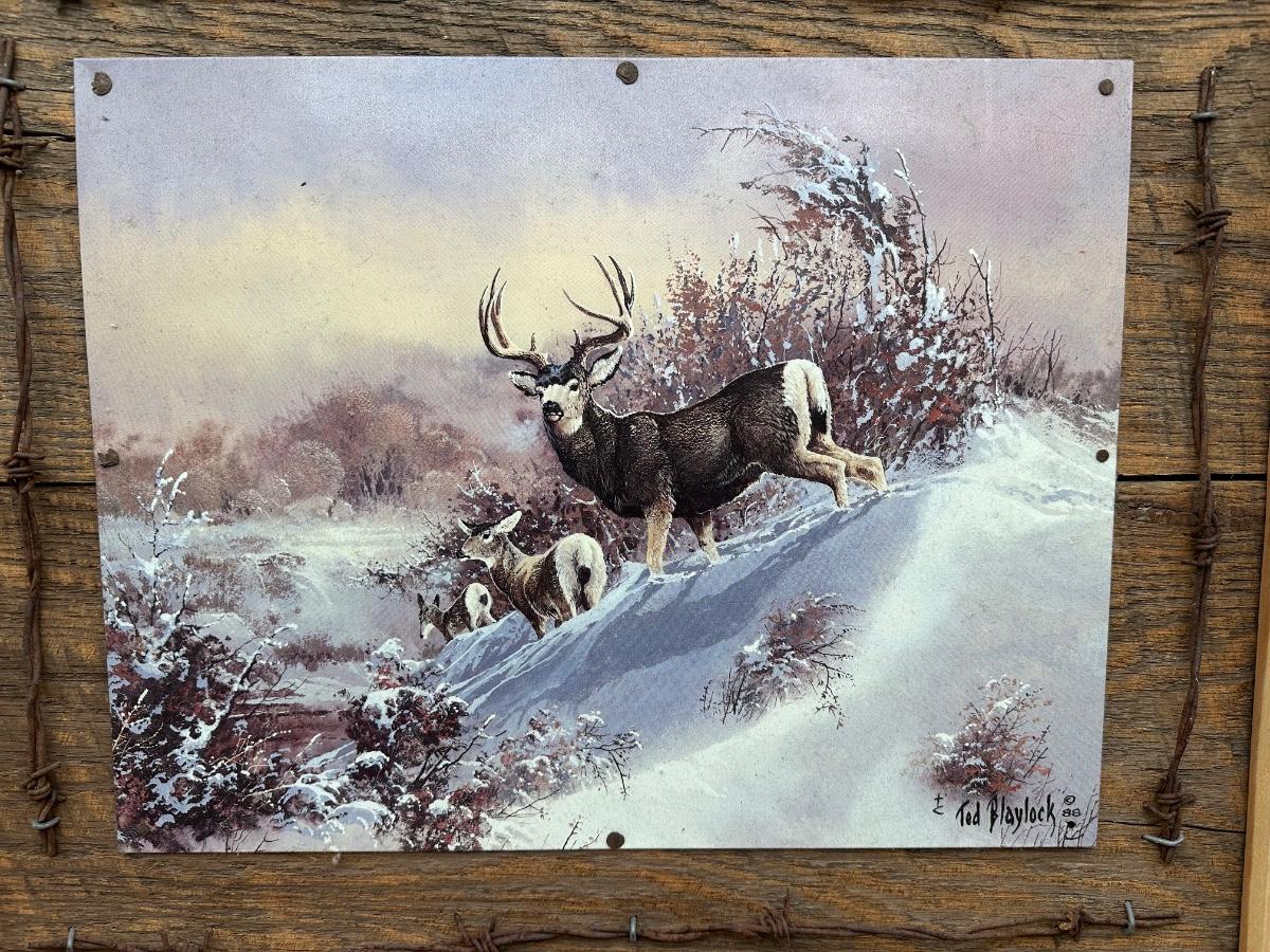 Large rustic wildlife wall art featuring a Ted Blaylock (1988) deer scene printed on a tin/metal panel (not paper or canvas). The tin artwork is mounted to a reclaimed wood backing and framed with barn wood, accented by real barbed wire and decorative cartridge-style fasteners for a true lodge / hunting cabin look.