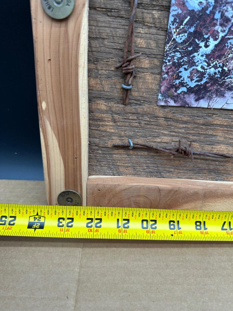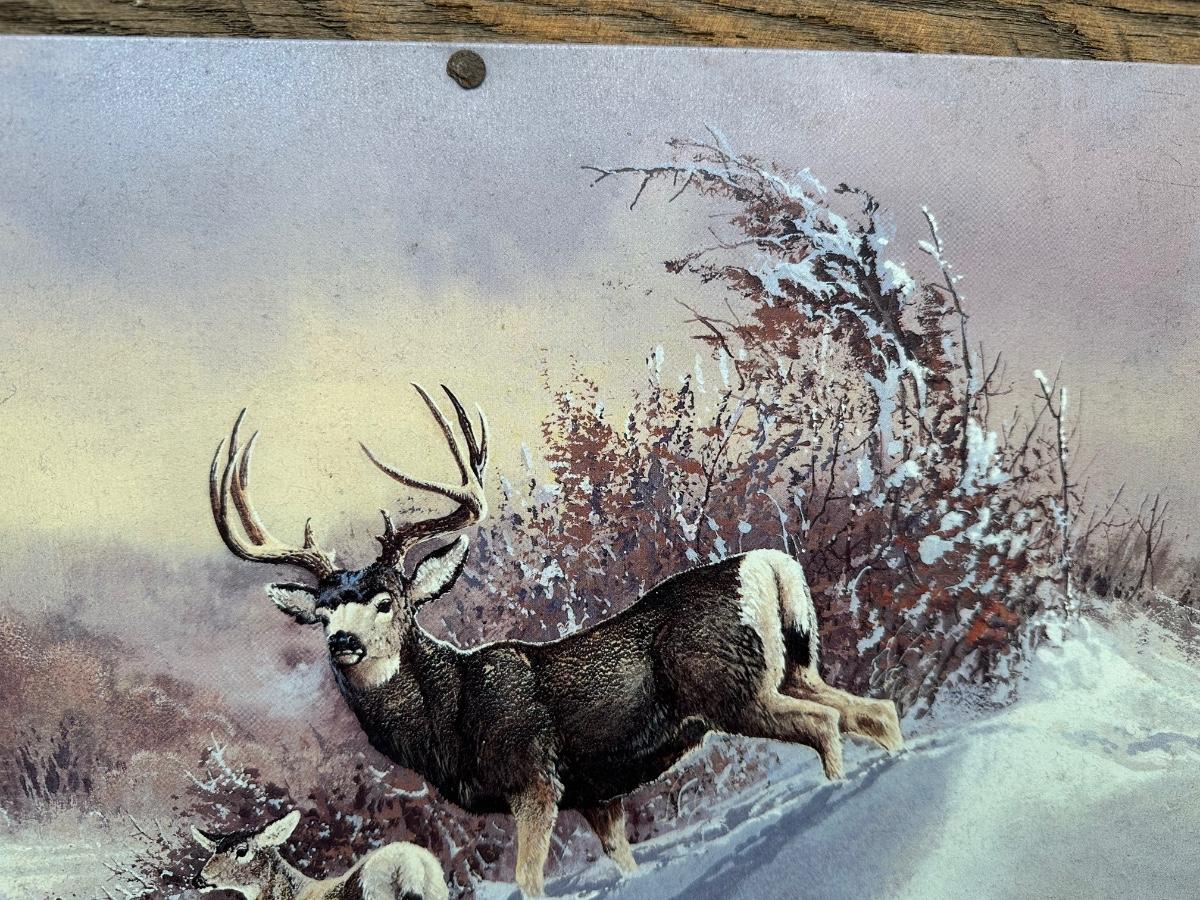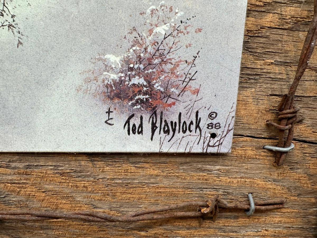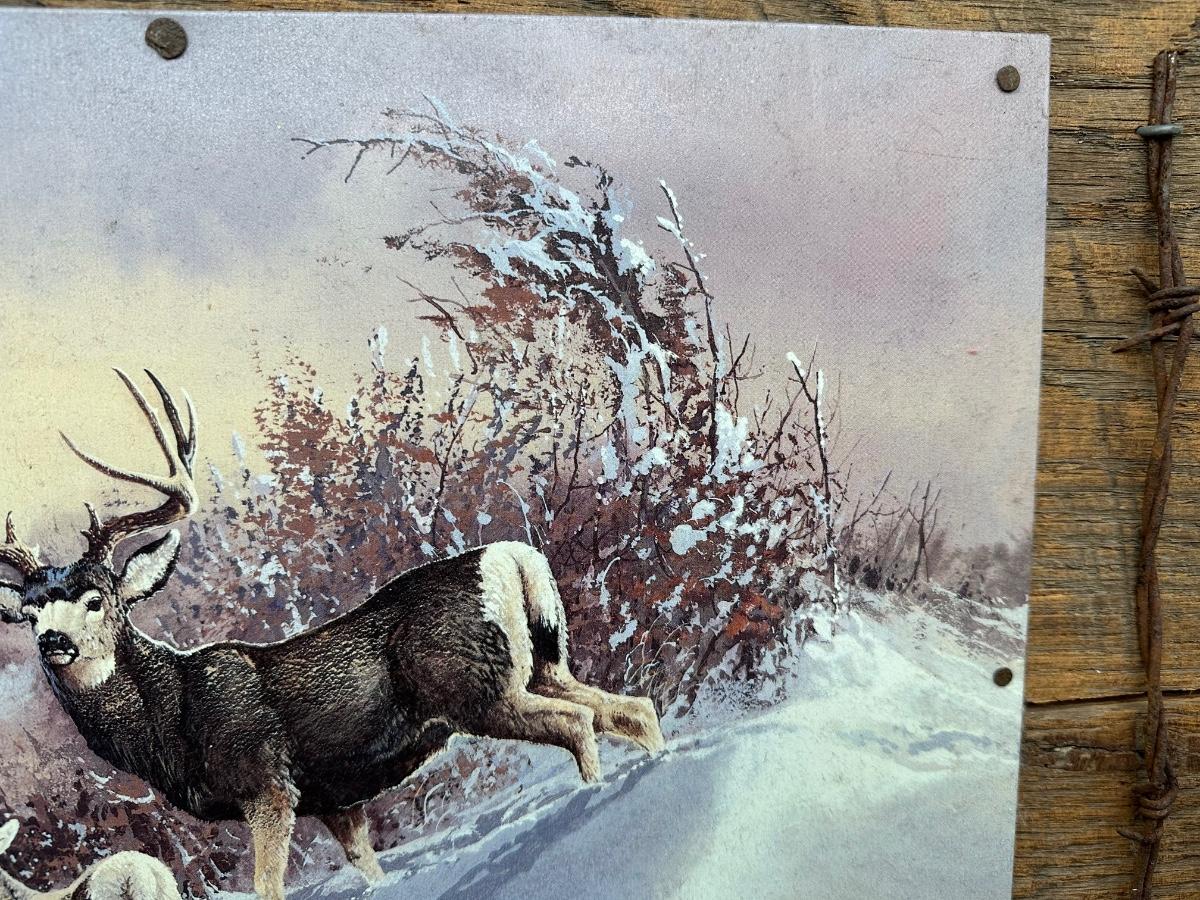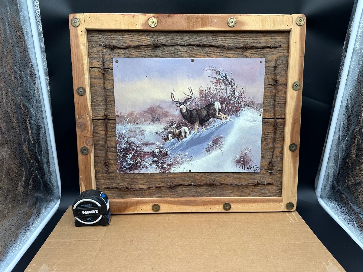 Rustic Deer Tin Art – Ted Blaylock (1988) Signed Tin Panel – Barn Wood & Barbed Wire Frame