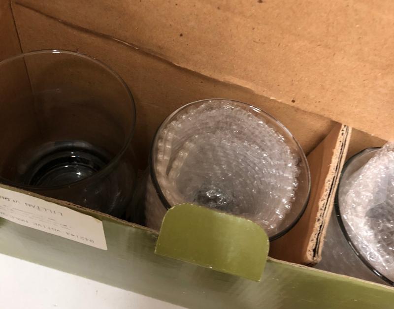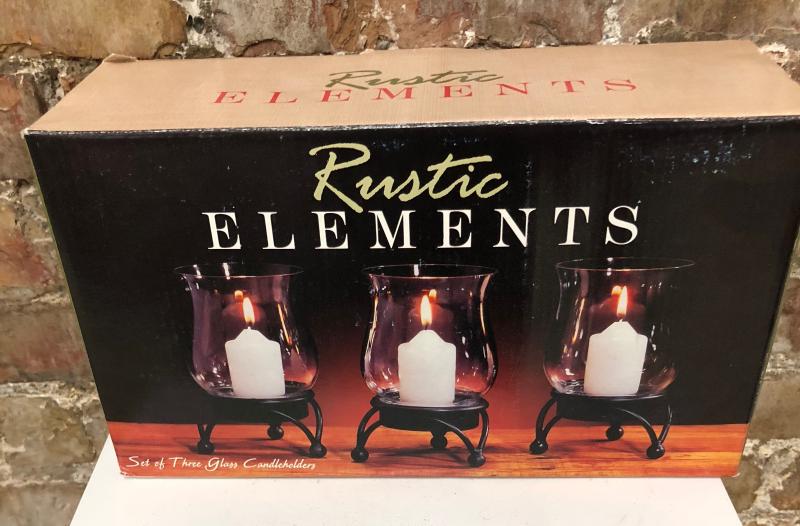 New condition on this set of three Glass Candleholders with iron rack from Rustic Elelments...