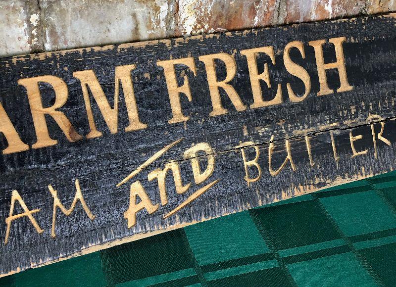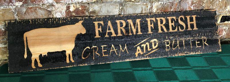 Here is a rustic style engraved wooden sign for 'Farm Fresh Cream & Butter'...30 x 7"...Good condition...