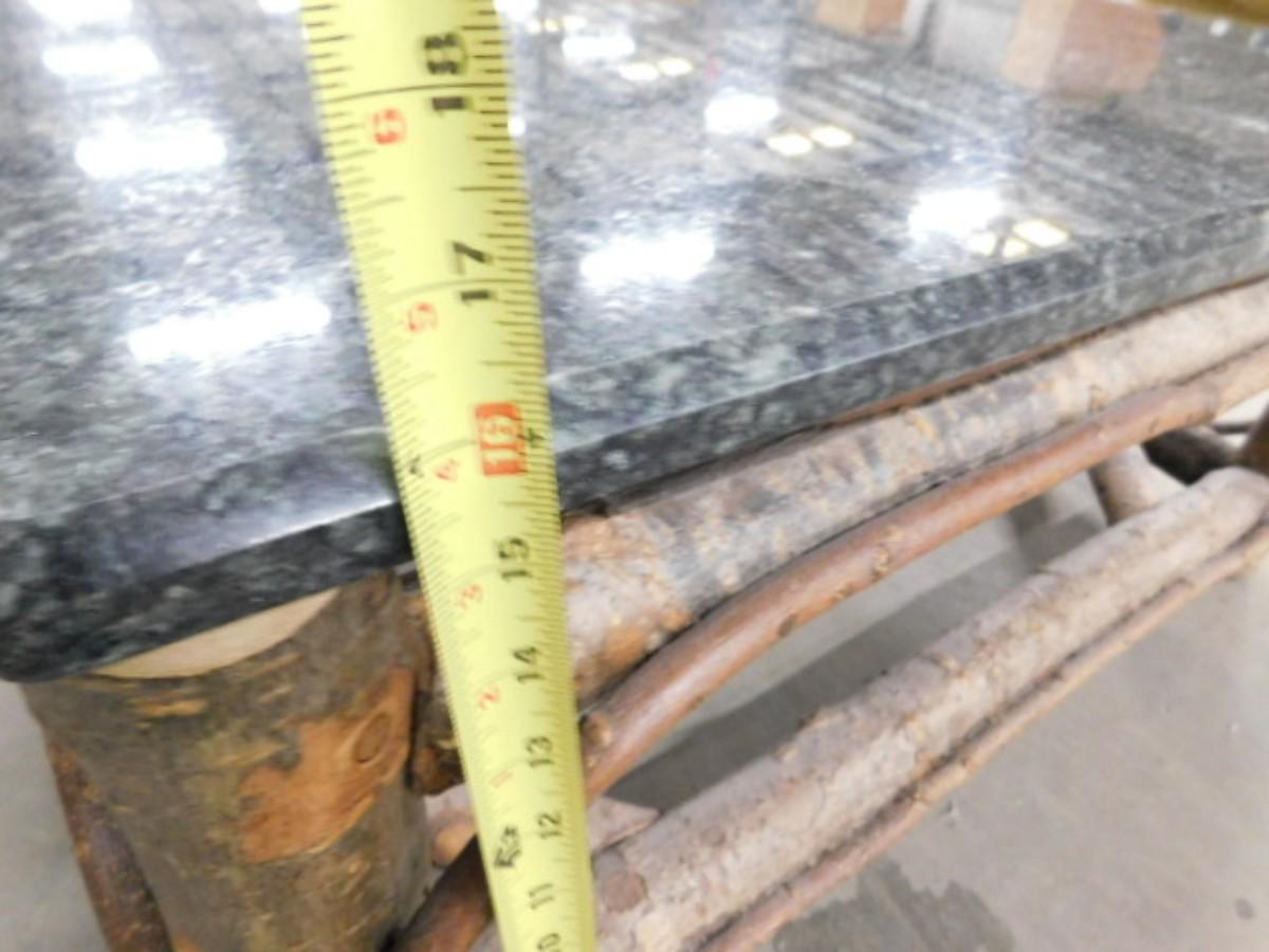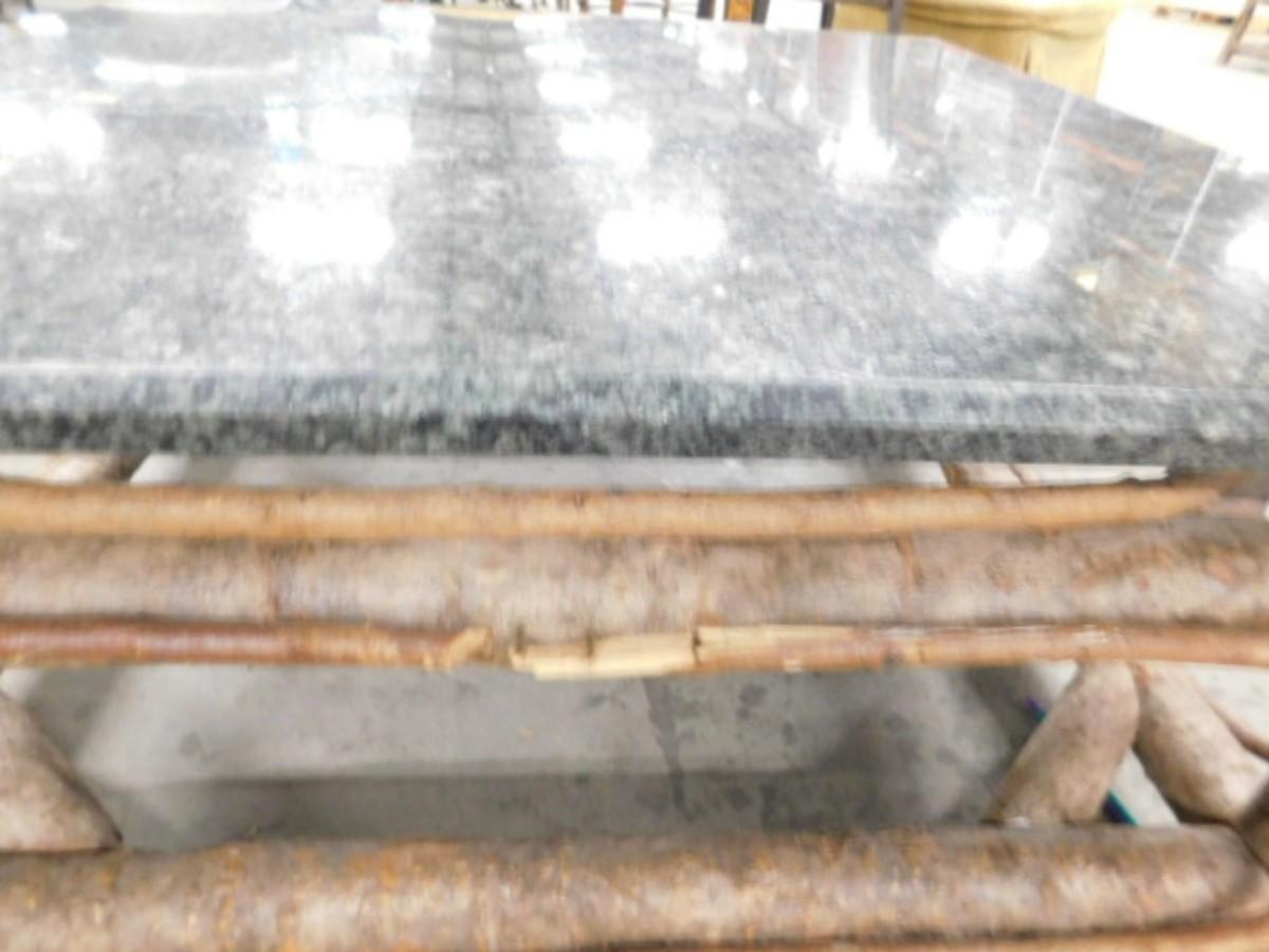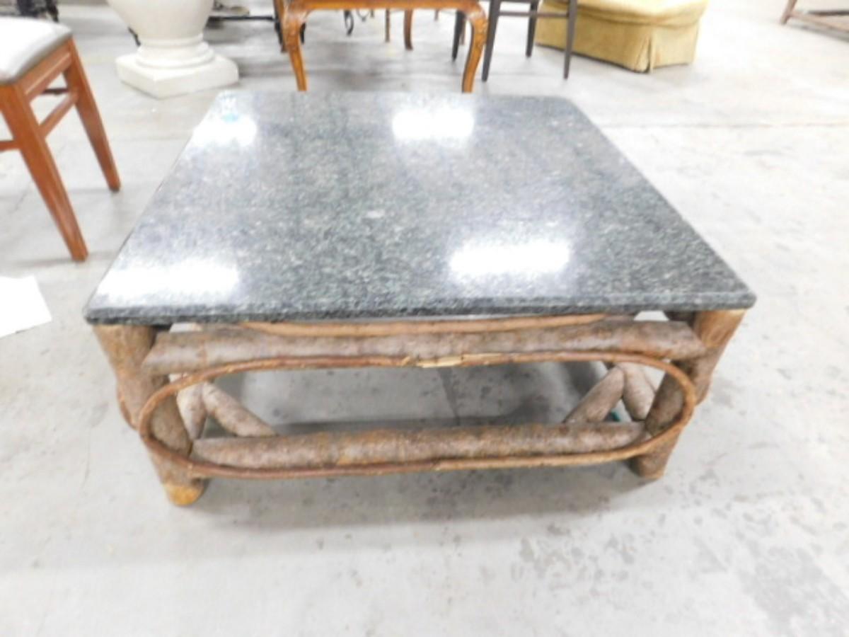 Green Mable Top Log Base Coffee Table Choice B. Table has a piece of the twig accent missing as shown. Expect some wear or scratches to finish. Shipping option available via freight or local mover at Buyer's expense. Buyer must have all shipping scheduled within the stated dates and times of pickup. Recommended local mover is Beaty Bros. Moving 828-201-2982