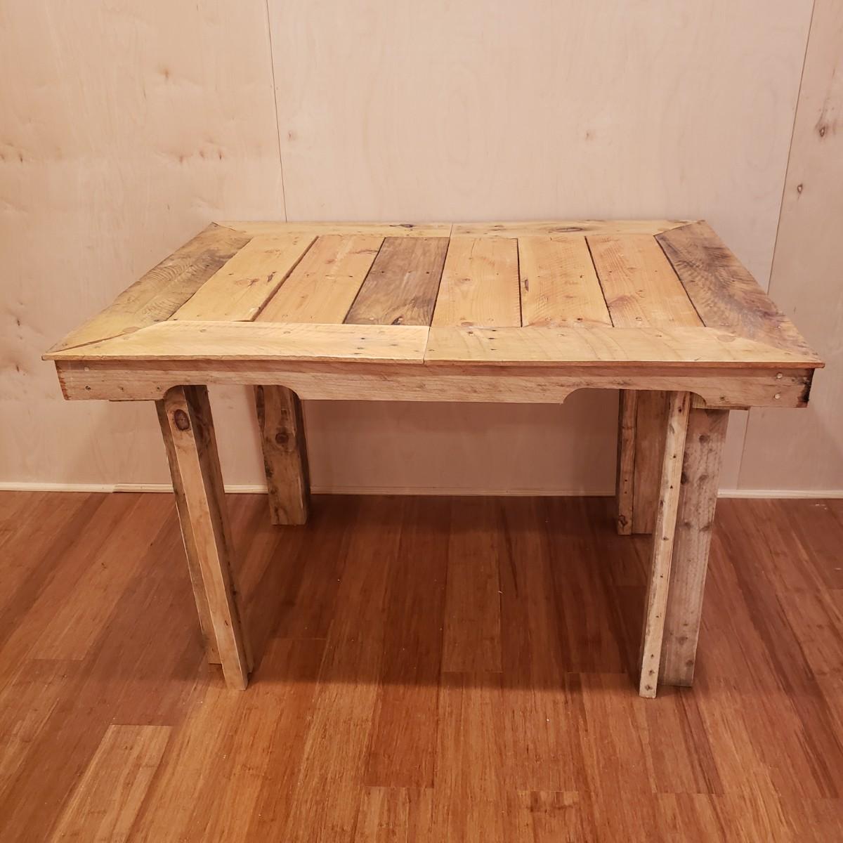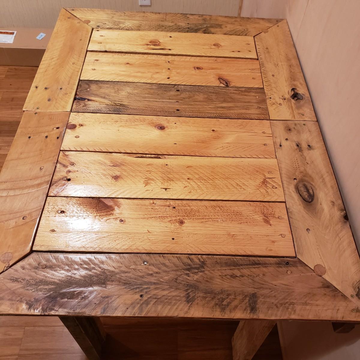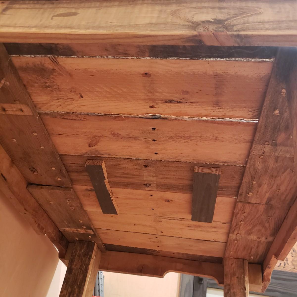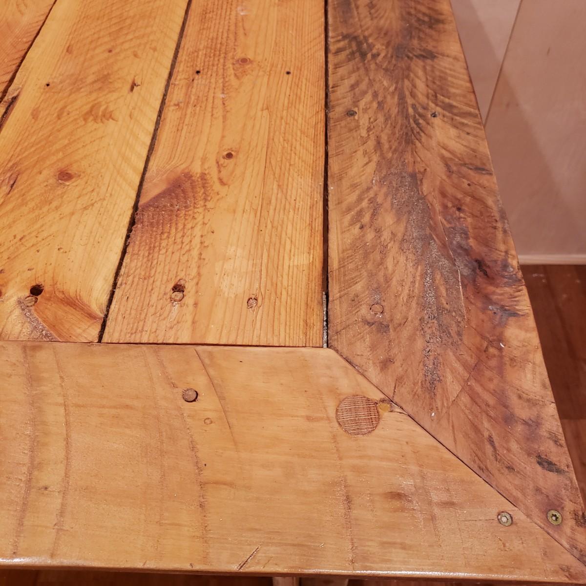 This rustic table measures 48" x 35.5" x 31"H. It appears to be a recycled pieces based on the underside. The table has a rough feel to it. The table is located in a walk out basement with an incline up to the street.