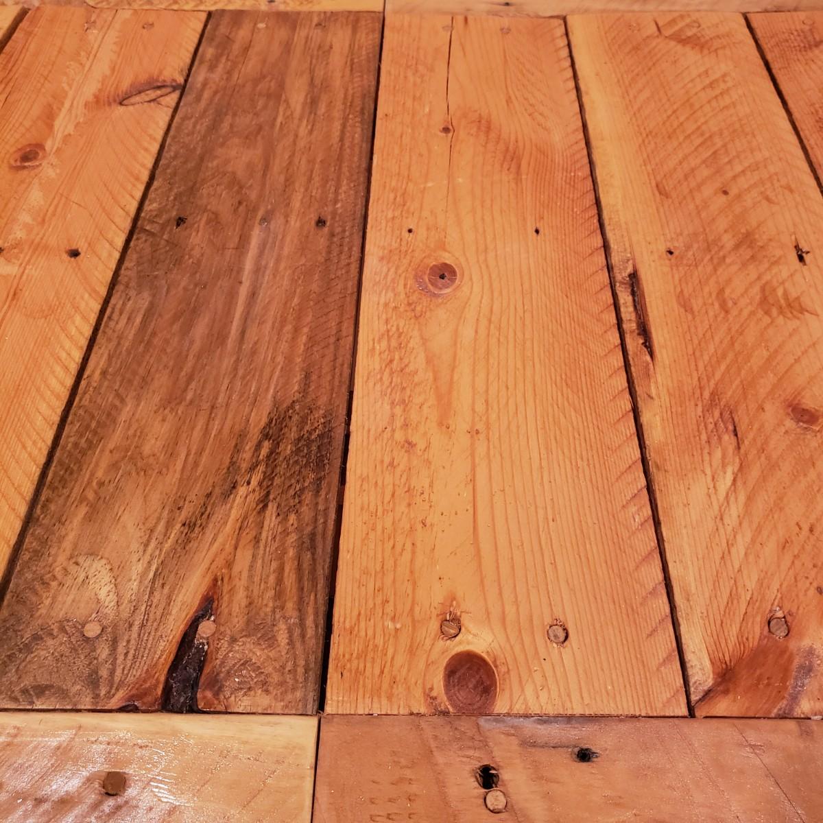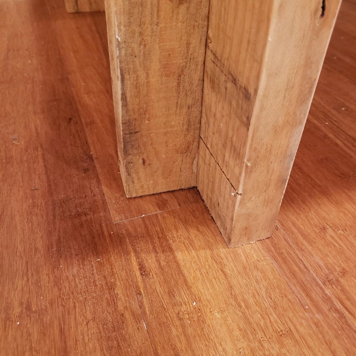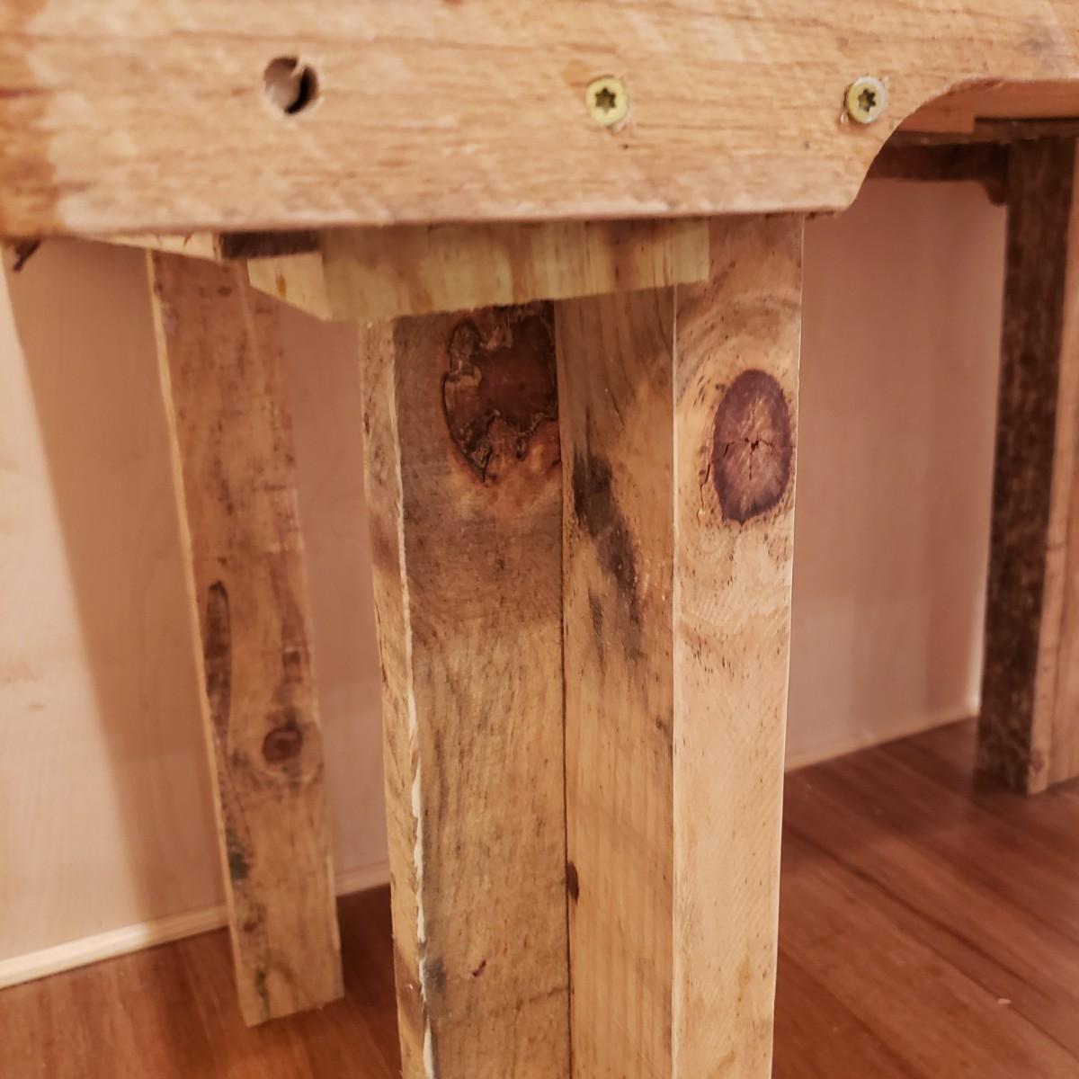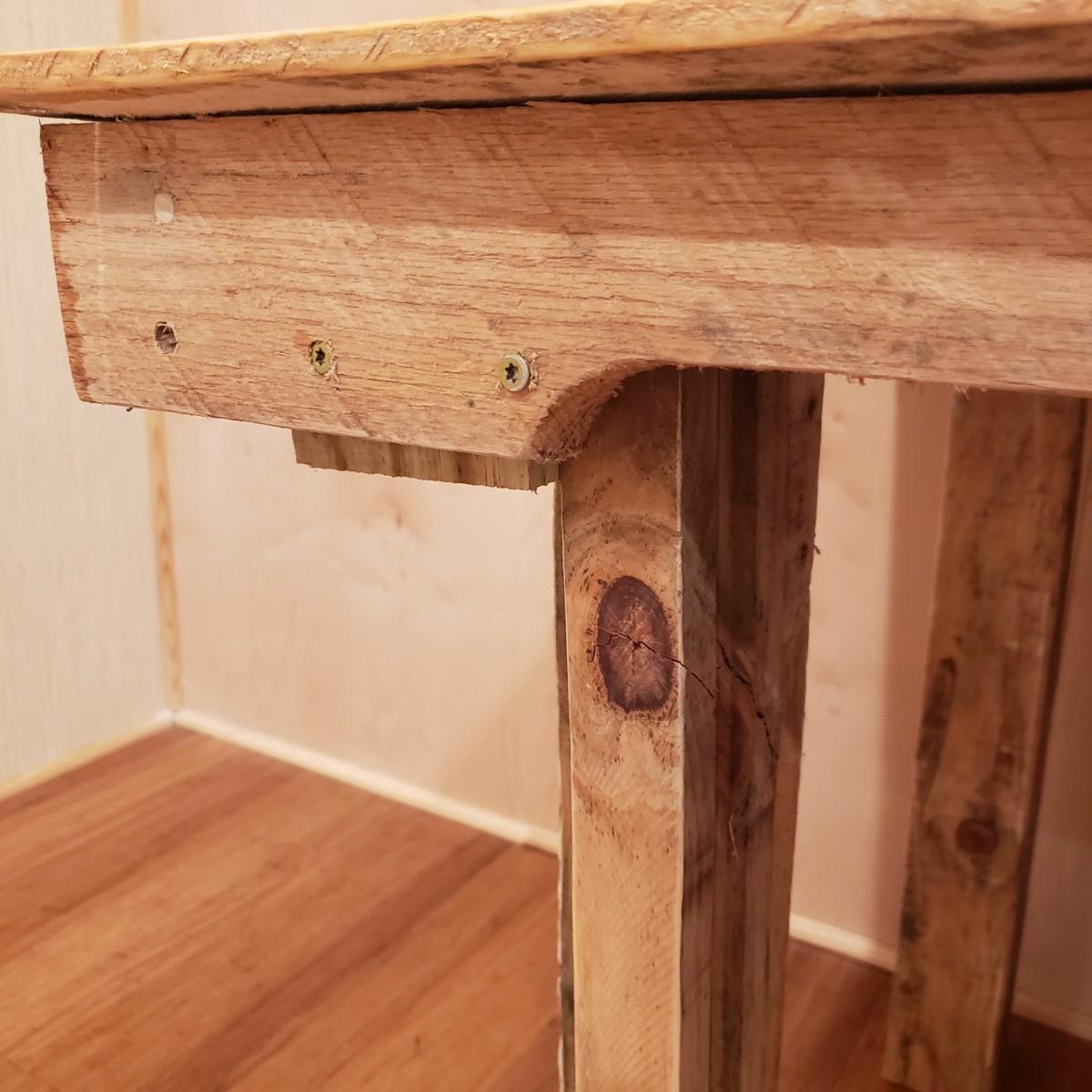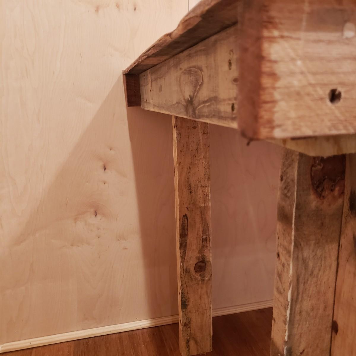This rustic table measures 48" x 35.5" x 31"H. It appears to be a recycled pieces based on the underside. The table has a rough feel to it. The table is located in a walk out basement with an incline up to the street.