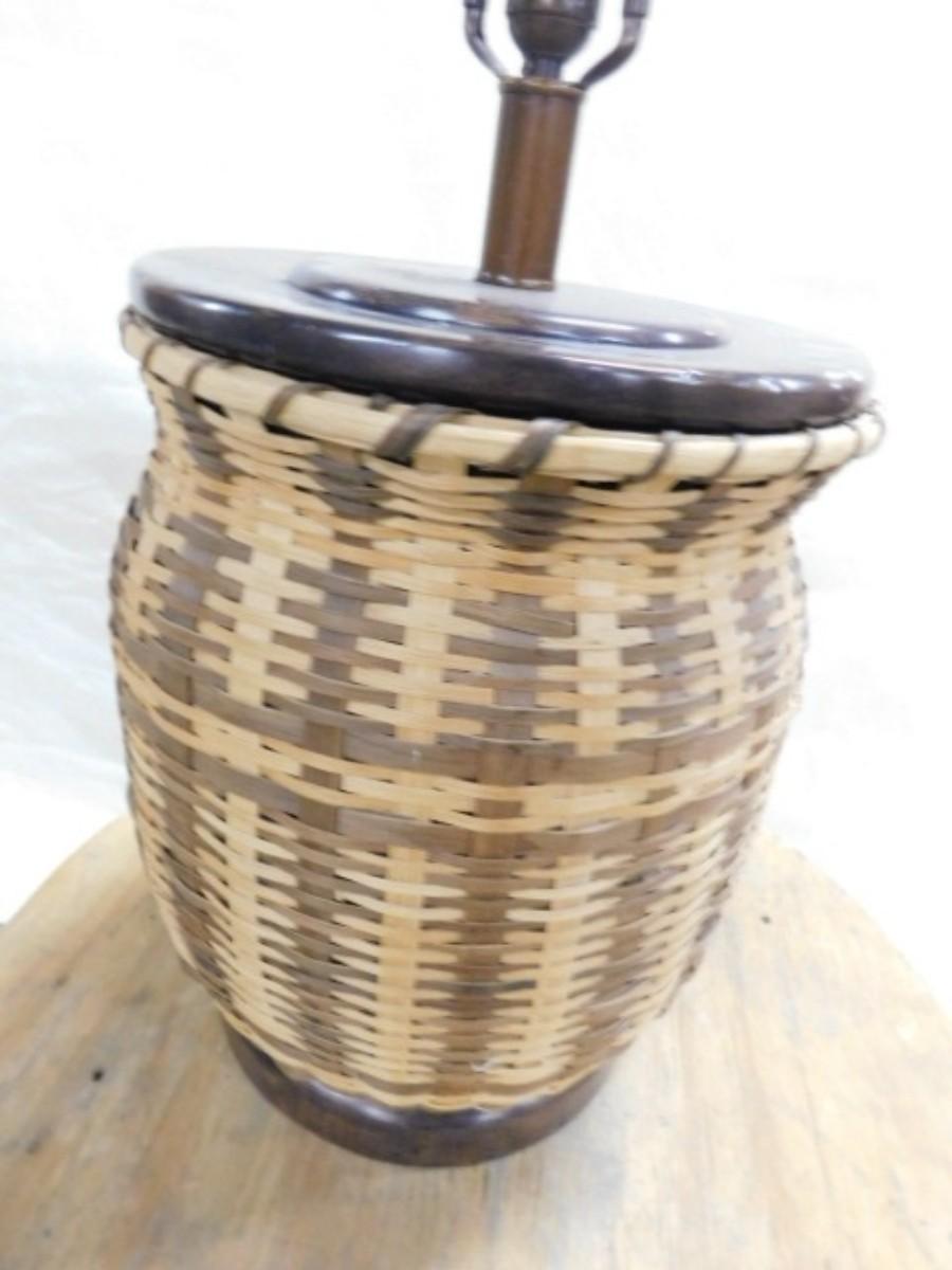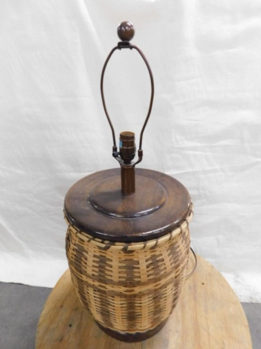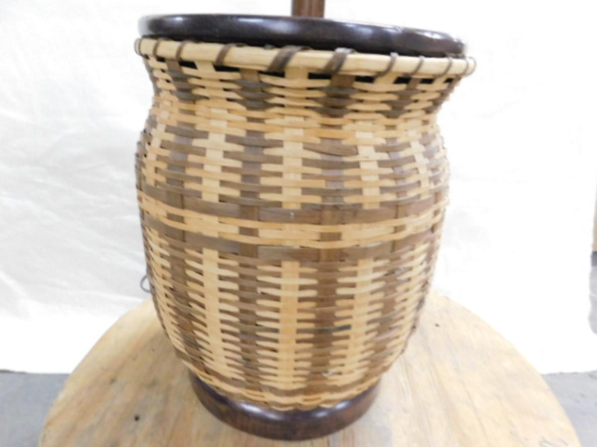 Rustic Hand-Woven Splint Wood Basket Lamp #1. Expect some wear or scratches to the finish. Shipping option available via freight or local mover at Buyer's expense. Buyer must have all shipping scheduled within the stated dates and times of pickup. Recommended local mover is Beaty Bros. Moving 828-201-2982