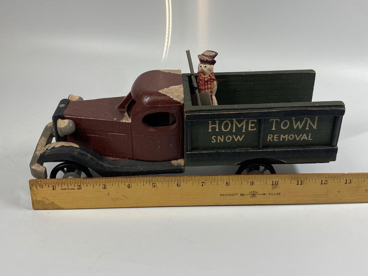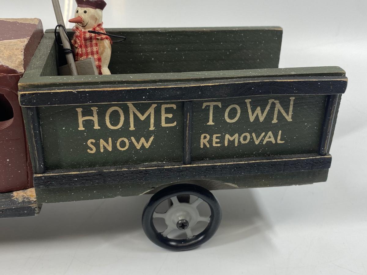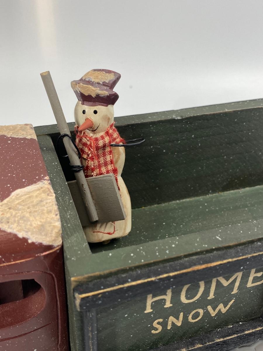 Rustic winter holiday seasonal decor truck and snowman figurine. Wood truck has Hometown Snow Removal written across the side. Snow man has a small peg on the bottom like he may have been on a base. Display nicely.