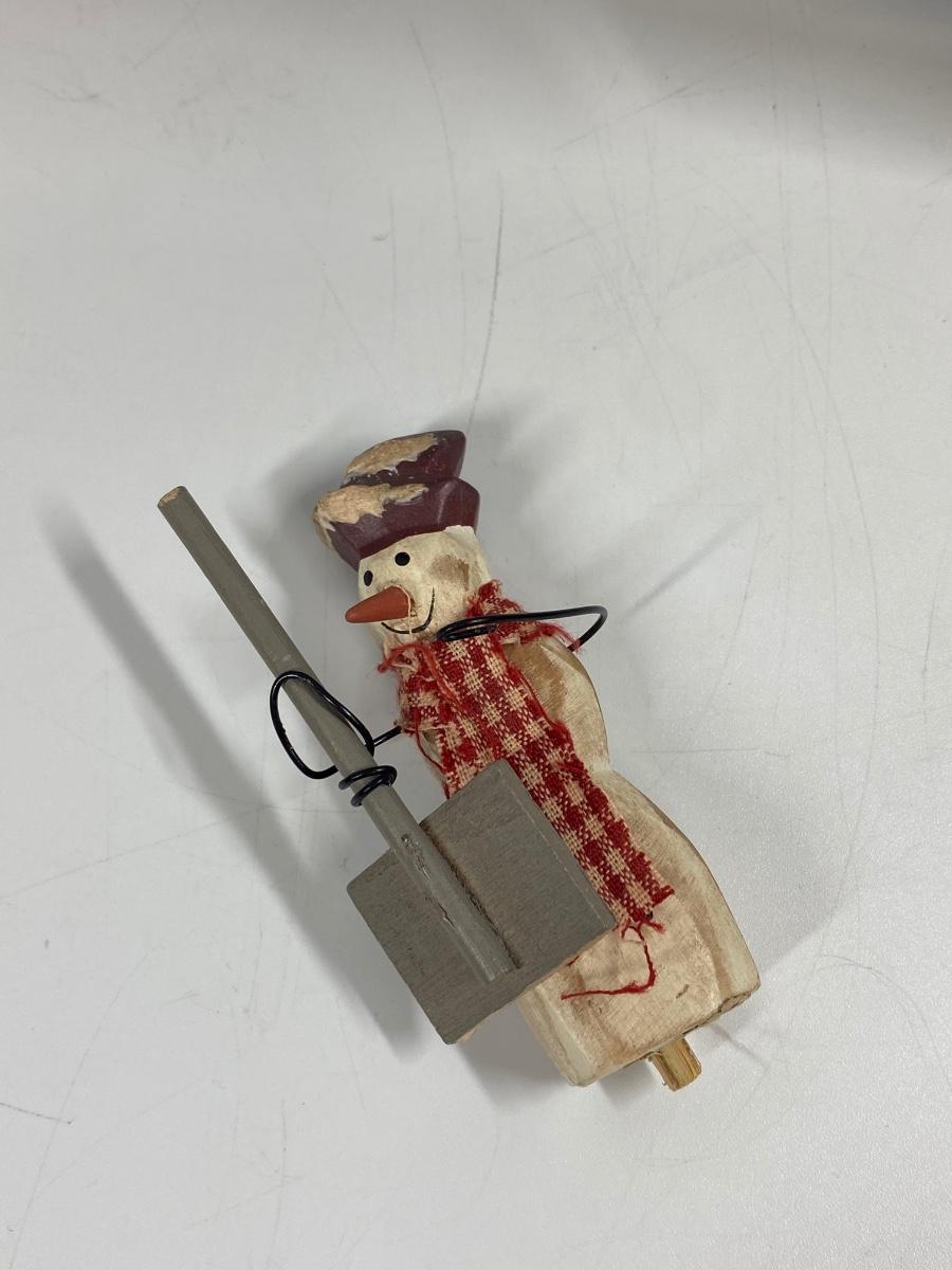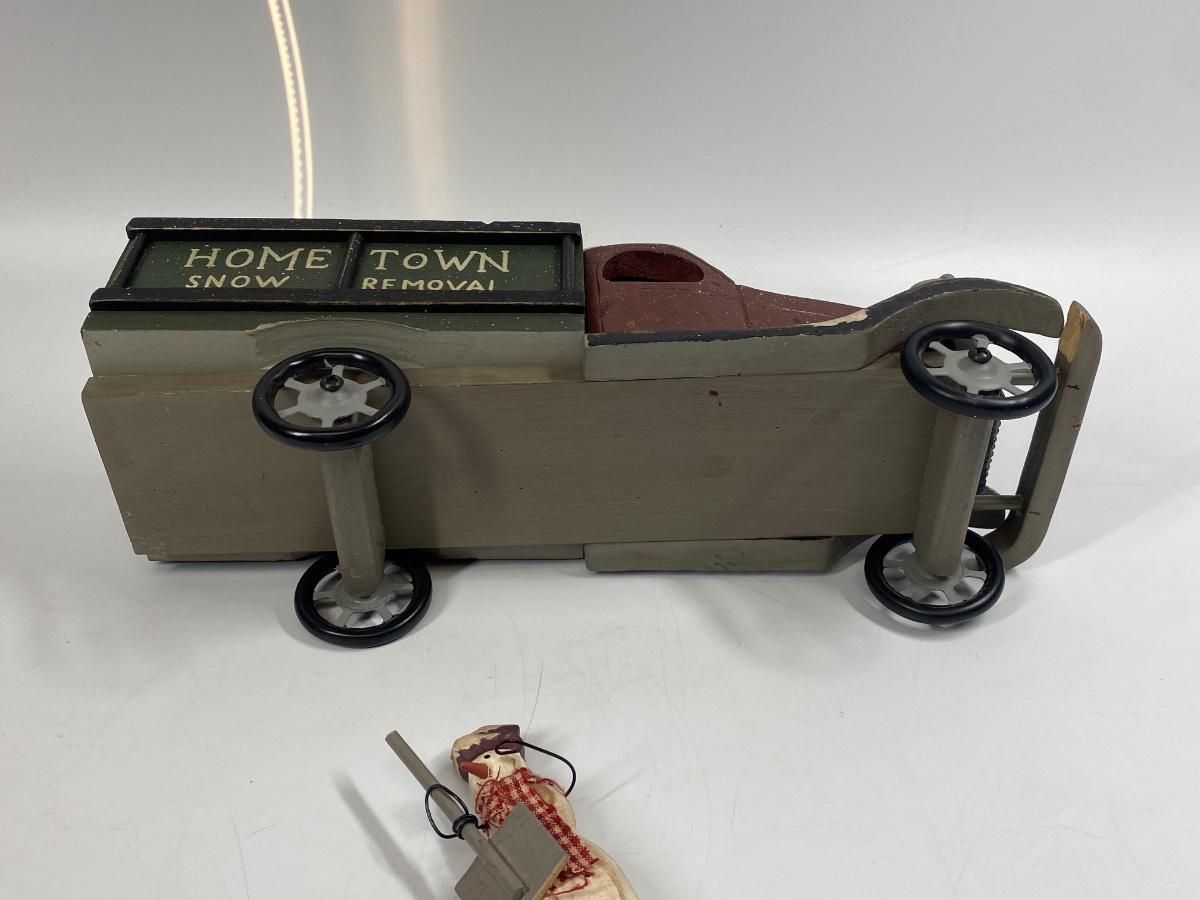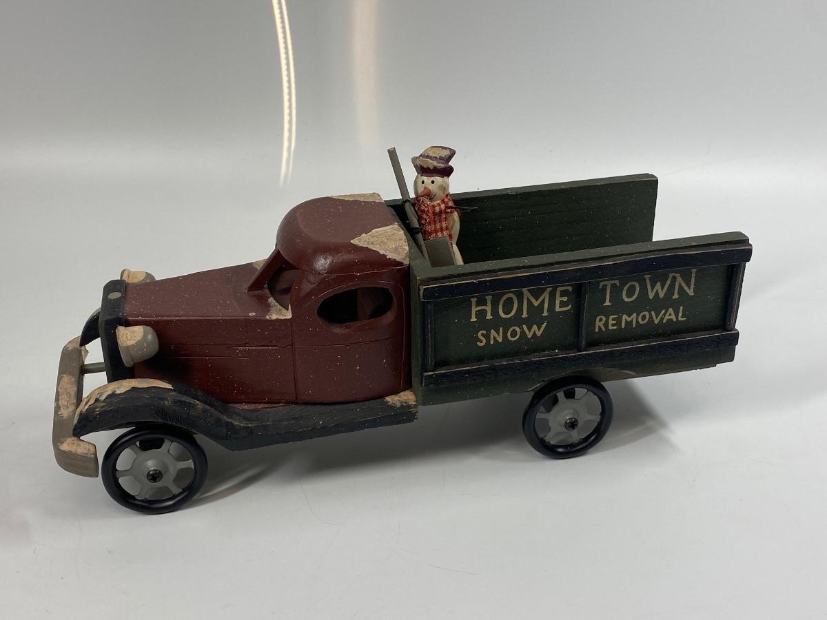 Rustic winter holiday seasonal decor truck and snowman figurine. Wood truck has Hometown Snow Removal written across the side. Snow man has a small peg on the bottom like he may have been on a base. Display nicely.