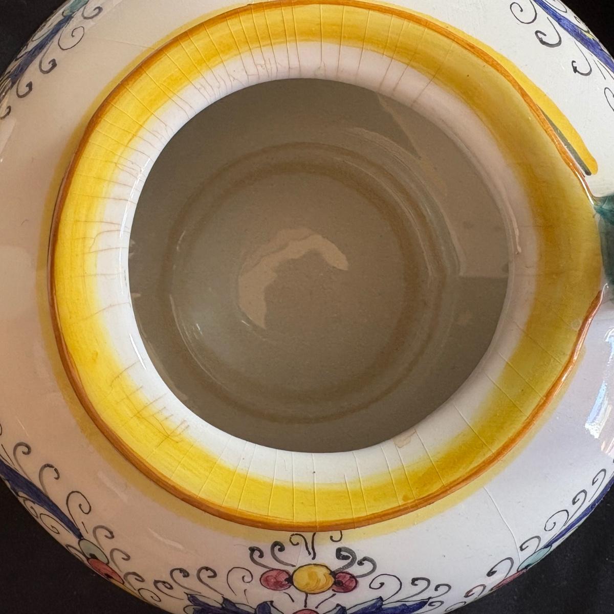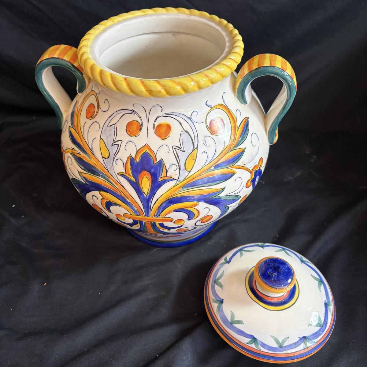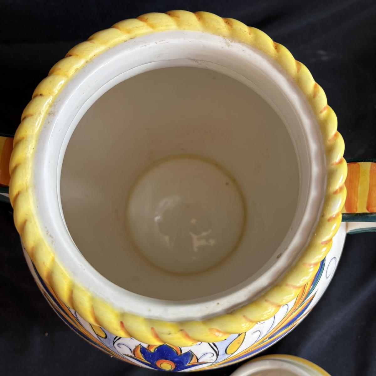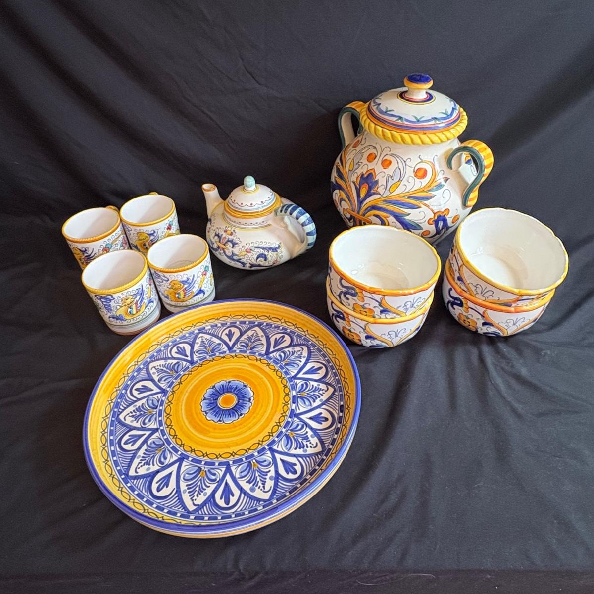 Cheerful pottery pieces painted in an Italian style. Tray is 13”D x 1” deep). Urn is 11” at widest and 13.5”H w/lid. Mugs and bowls have small chips. Shipping available.