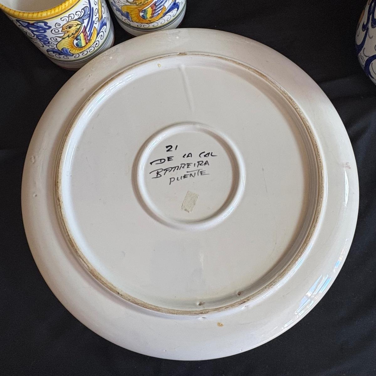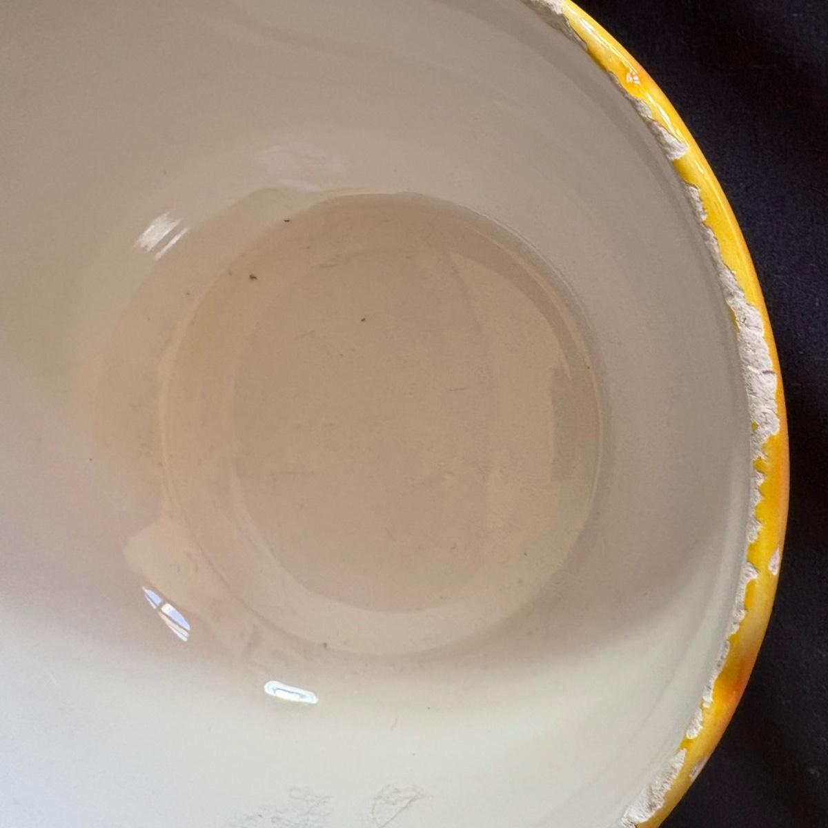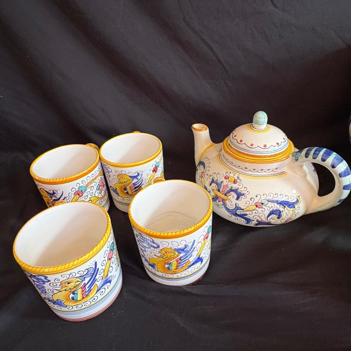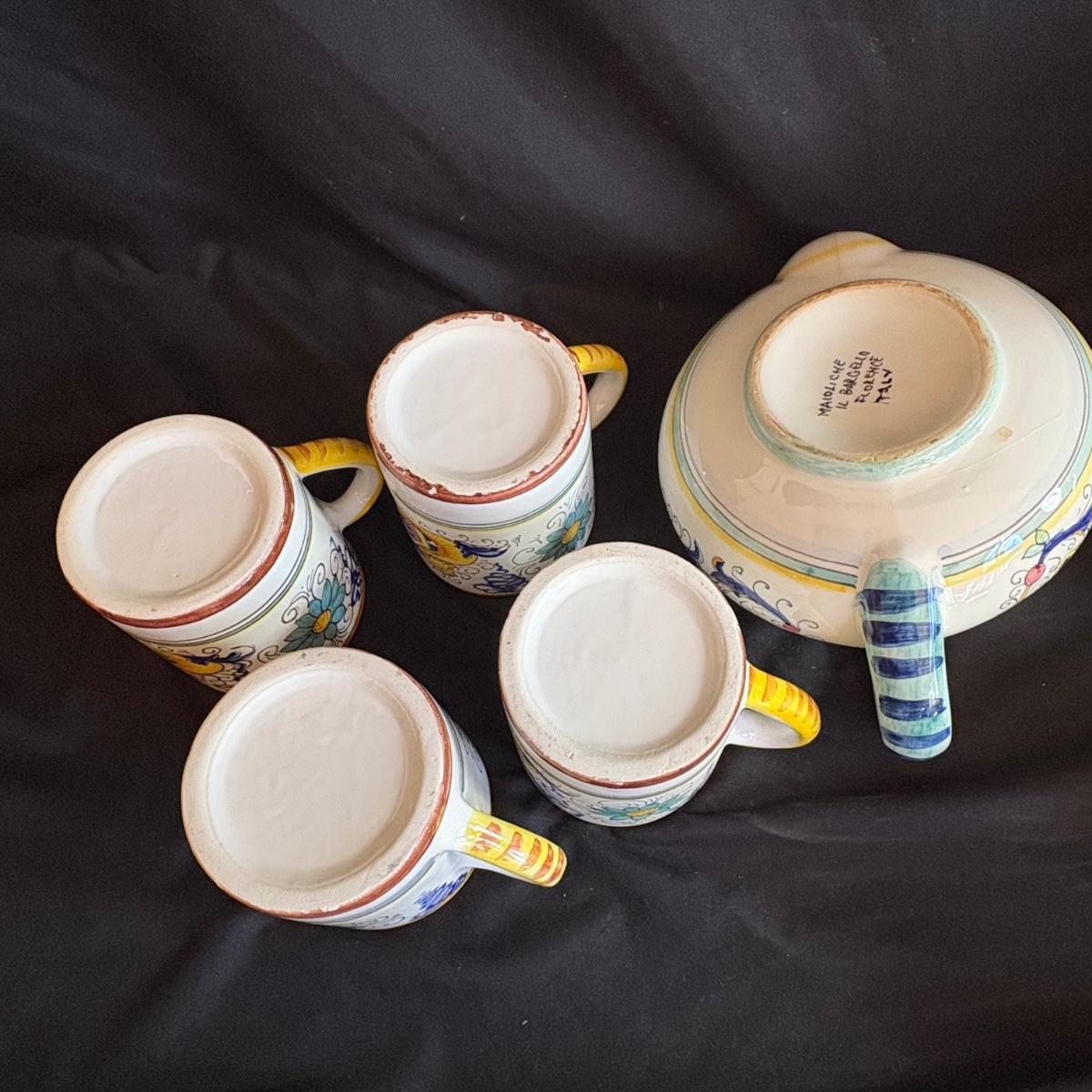 Cheerful pottery pieces painted in an Italian style. Tray is 13”D x 1” deep). Urn is 11” at widest and 13.5”H w/lid. Mugs and bowls have small chips. Shipping available.