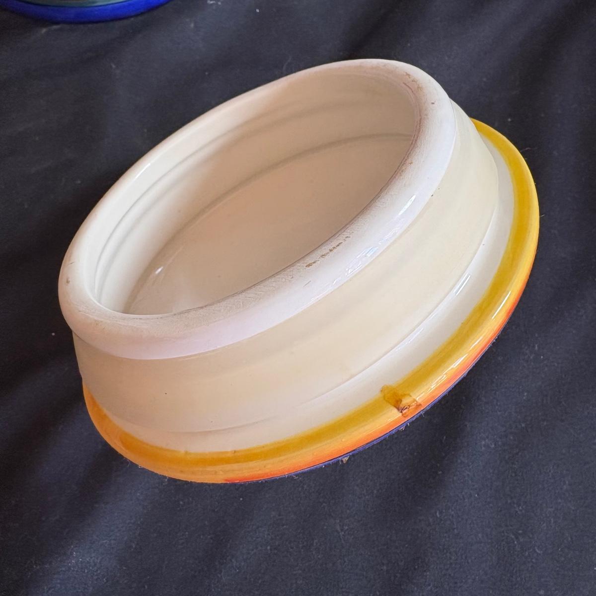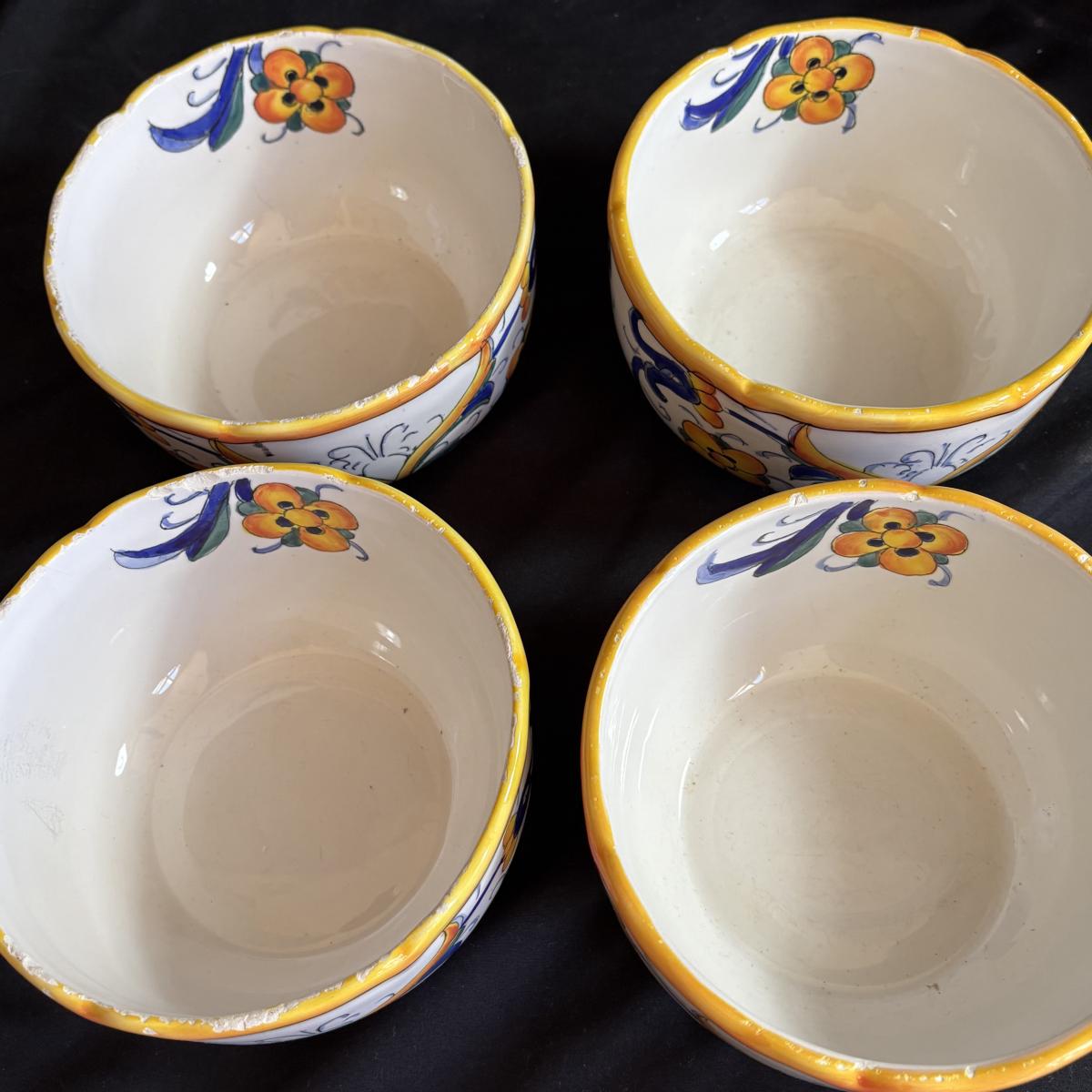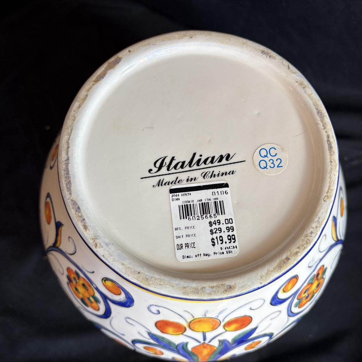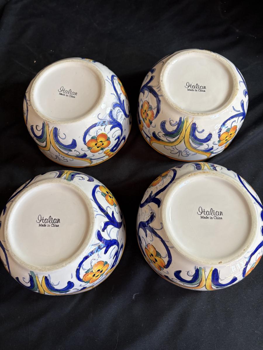 Cheerful pottery pieces painted in an Italian style. Tray is 13”D x 1” deep). Urn is 11” at widest and 13.5”H w/lid. Mugs and bowls have small chips. Shipping available.