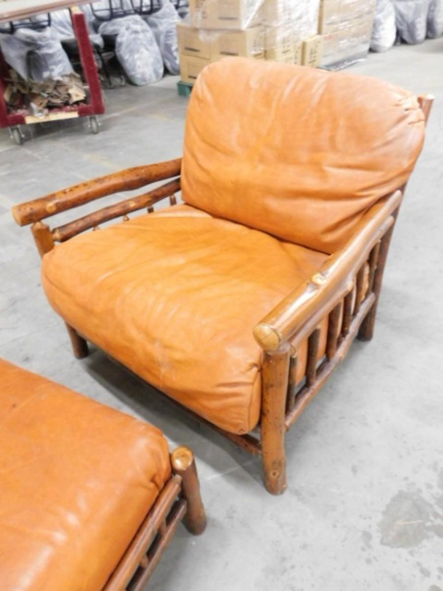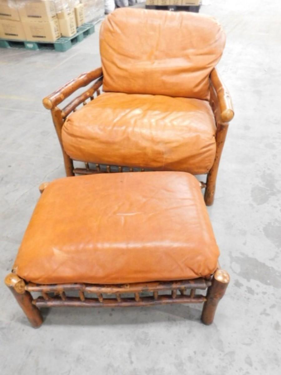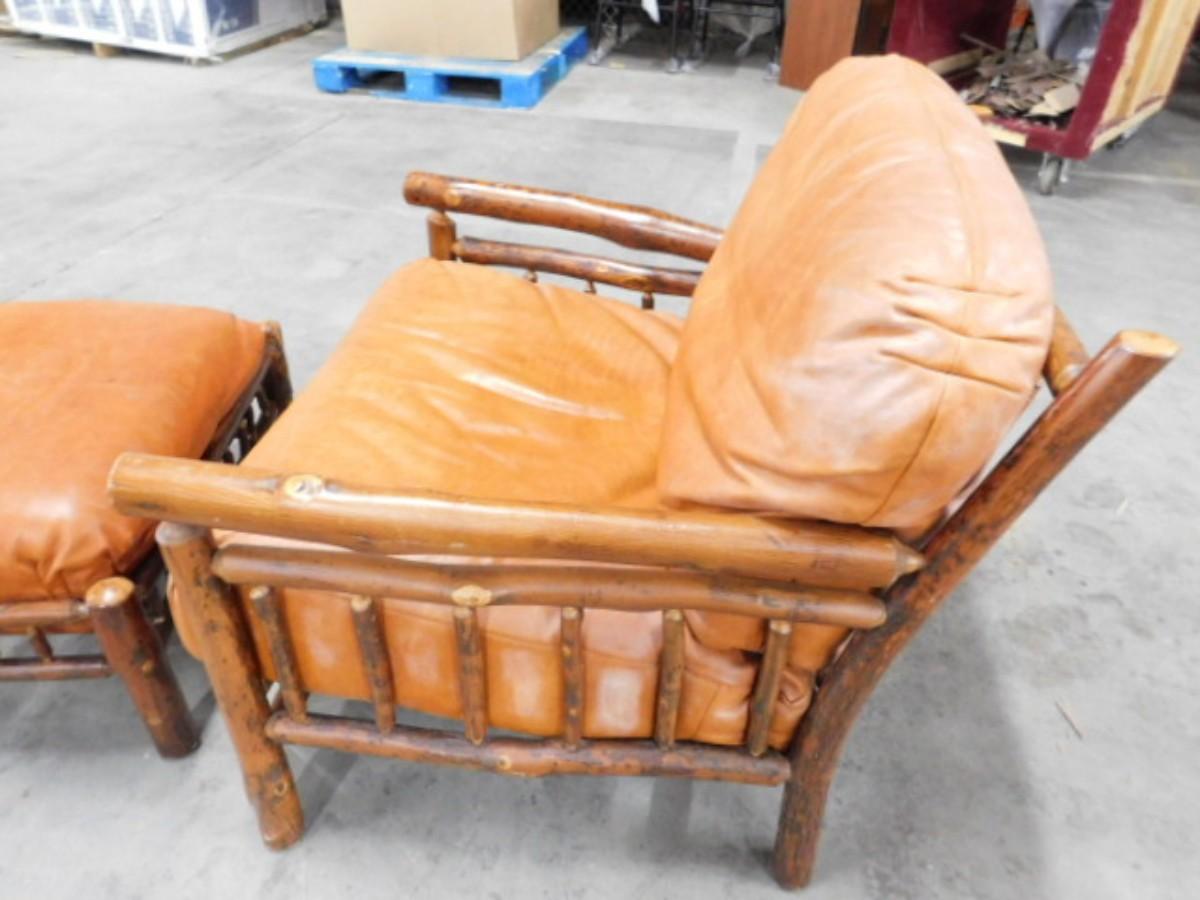 Rustic Leather Cushion Log Frame Chair with Matching Ottoman La Lune Collection Expect some wear or scratches to finish. Shipping option available via freight or local mover at Buyer's expense. Buyer must have all shipping scheduled within the stated dates and times of pickup. Recommended local mover is Beaty Bros. Moving 828-201-2982