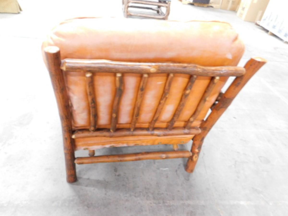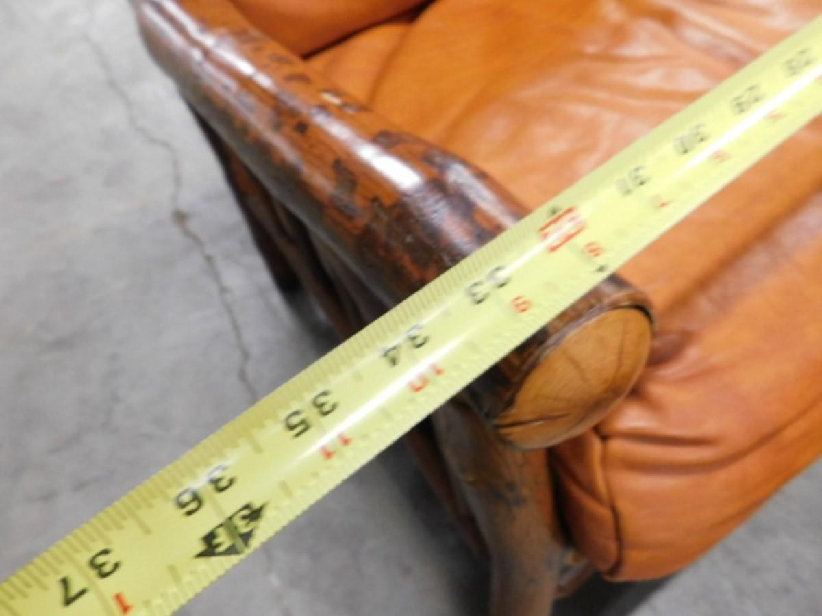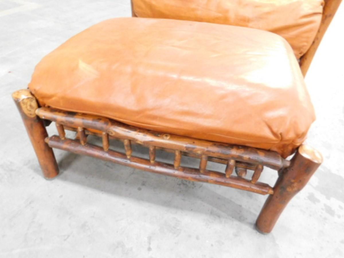 Rustic Leather Cushion Log Frame Chair with Matching Ottoman La Lune Collection Expect some wear or scratches to finish. Shipping option available via freight or local mover at Buyer's expense. Buyer must have all shipping scheduled within the stated dates and times of pickup. Recommended local mover is Beaty Bros. Moving 828-201-2982