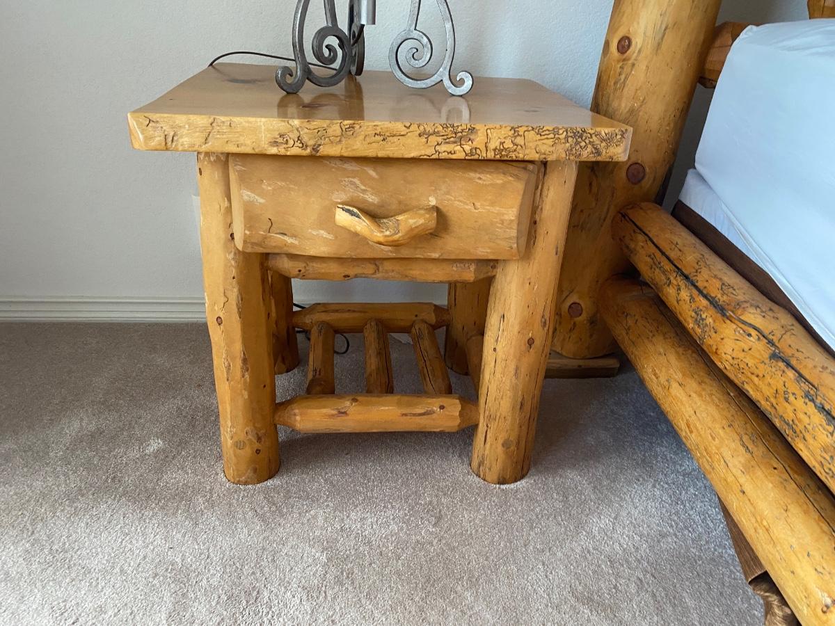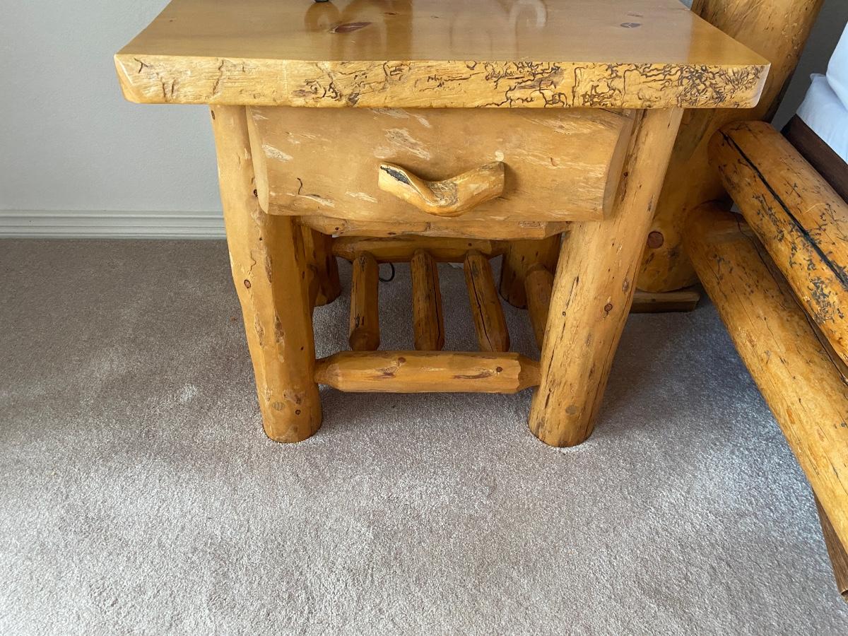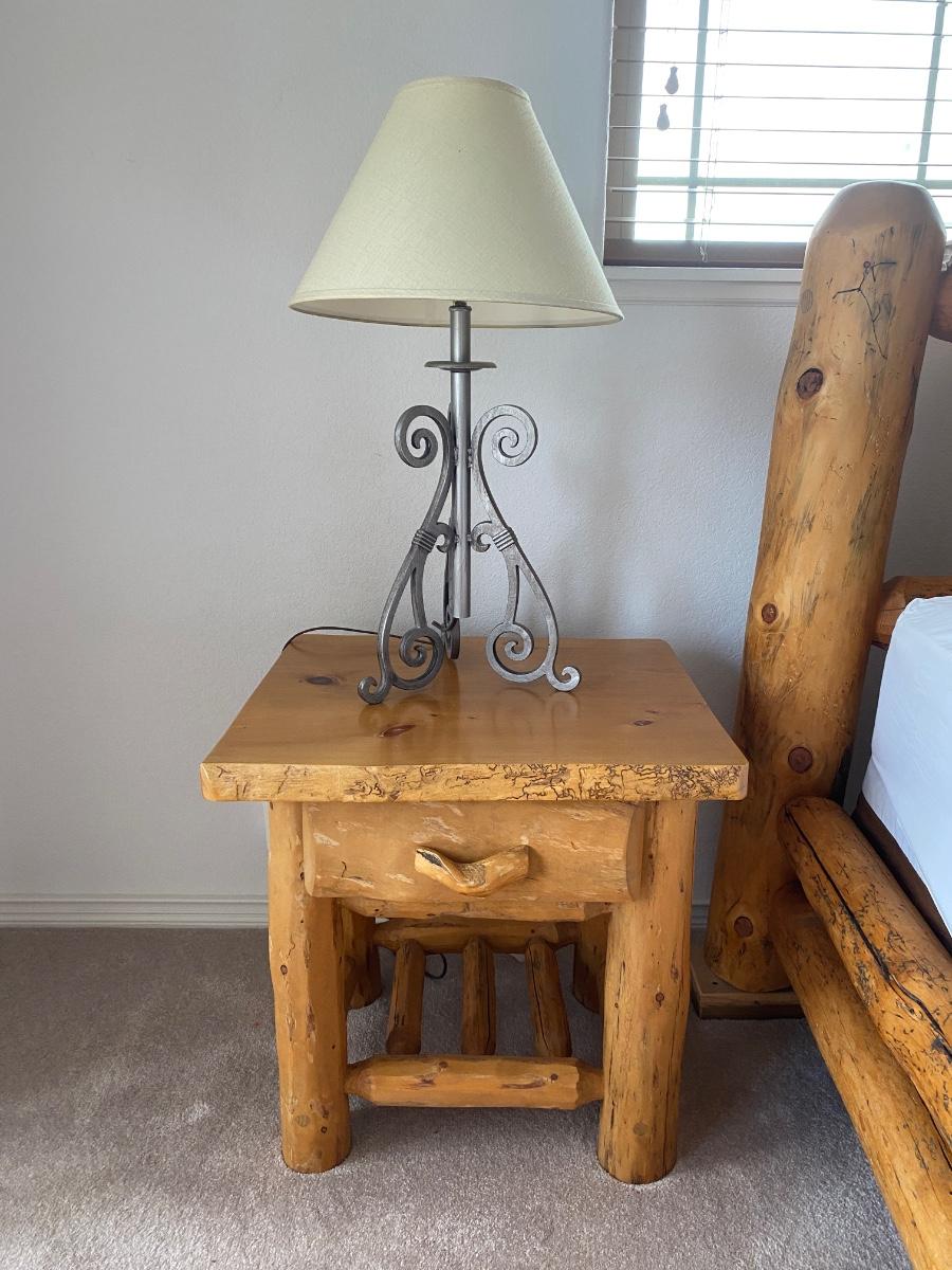 PINE LOG NIGHT STAND WITH 1 DRAWER AND IRON BASE LAMP