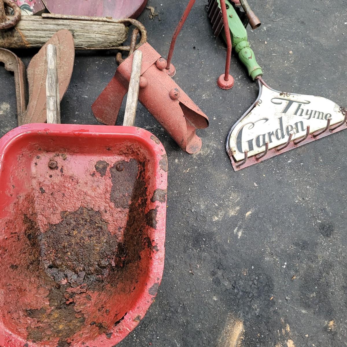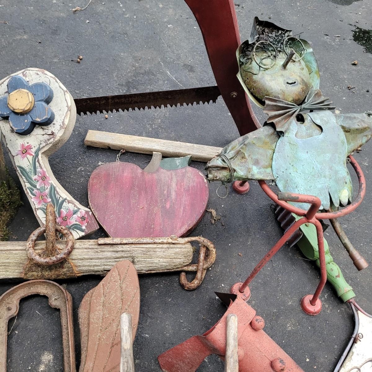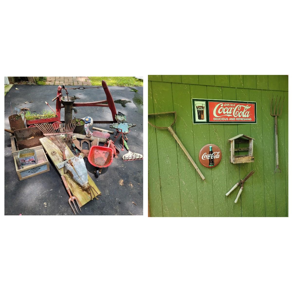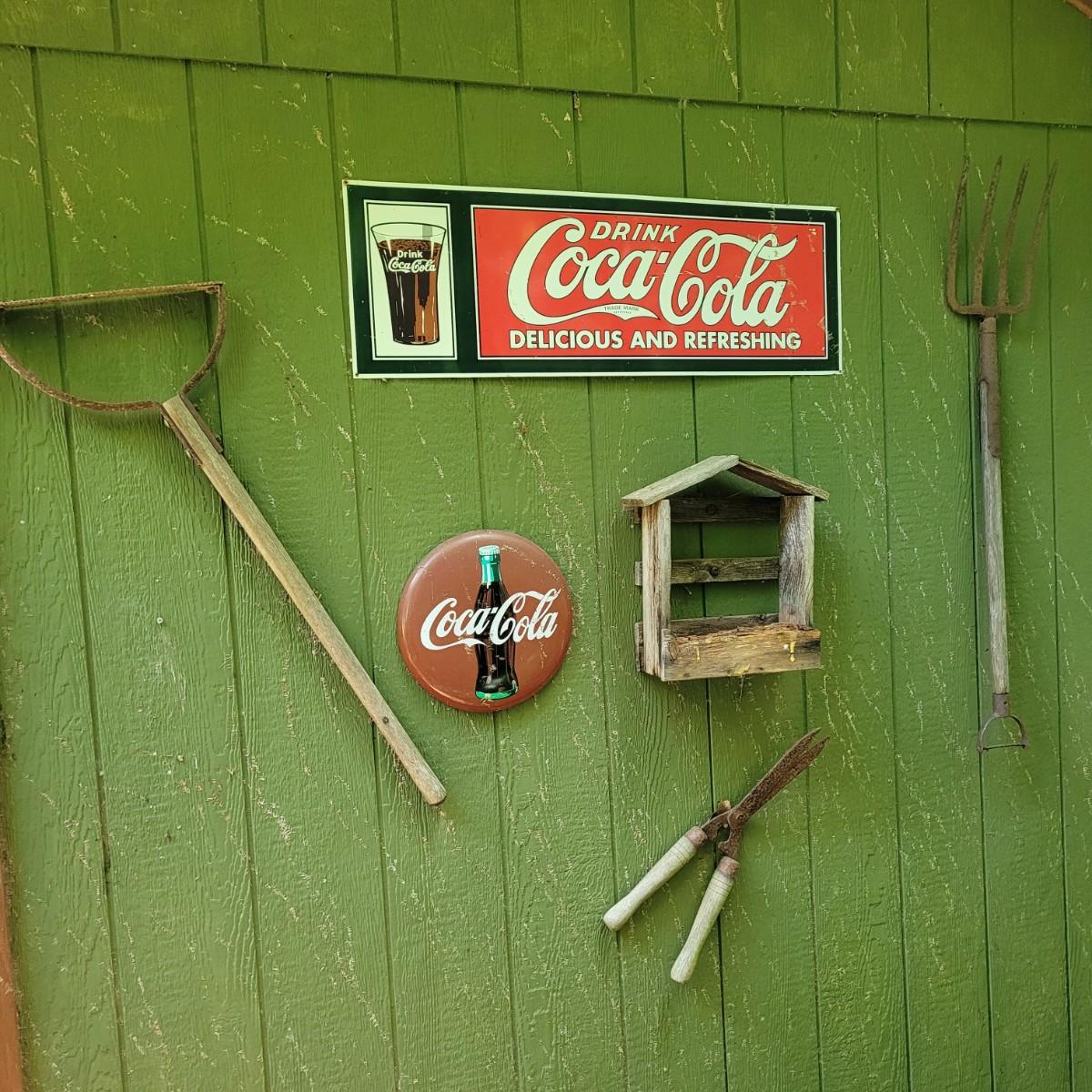This lot includes a variety of metal and wood items for decorating the yard or shed. Items include antique yard tools, signs, and miniature yard decorations. See photos for individual items. Rectangular Coca Cola sign measures 36” x 12”H.