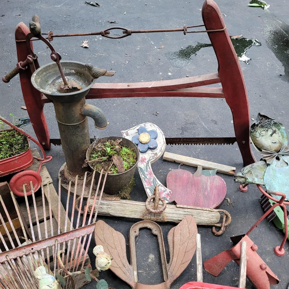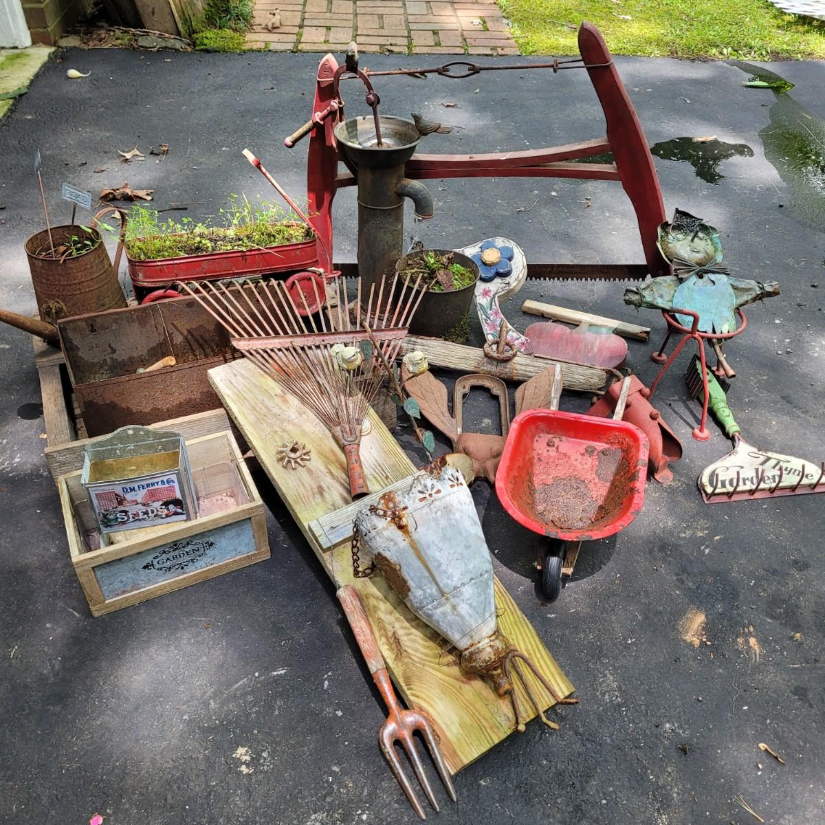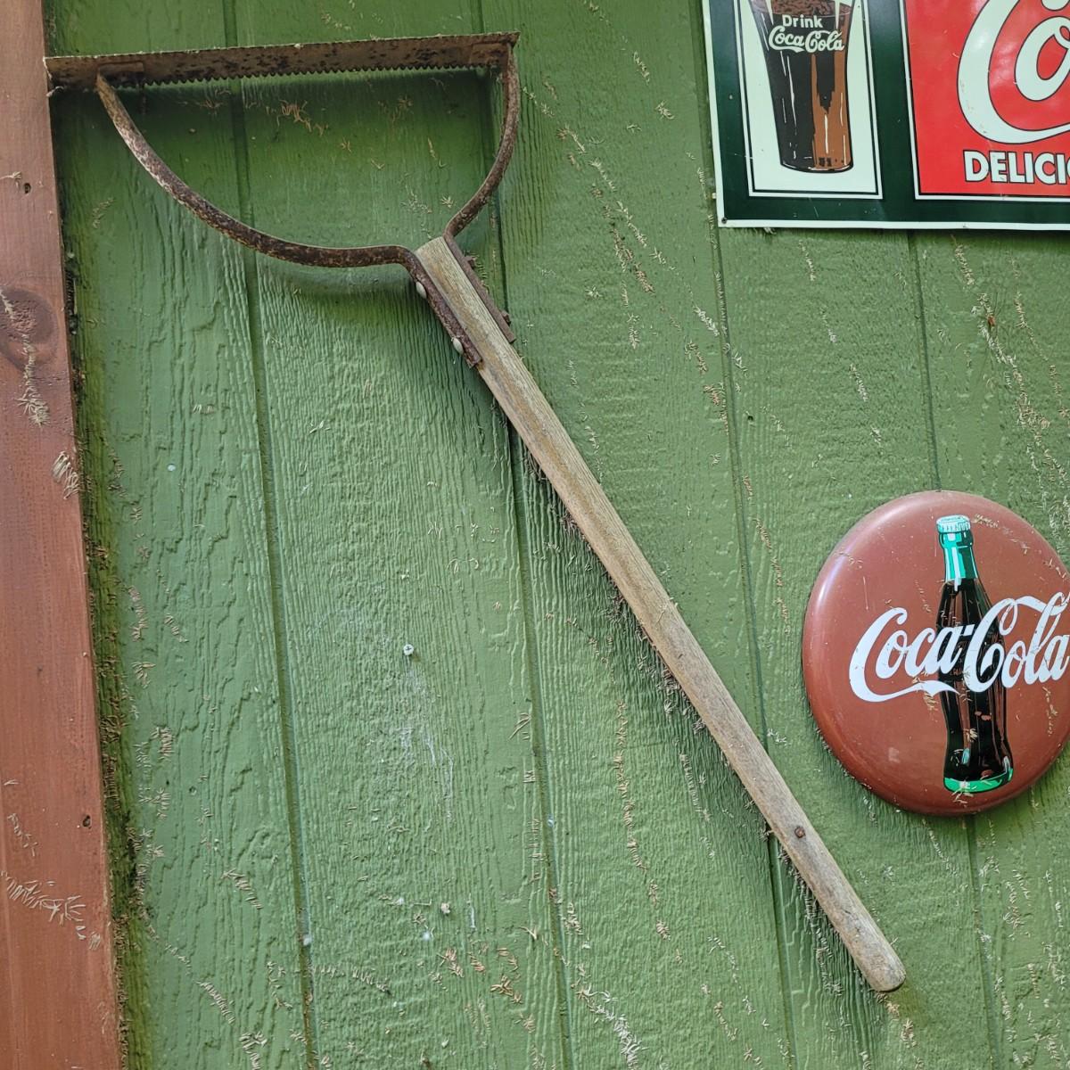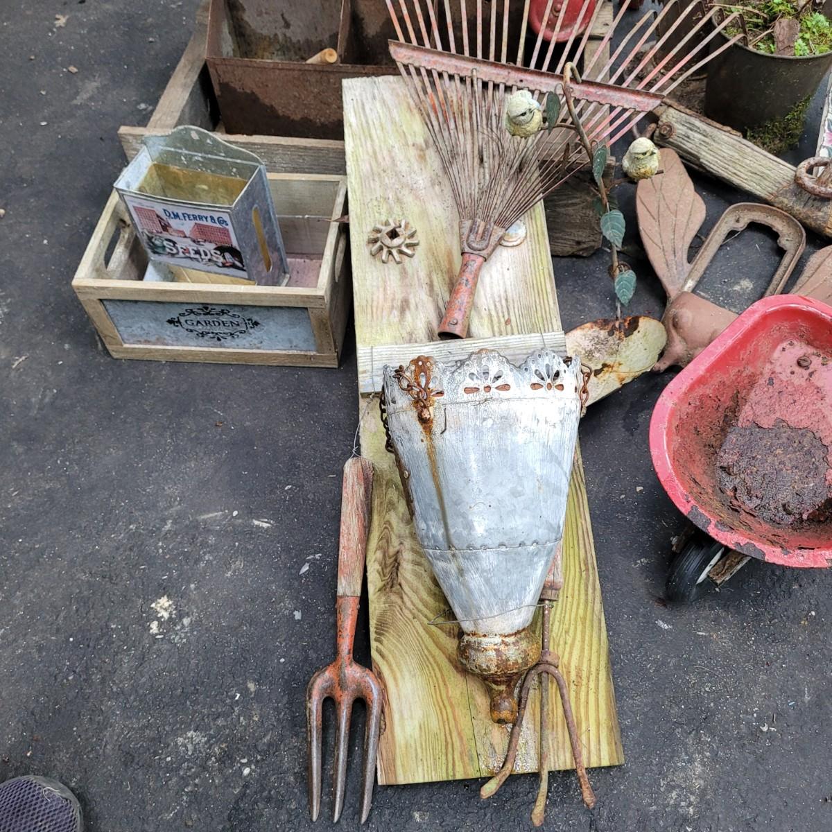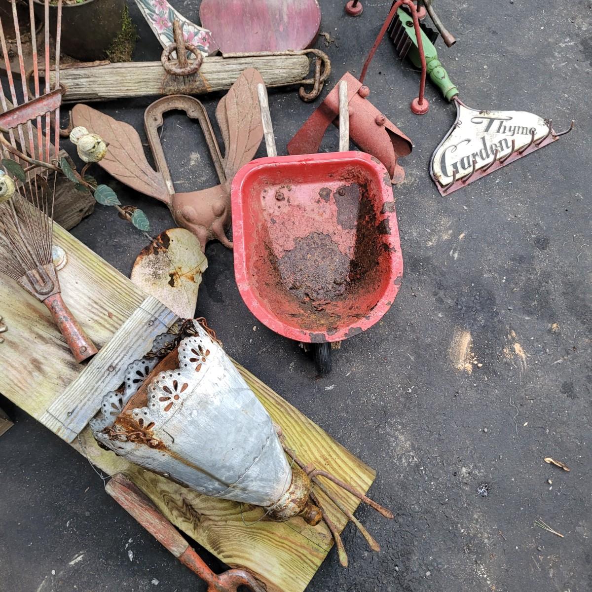 This lot includes a variety of metal and wood items for decorating the yard or shed. Items include antique yard tools, signs, and miniature yard decorations. See photos for individual items. Rectangular Coca Cola sign measures 36” x 12”H.