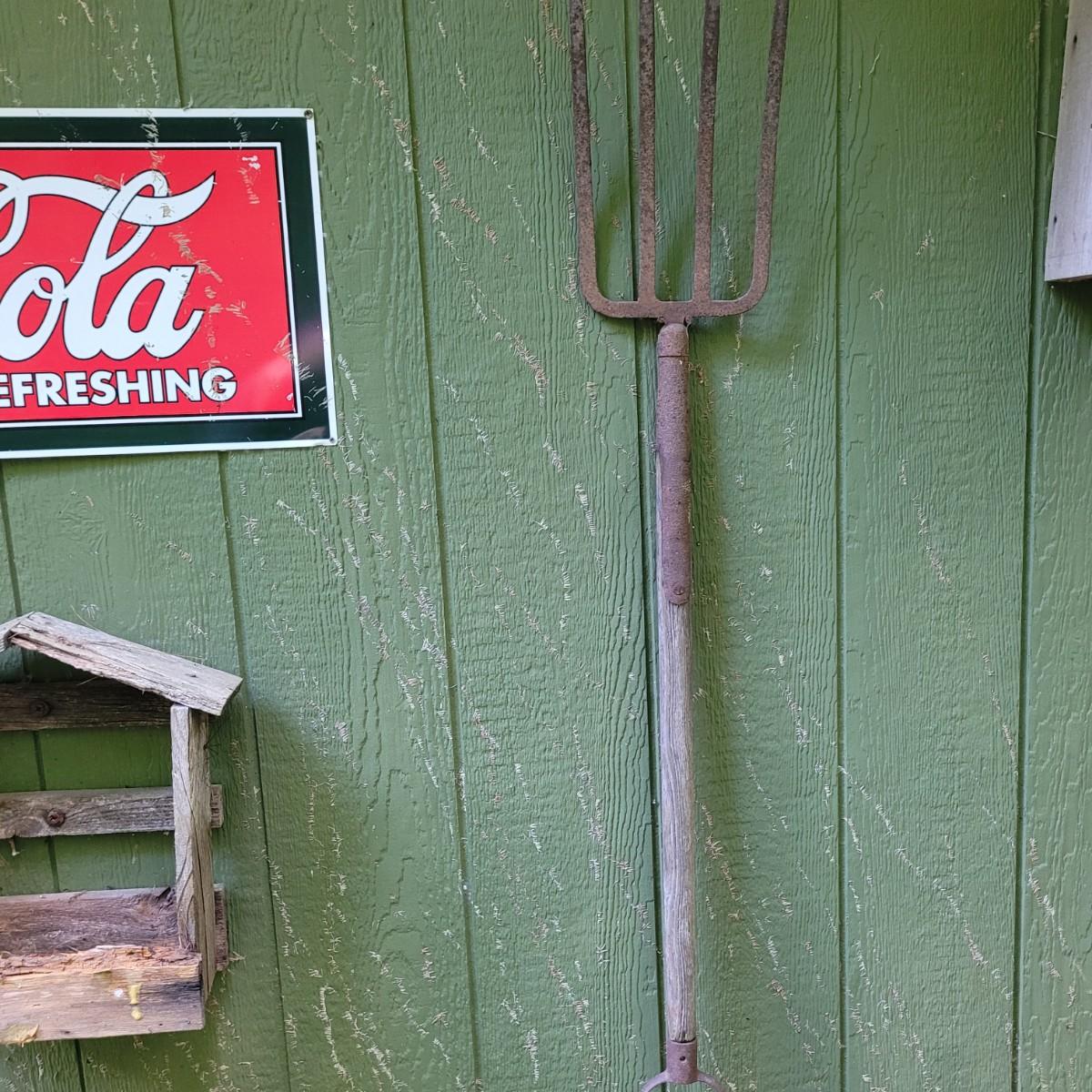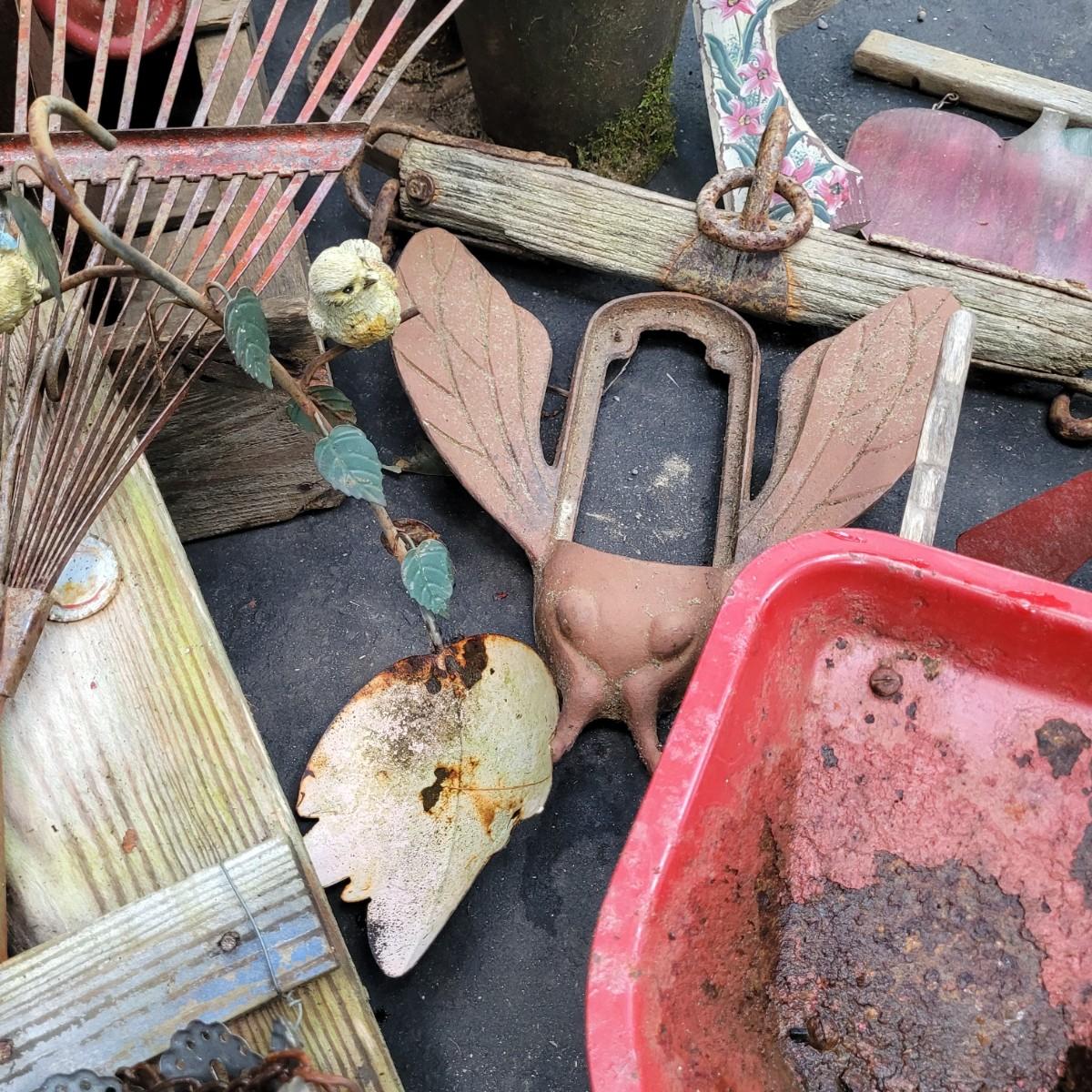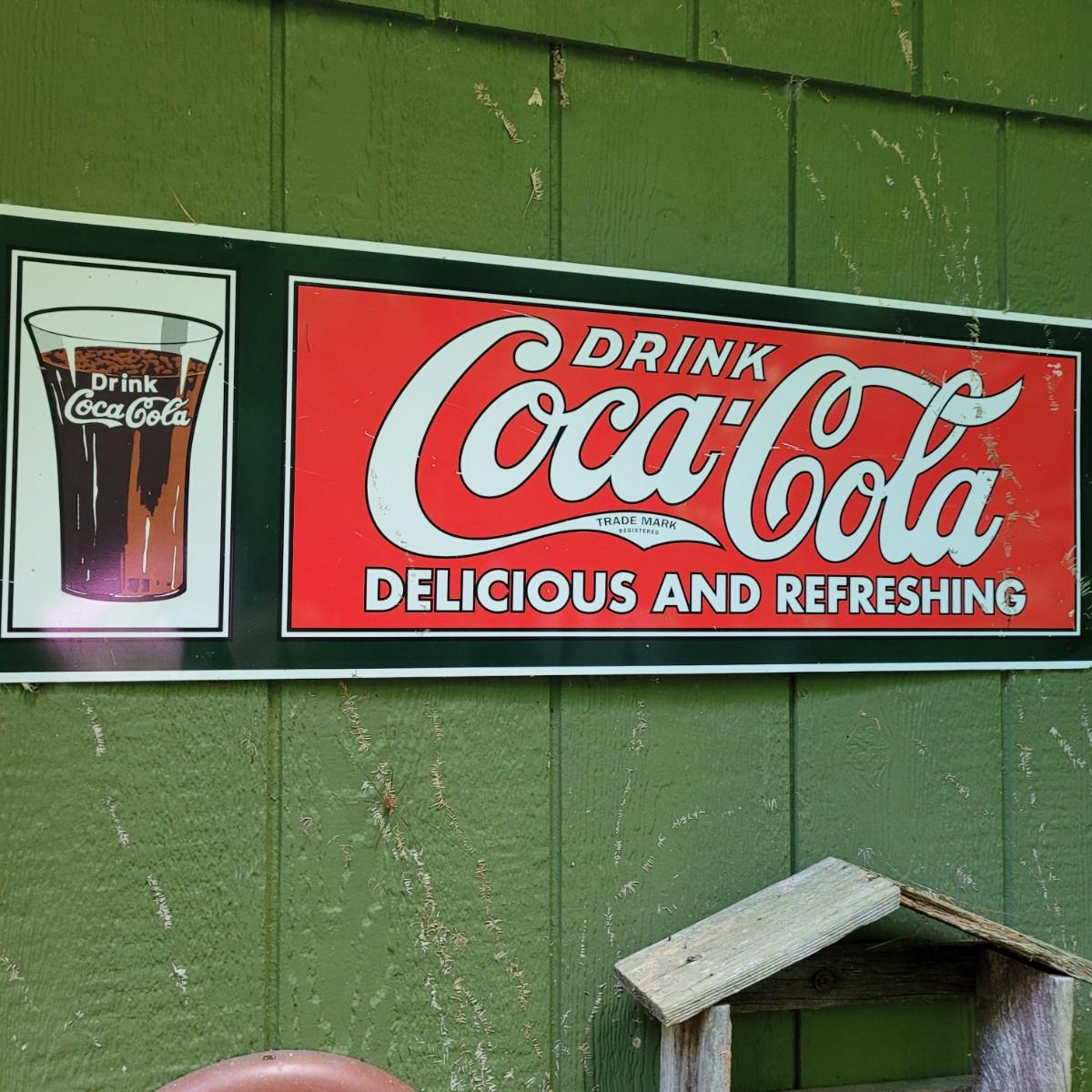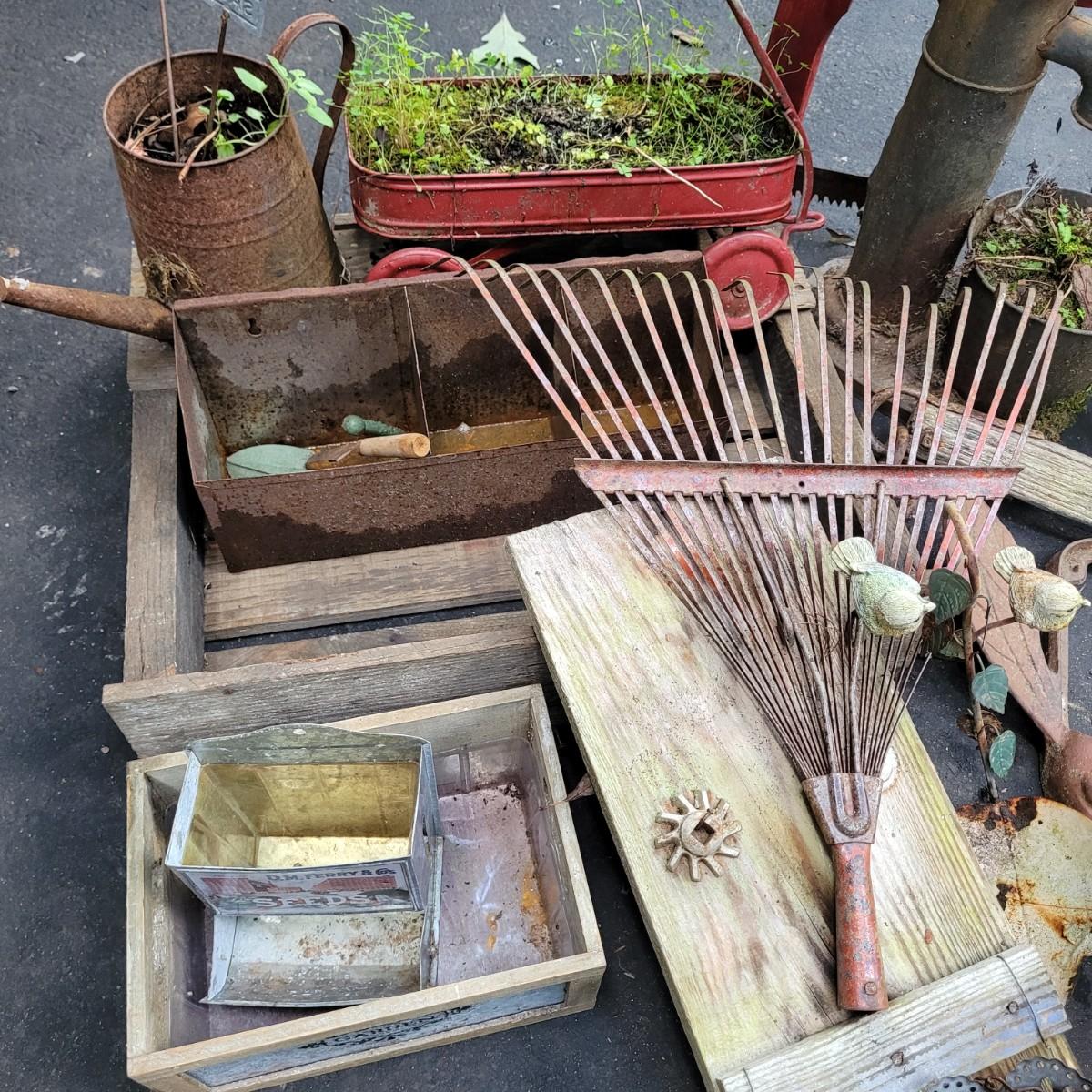 This lot includes a variety of metal and wood items for decorating the yard or shed. Items include antique yard tools, signs, and miniature yard decorations. See photos for individual items. Rectangular Coca Cola sign measures 36” x 12”H.