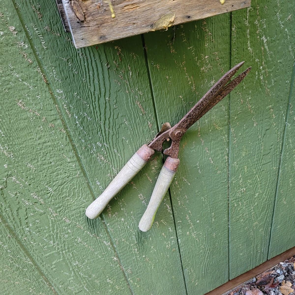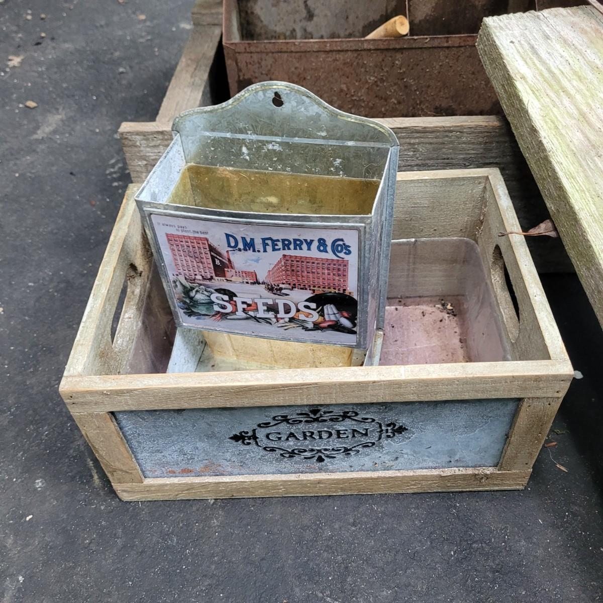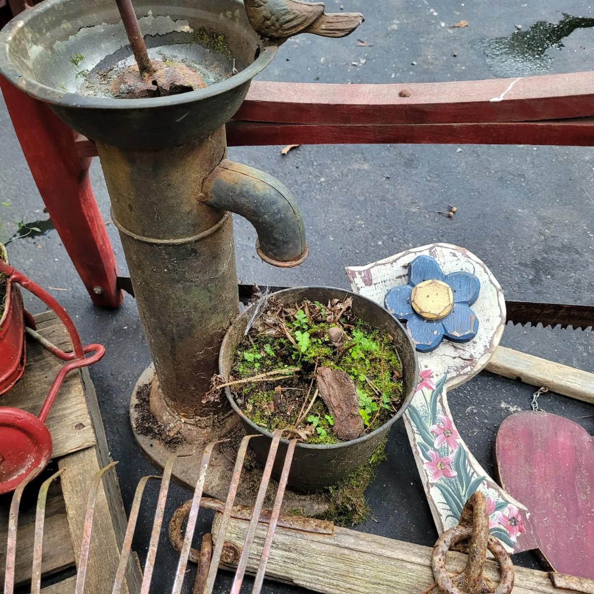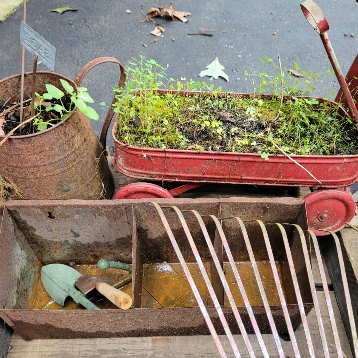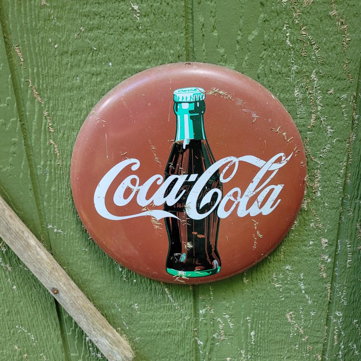 This lot includes a variety of metal and wood items for decorating the yard or shed. Items include antique yard tools, signs, and miniature yard decorations. See photos for individual items. Rectangular Coca Cola sign measures 36” x 12”H.