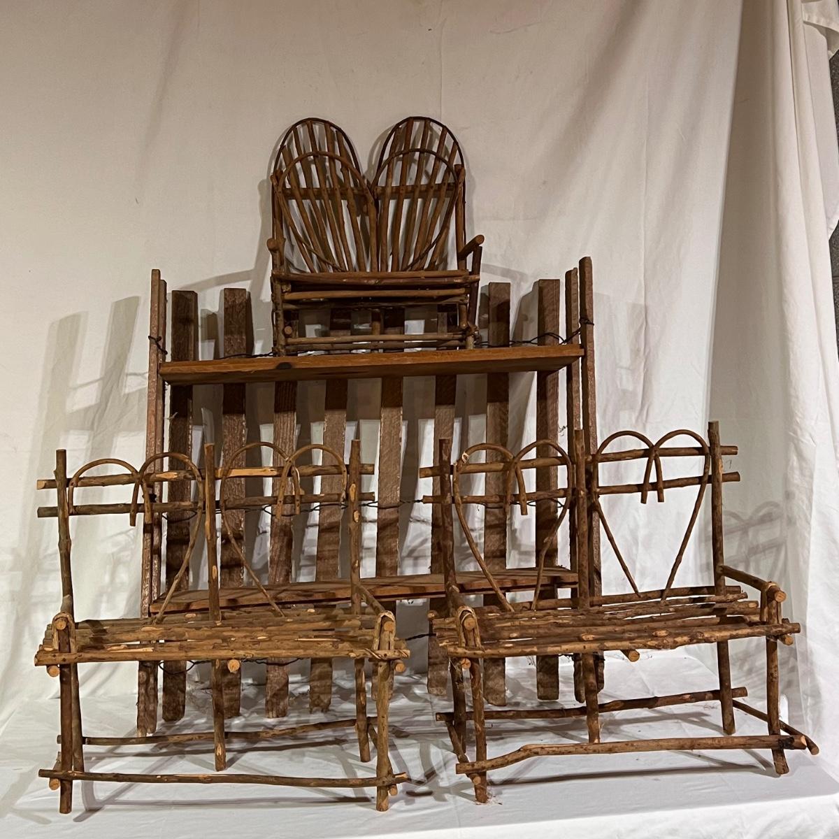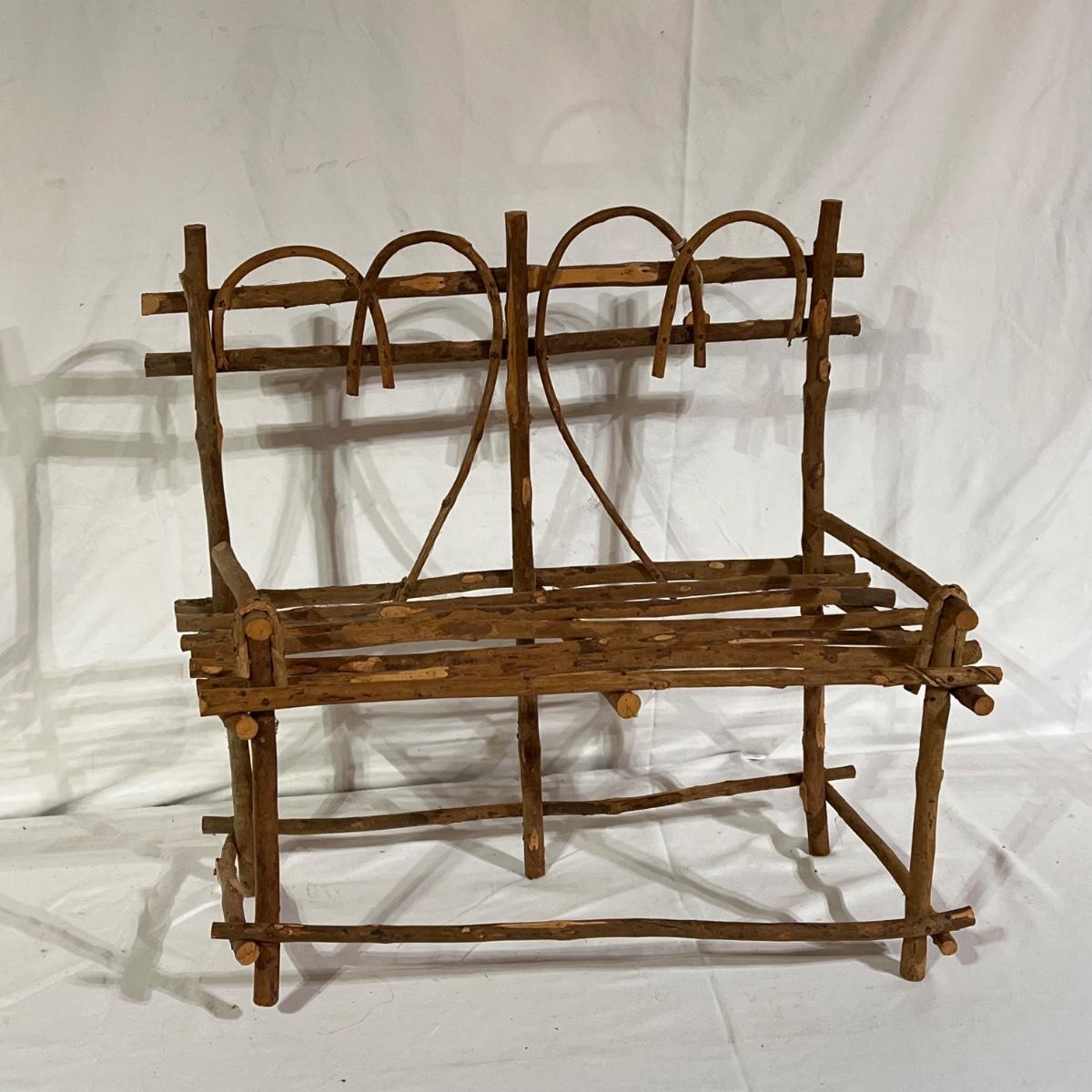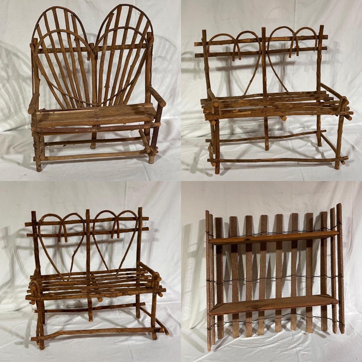 This lot includes three miniature benches and one larger shelf. All made from various sized wood, with the exception of the shelf having wire supporting the wood. The three benches appear to be sized for dolls or stuffed animals. The shelf is the largest item that measures 27”W x 7”D x 29”H. Shipping available. Shipping can be costly. We suggest contacting our preferred local shipping provider, Postage Express, with dimensions and getting an estimate before bidding: (828) 255-9250 or shipping@postageexpressnc.com.