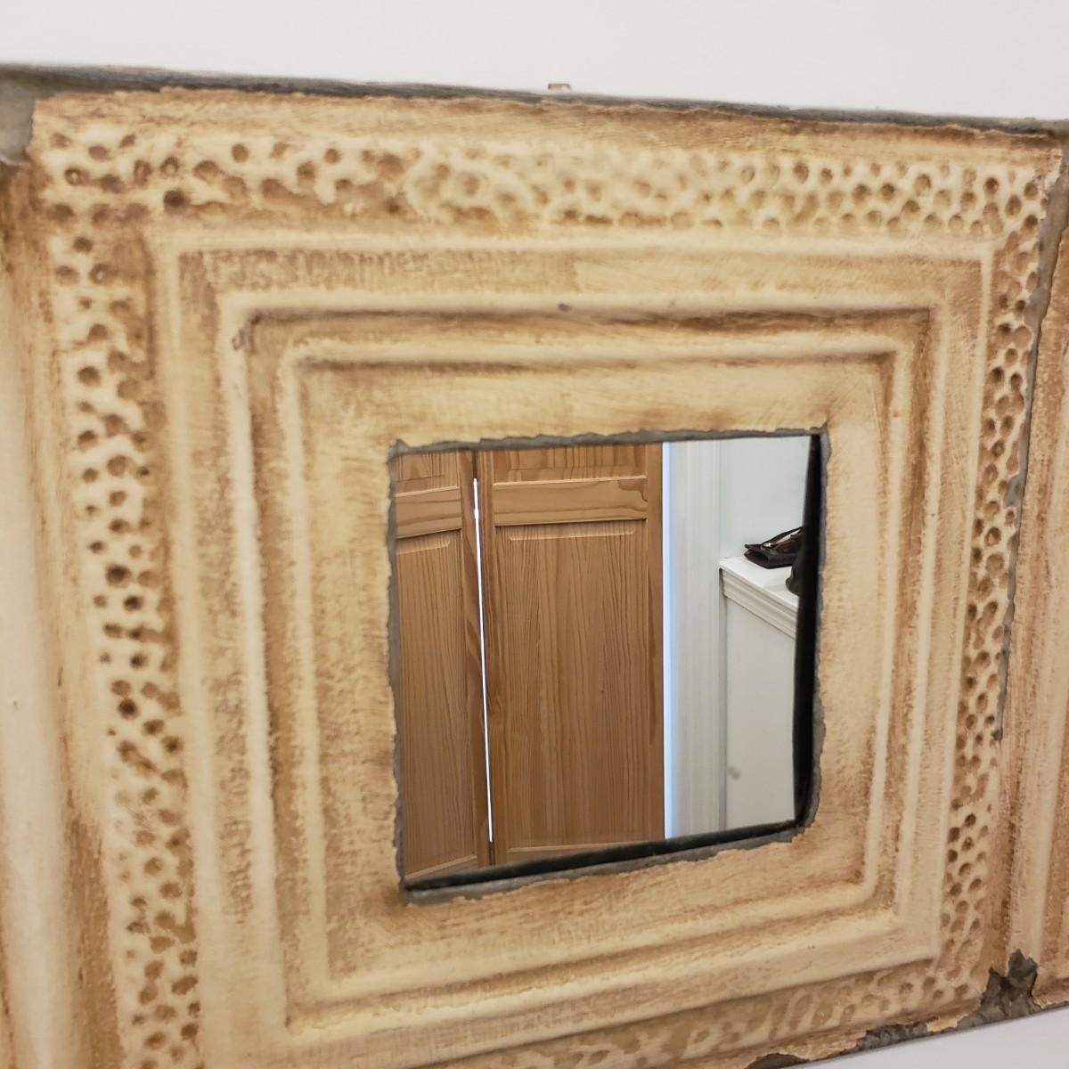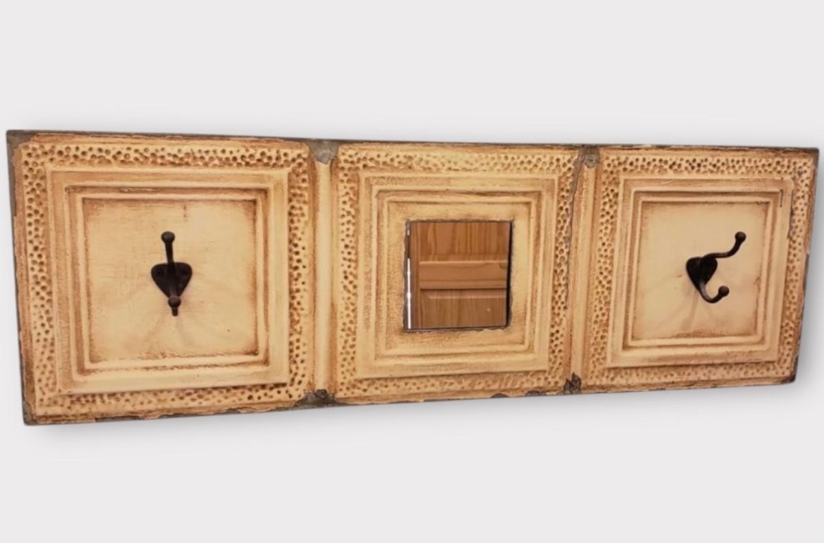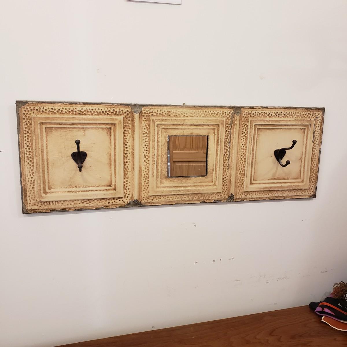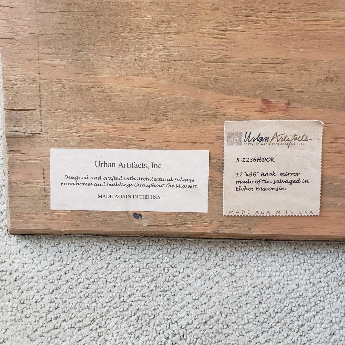 This repurposed hook/mirror was made by Urban Artifacts. The mirror measures 12" x 36". Tag states that the tin was salvaged in Elcho, Wisconsin. The mirror has a wire ready to hang.
