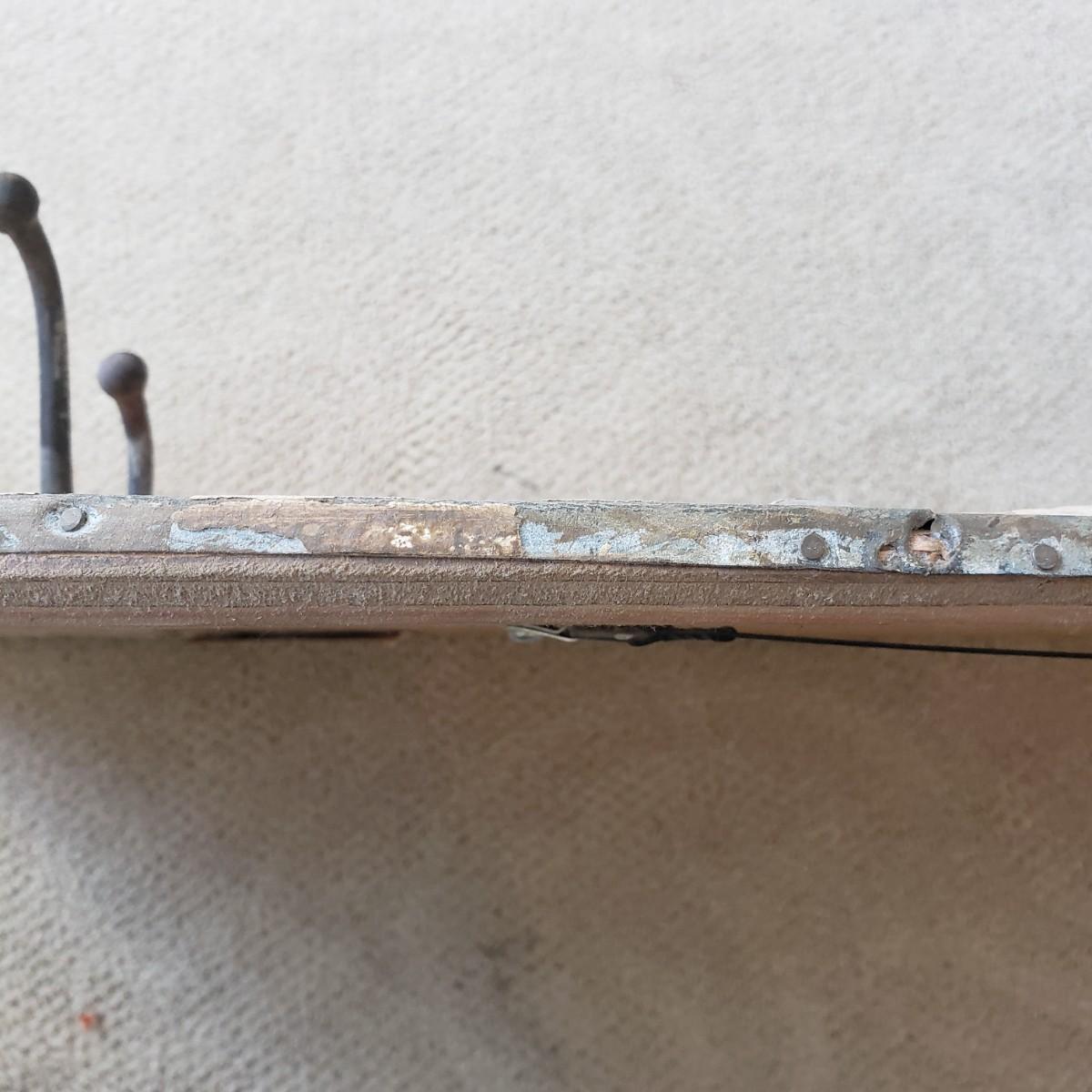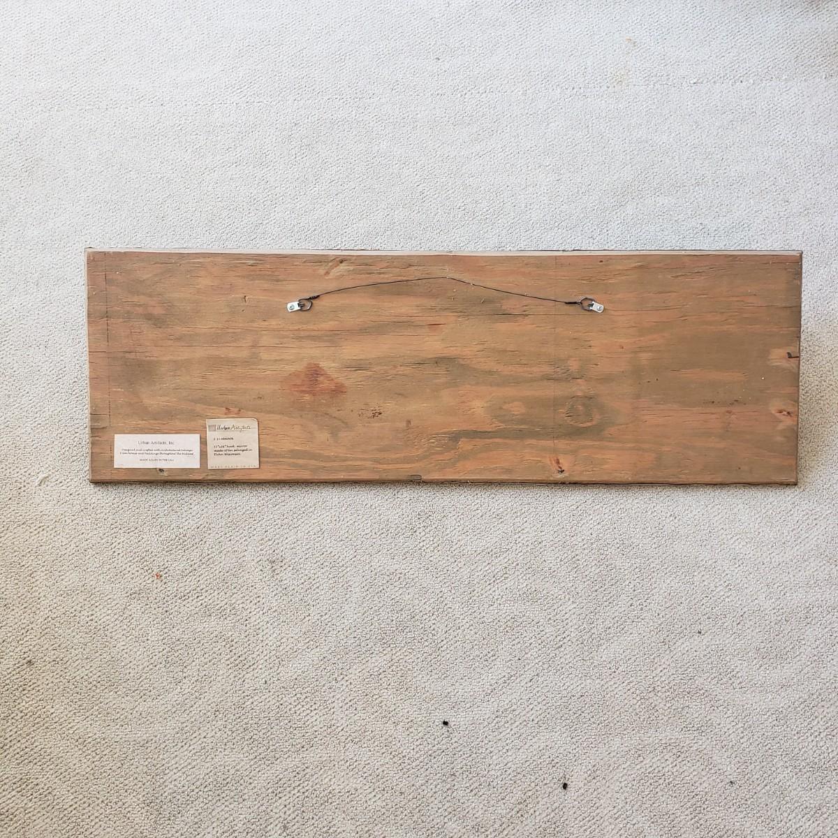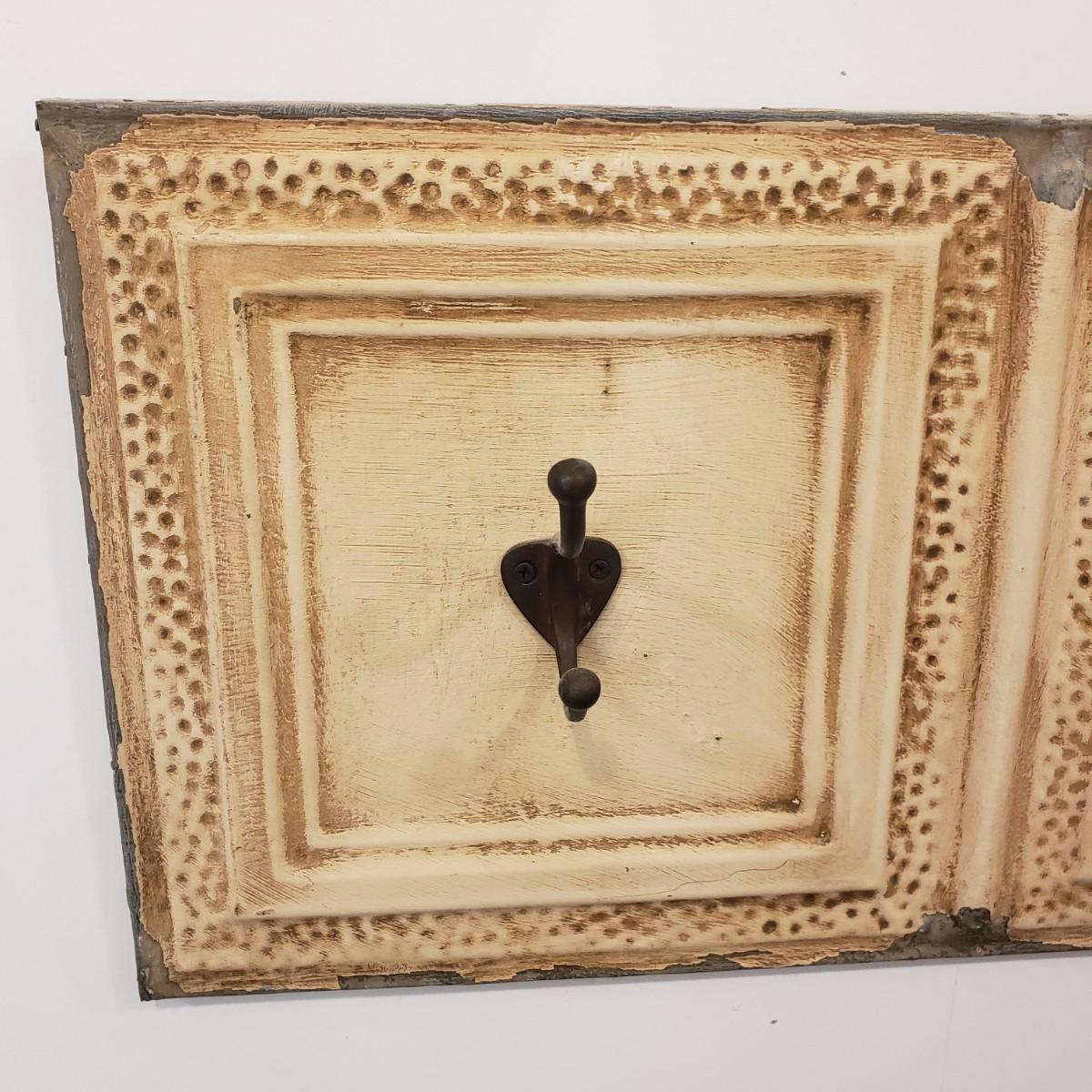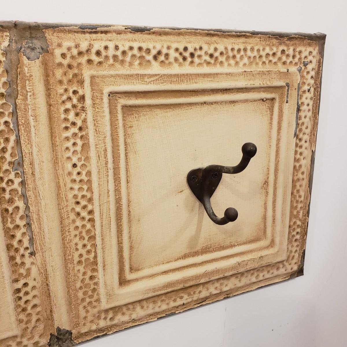 This repurposed hook/mirror was made by Urban Artifacts. The mirror measures 12" x 36". Tag states that the tin was salvaged in Elcho, Wisconsin. The mirror has a wire ready to hang.