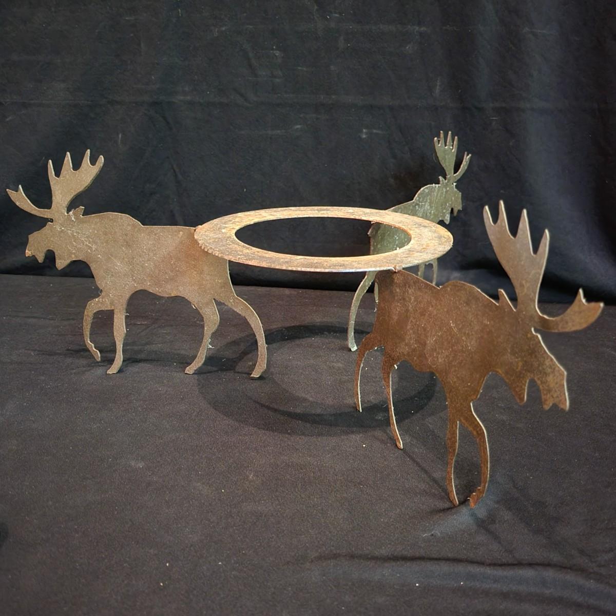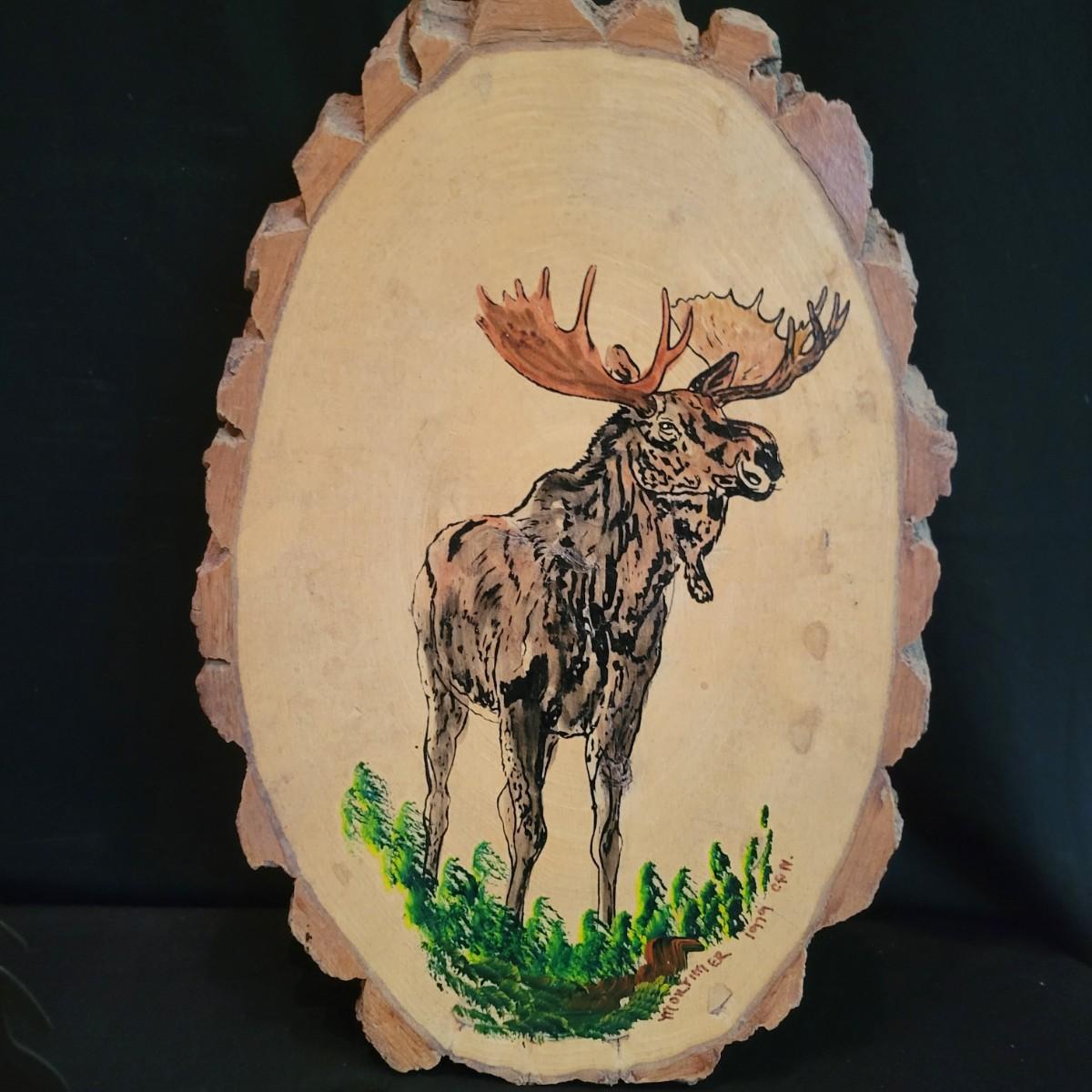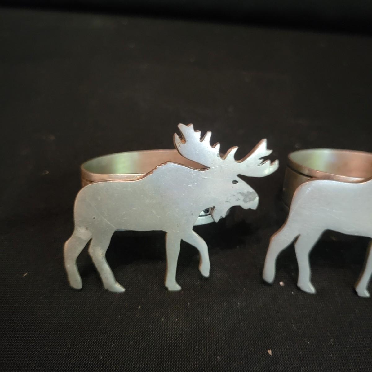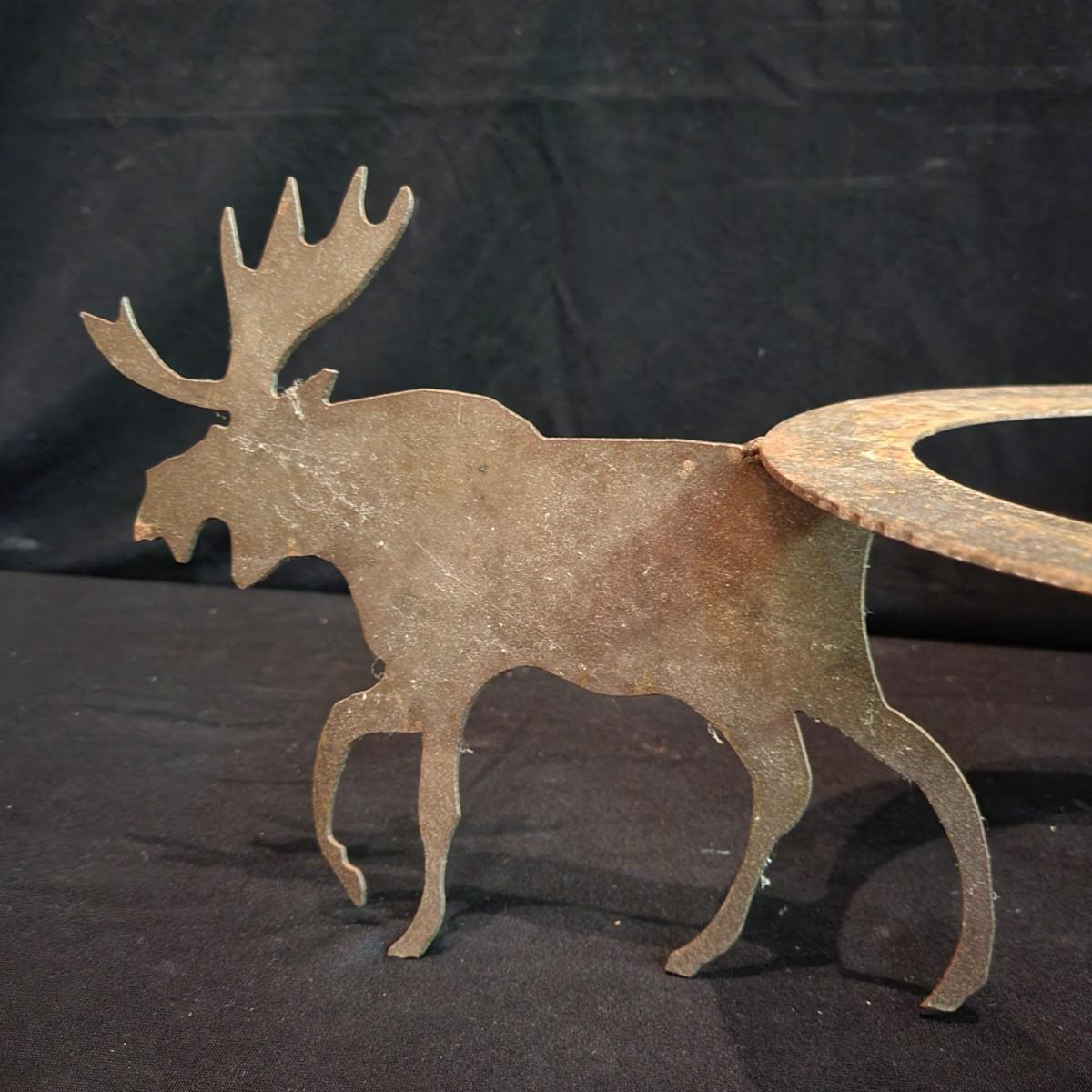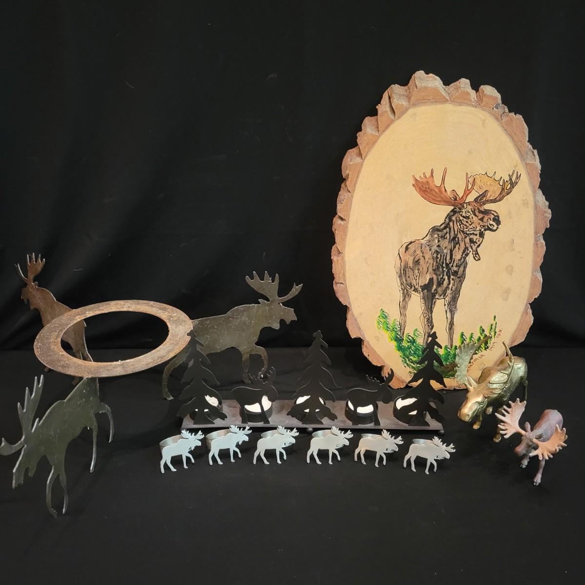 An assortment of rustic moose decor. Included is a moose painting on a log round that measures approximately 12" x 1" x 19"H. Also includes six moose napkin rings, a brass moose, a painted plastic moose, moose votive candle holder and a moose plant stand. Local pickup only