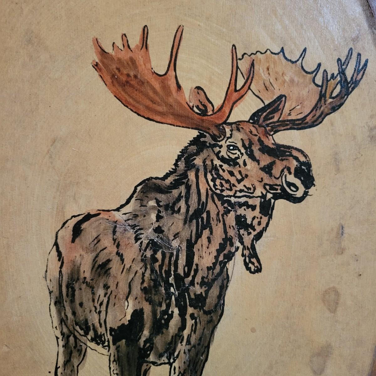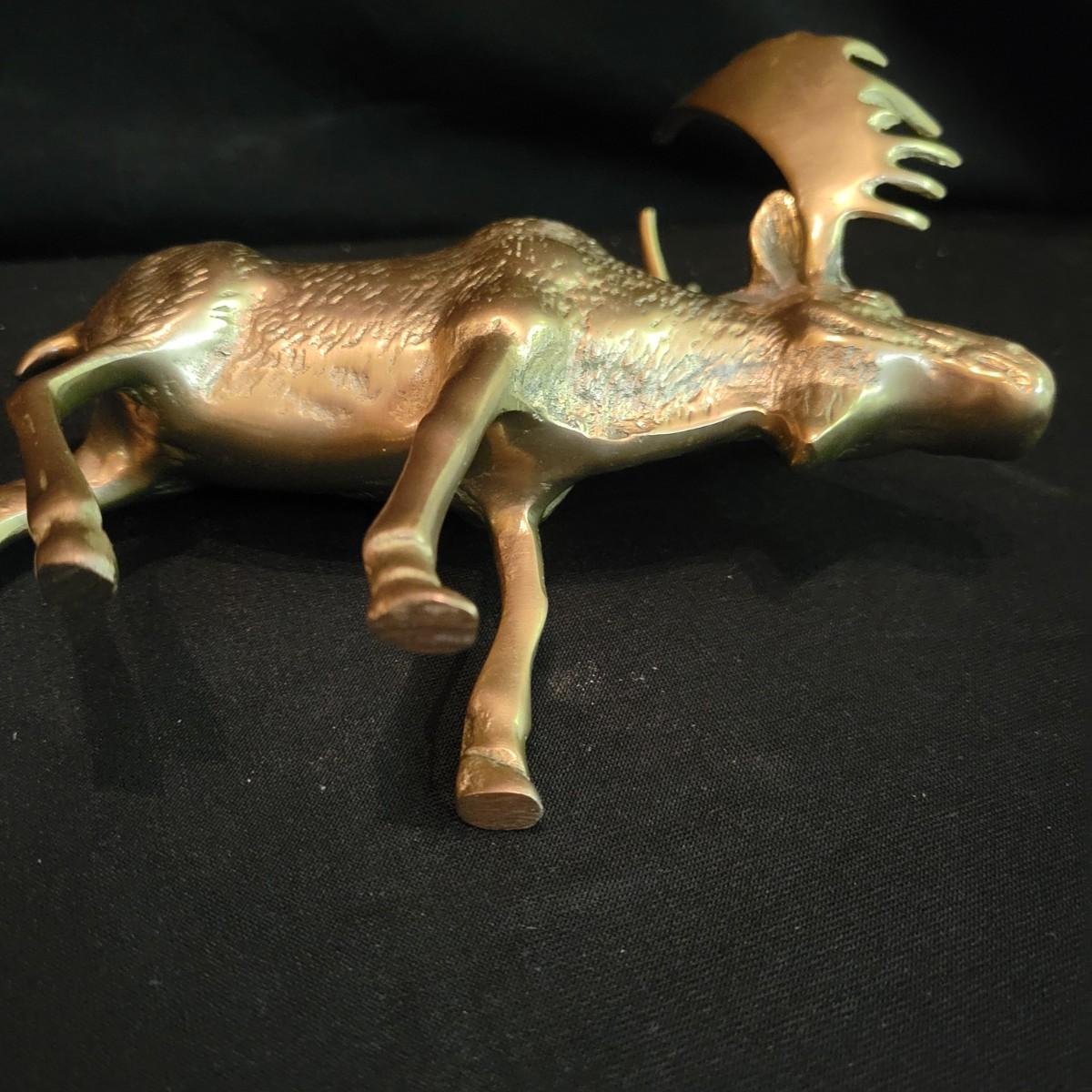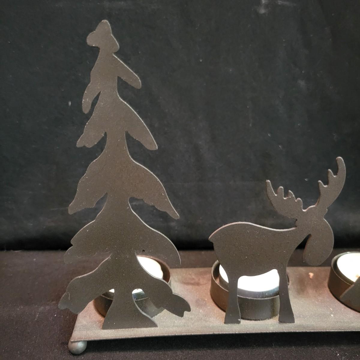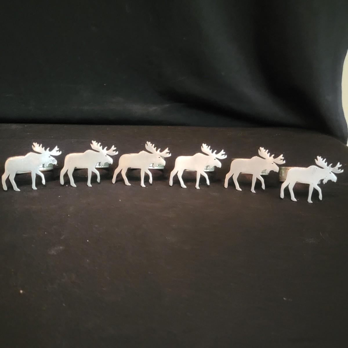 An assortment of rustic moose decor. Included is a moose painting on a log round that measures approximately 12" x 1" x 19"H. Also includes six moose napkin rings, a brass moose, a painted plastic moose, moose votive candle holder and a moose plant stand. Local pickup only