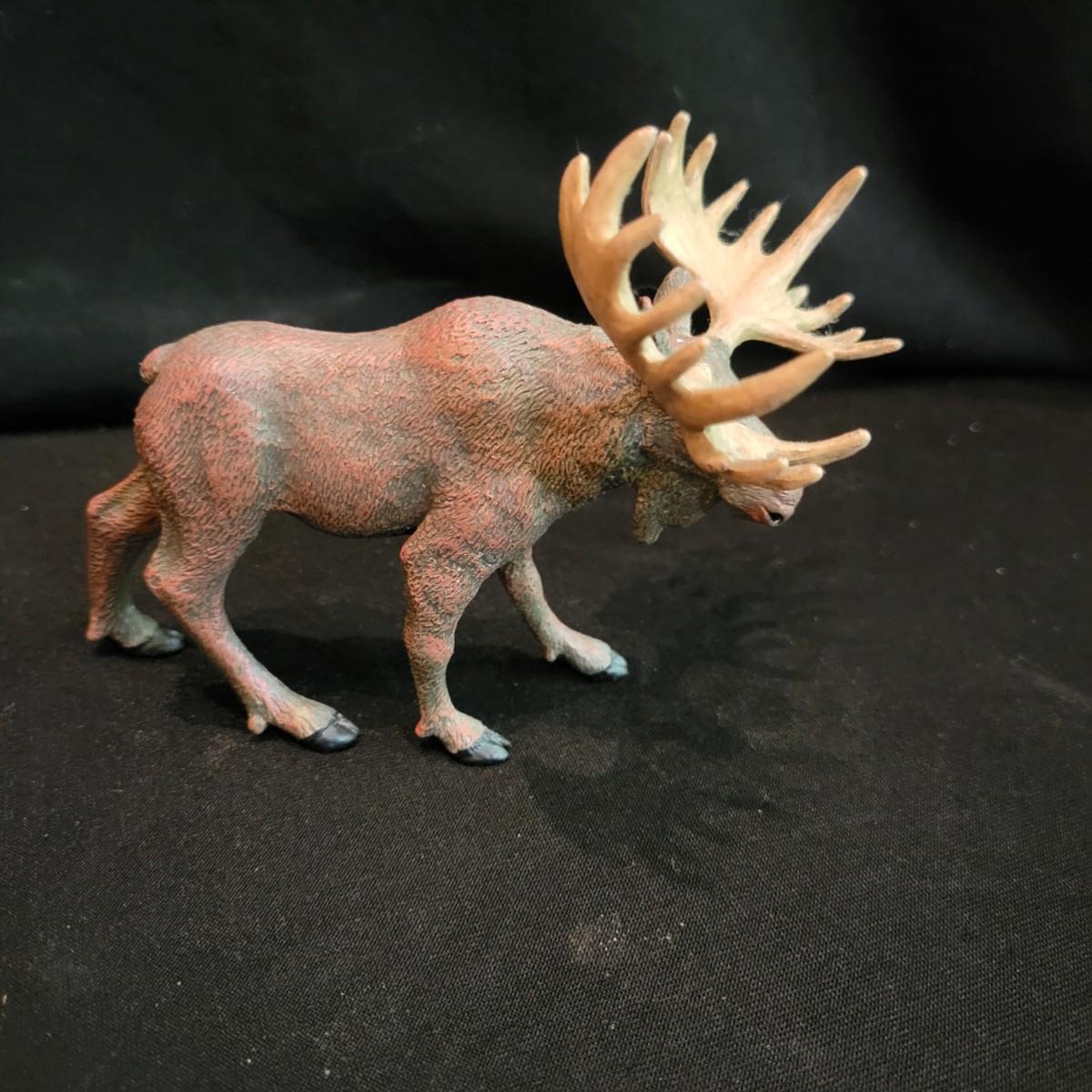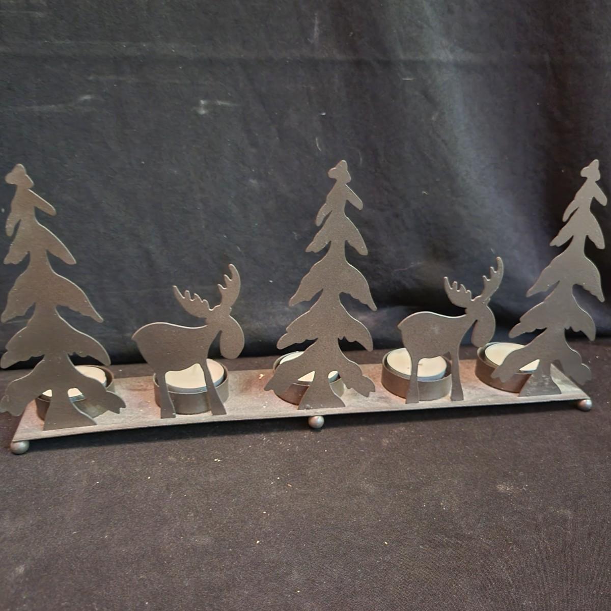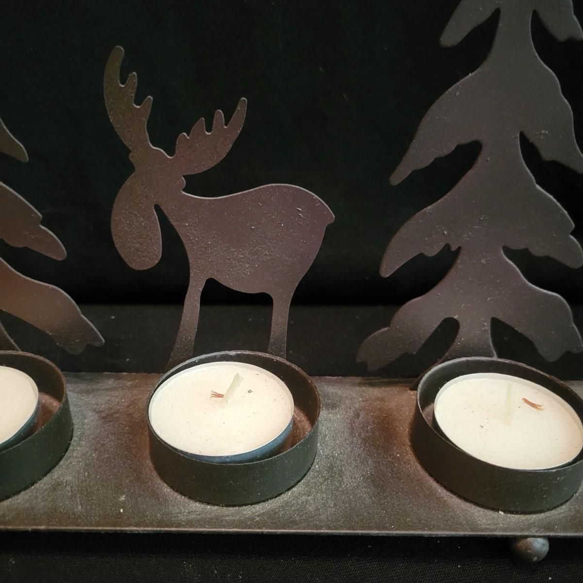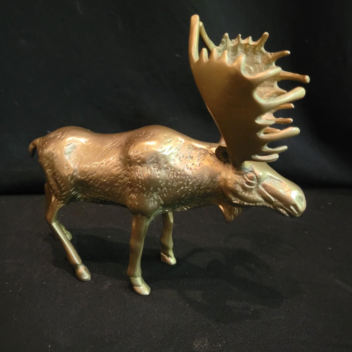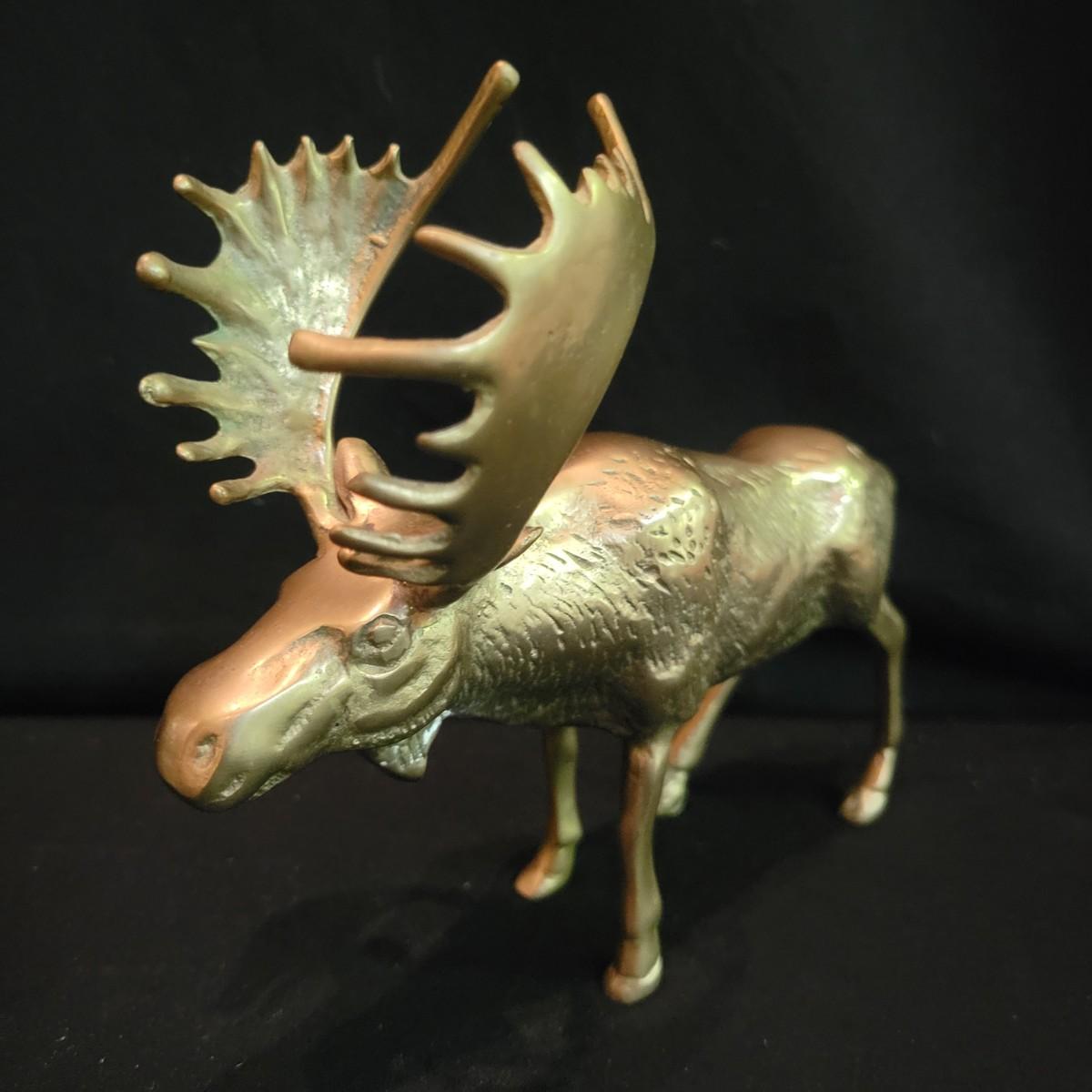 An assortment of rustic moose decor. Included is a moose painting on a log round that measures approximately 12" x 1" x 19"H. Also includes six moose napkin rings, a brass moose, a painted plastic moose, moose votive candle holder and a moose plant stand. Local pickup only