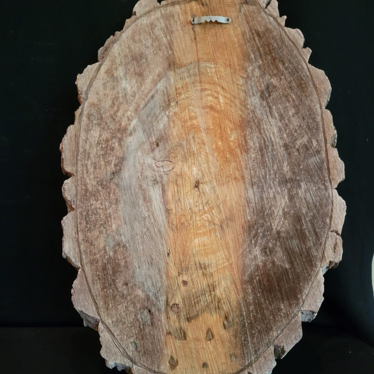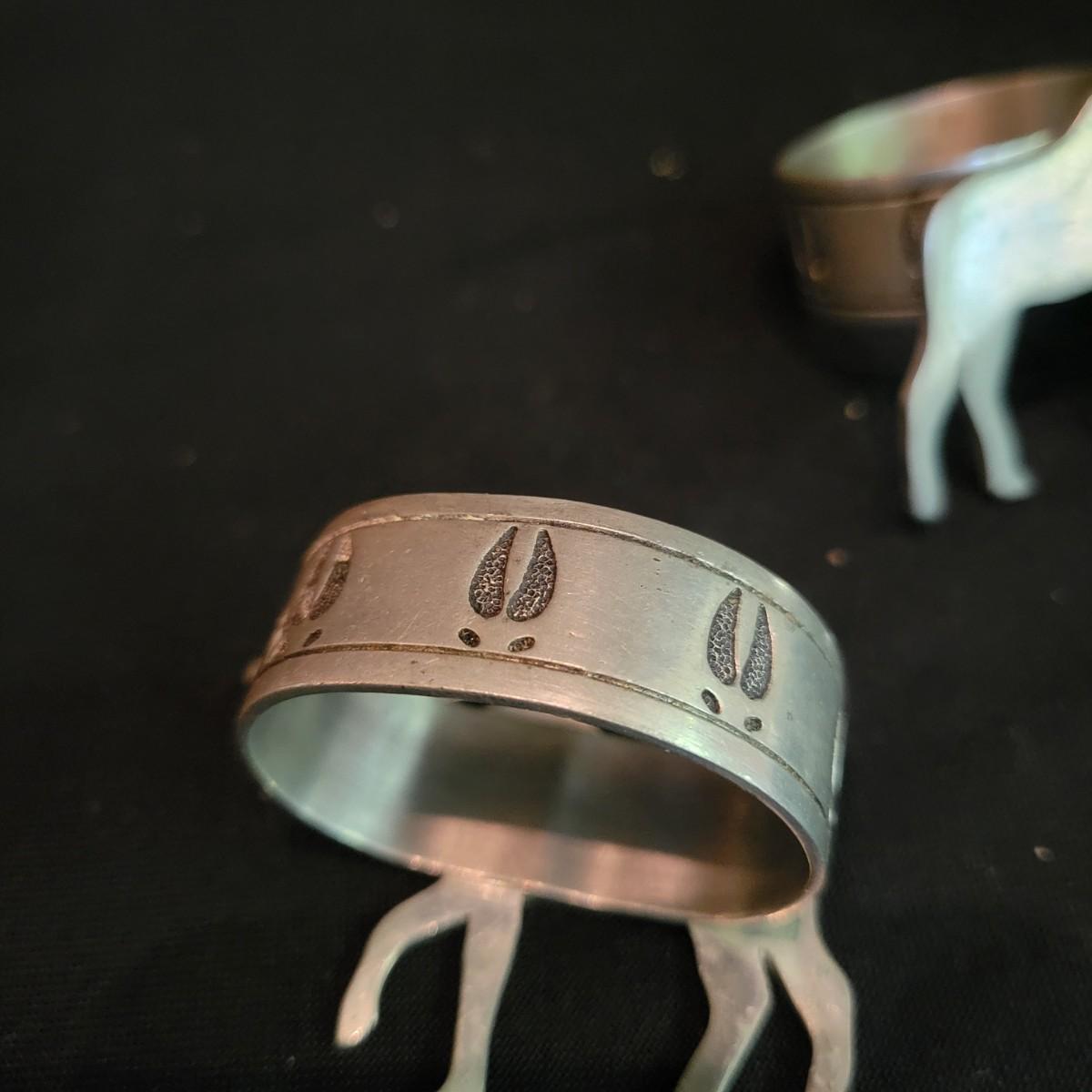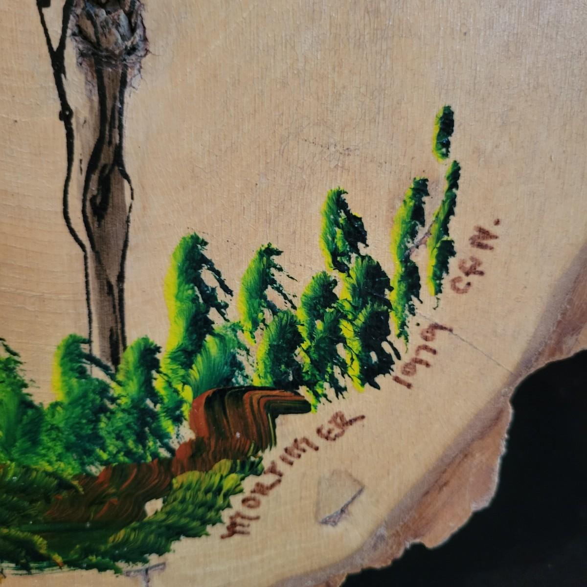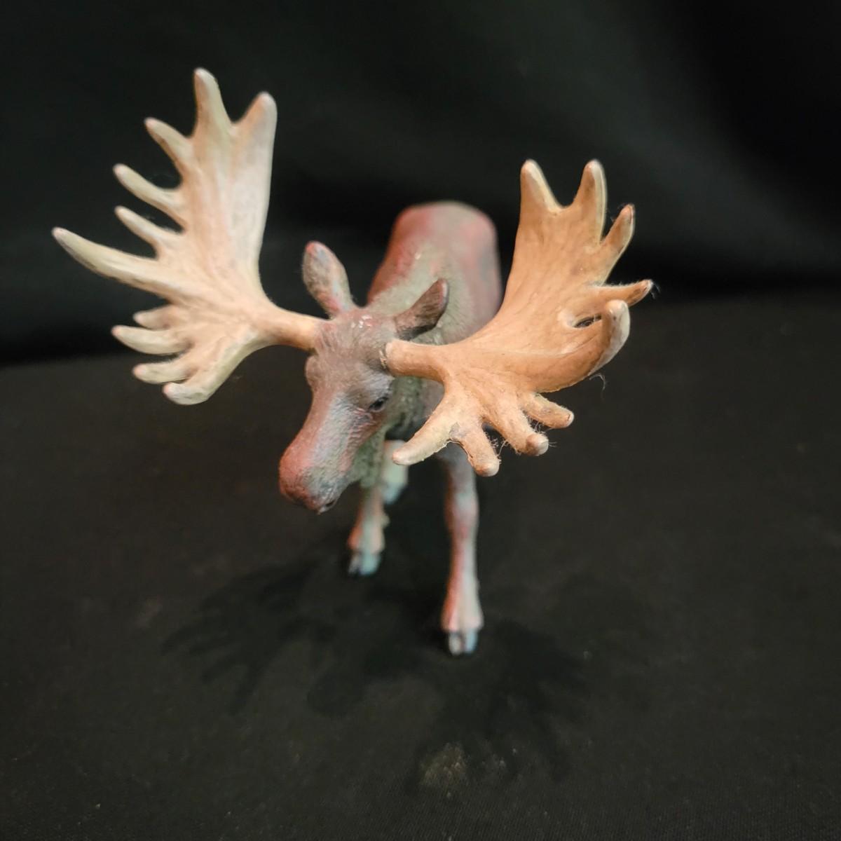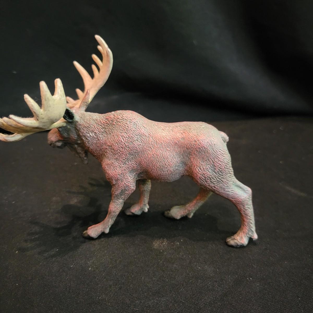 An assortment of rustic moose decor. Included is a moose painting on a log round that measures approximately 12" x 1" x 19"H. Also includes six moose napkin rings, a brass moose, a painted plastic moose, moose votive candle holder and a moose plant stand. Local pickup only