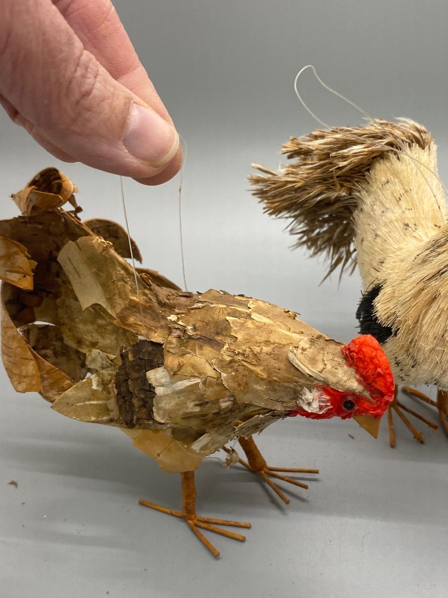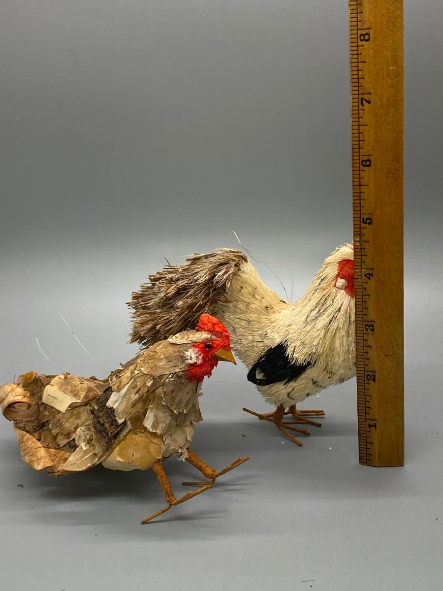 Rustic natural material hen and rooster pair. Foam covered with sticks and twigs. Both have clear line attached for hanging. Great rustic decor or for use in crafts. About 4" size.
