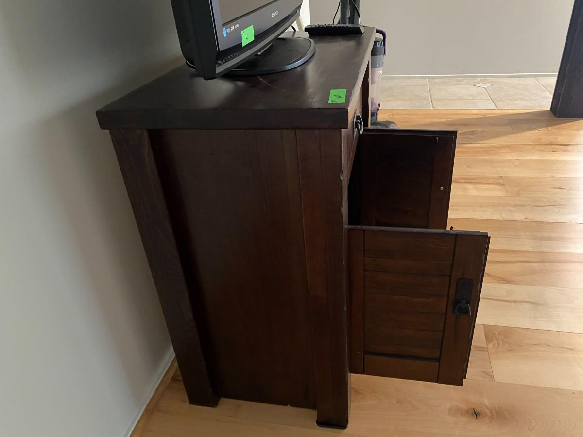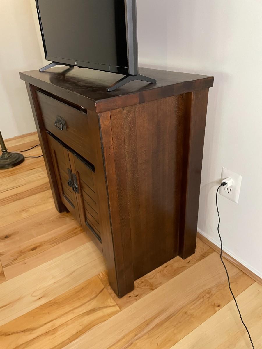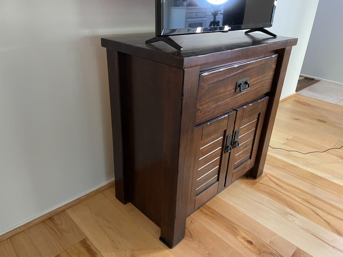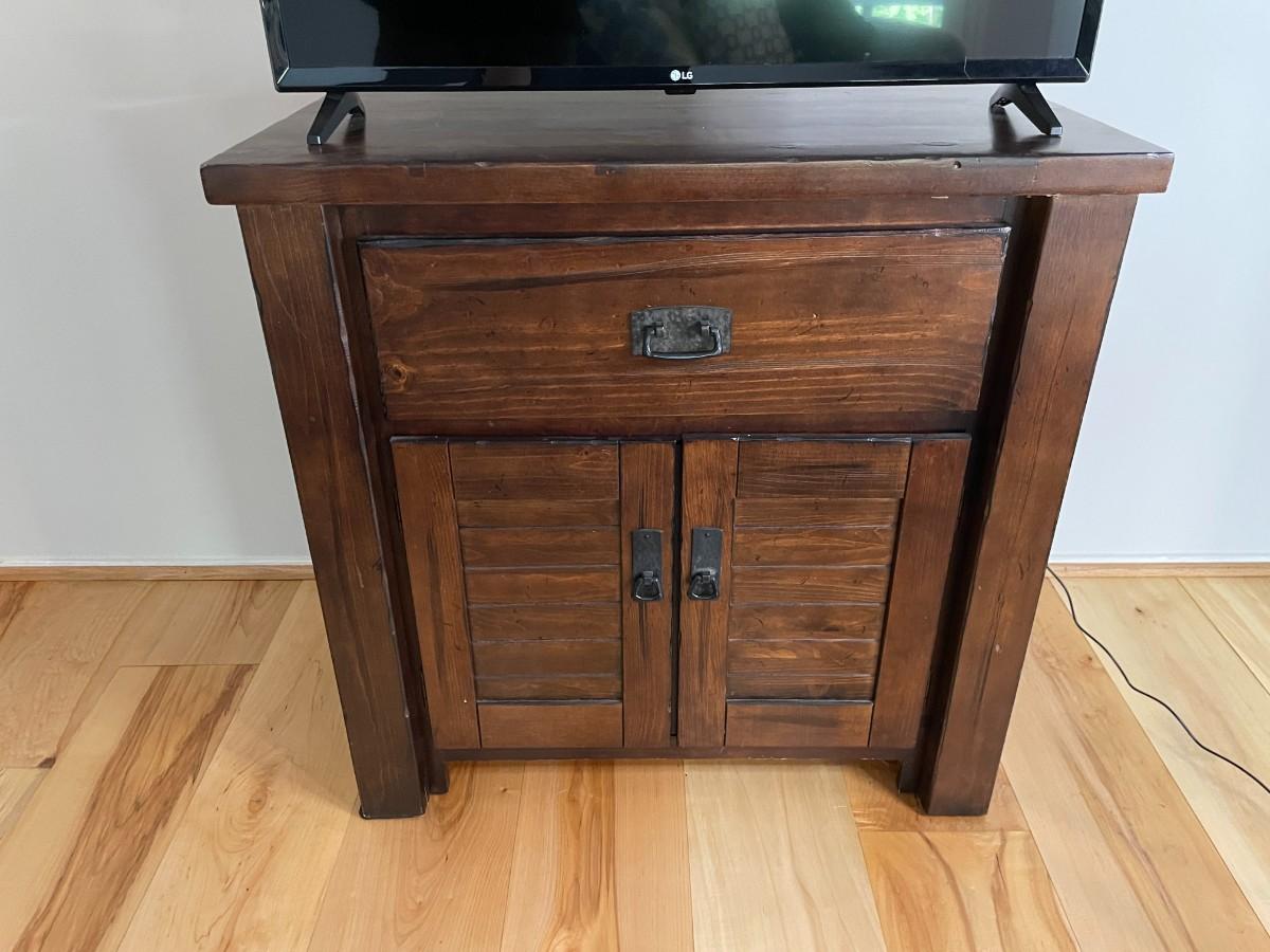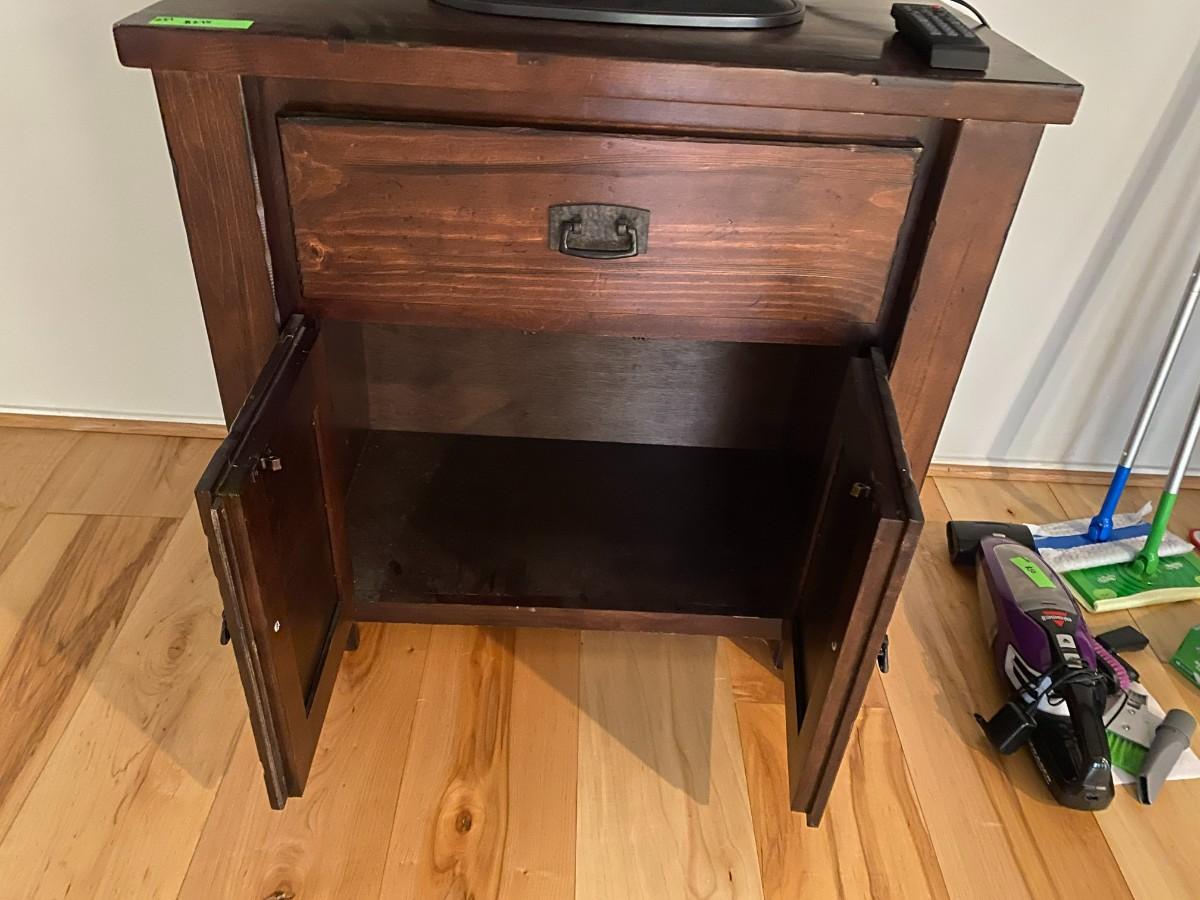 Has one drawer and a bottom double door for storage. 31H X 31W X 17D