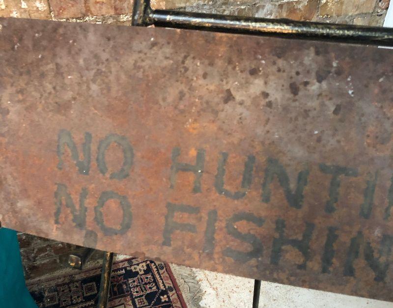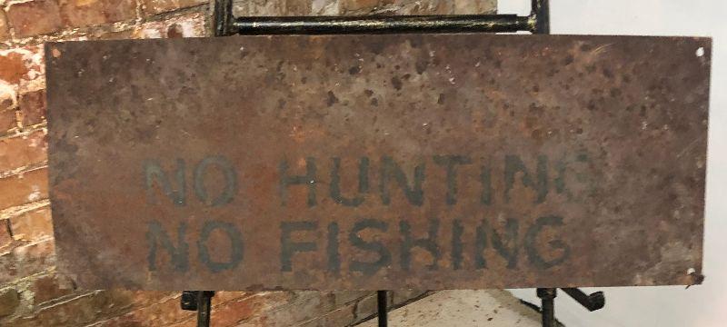 Here is a rustic metal No Hunting/No Fishing sign...Weathered original...24 x 9"...