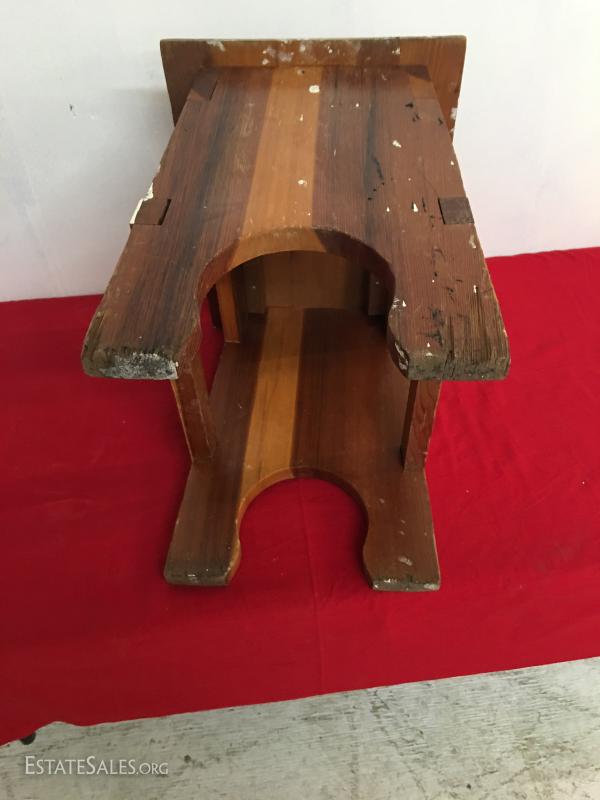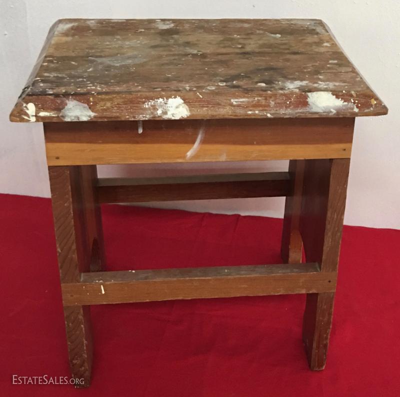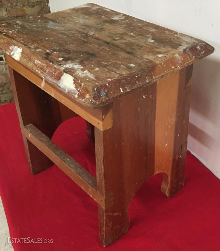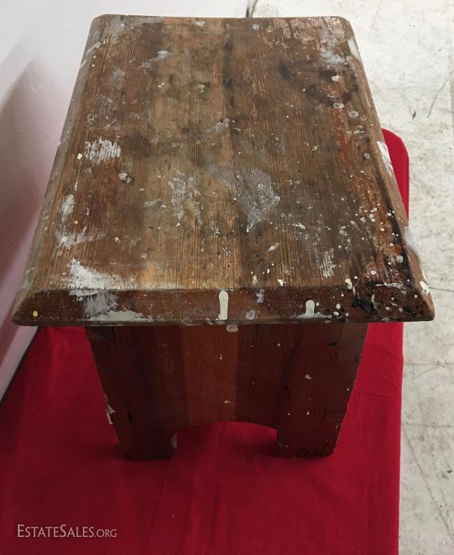 Stool is worn and used. made of pine, measures 13" by 18" and is 19" tall.