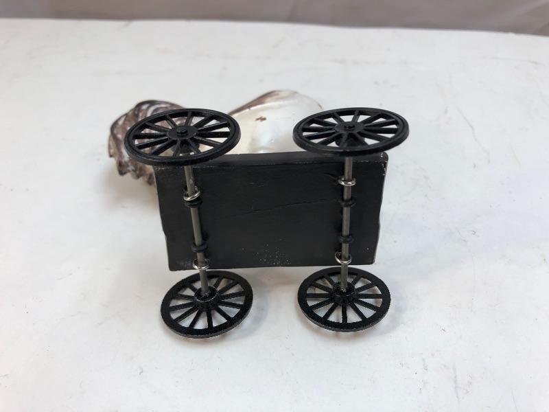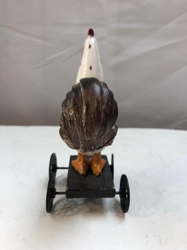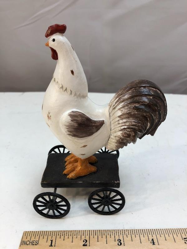 Rustic rooster on wheeled cart figurine. Displays great, small size about 6".