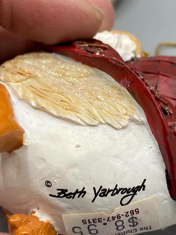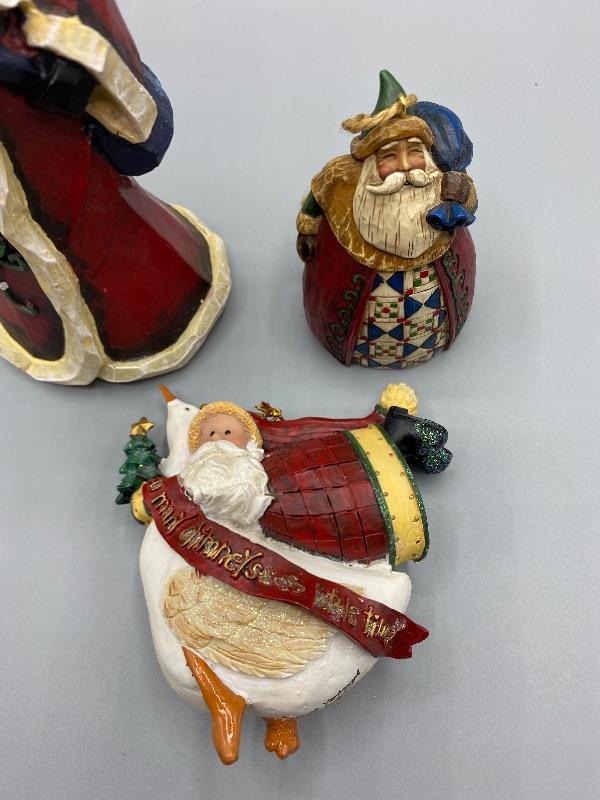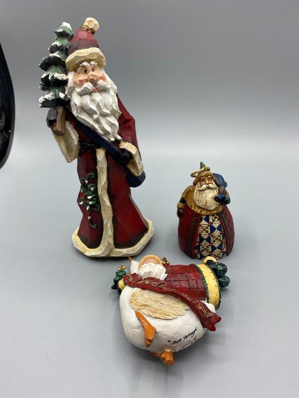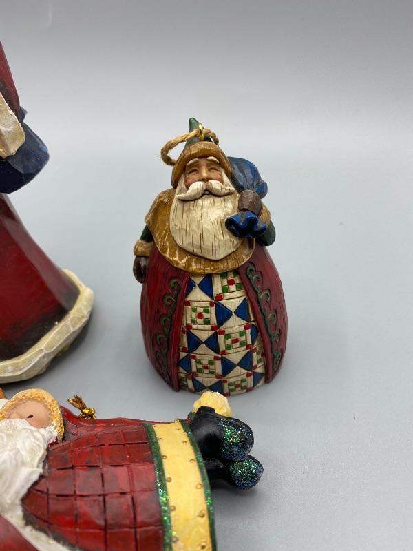Pair of rustic Santa ornaments and one figurine. Ornaments are Jim Shore and Beth Yarbrough. Figurine is about 8" size and unbranded. Good conditions.