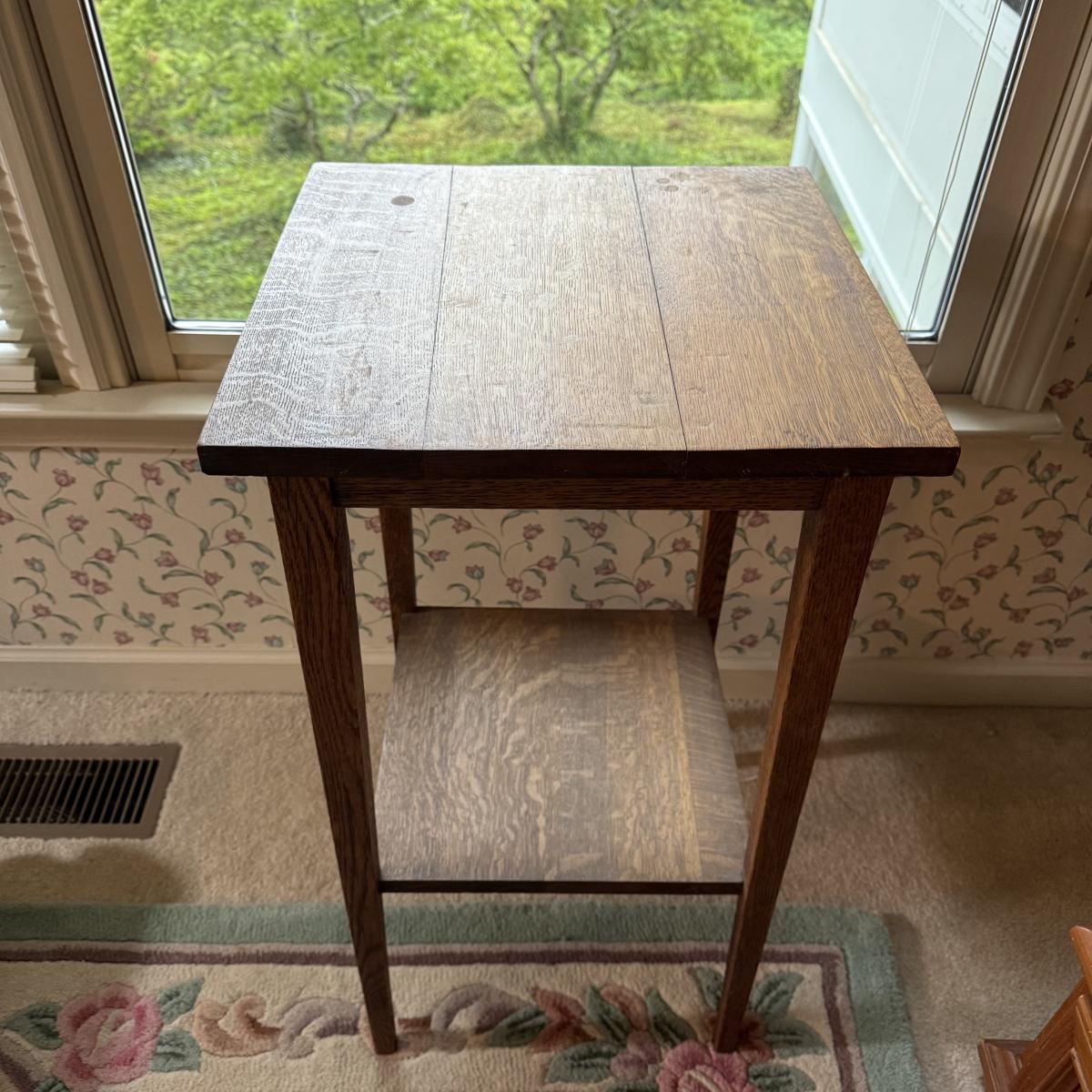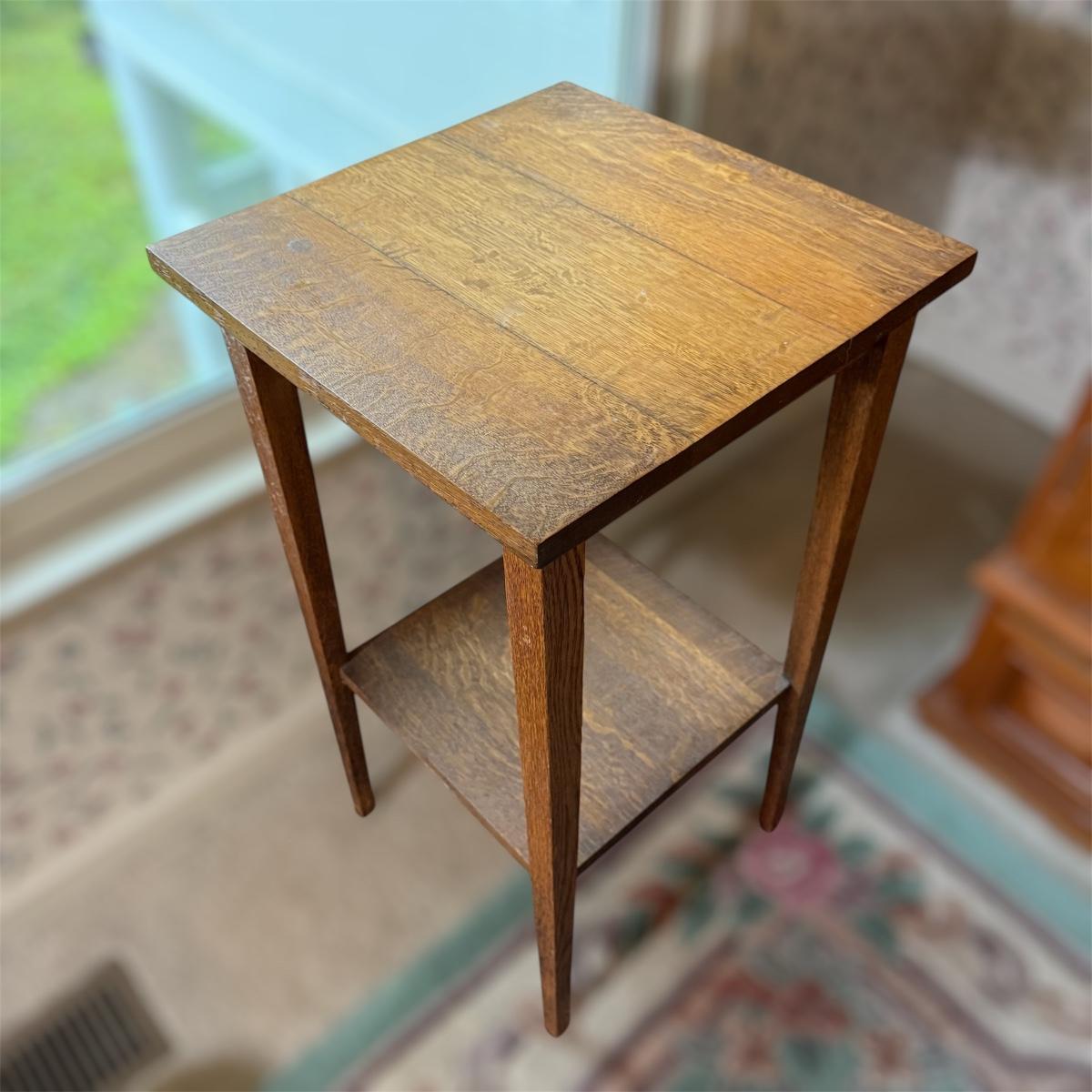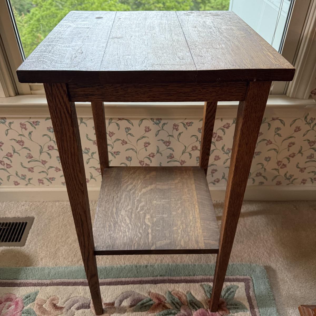 This lot contains the perfect solid oak side table. Table has two levels. It measures 16” x 16” x 29.5”H. Local pick up only.