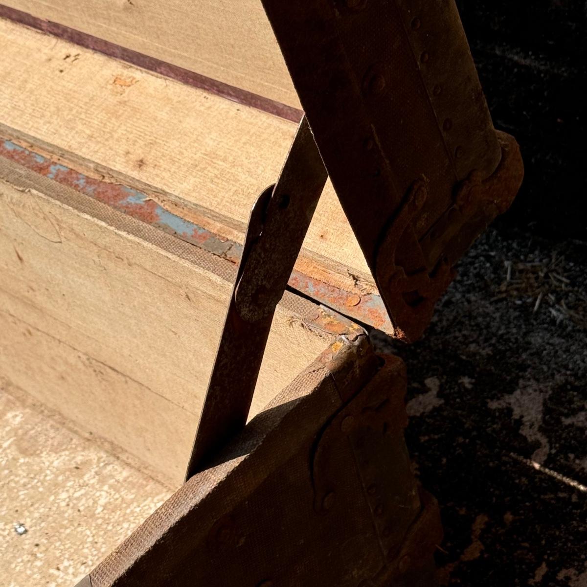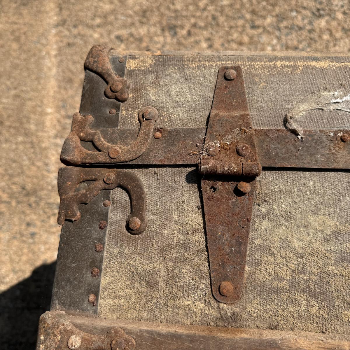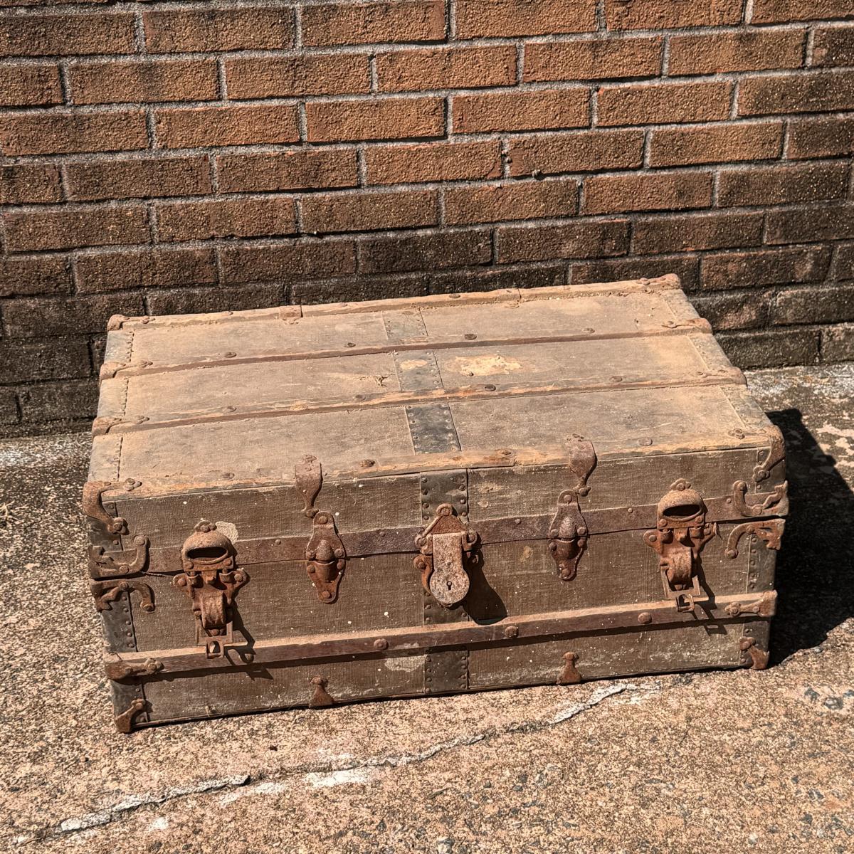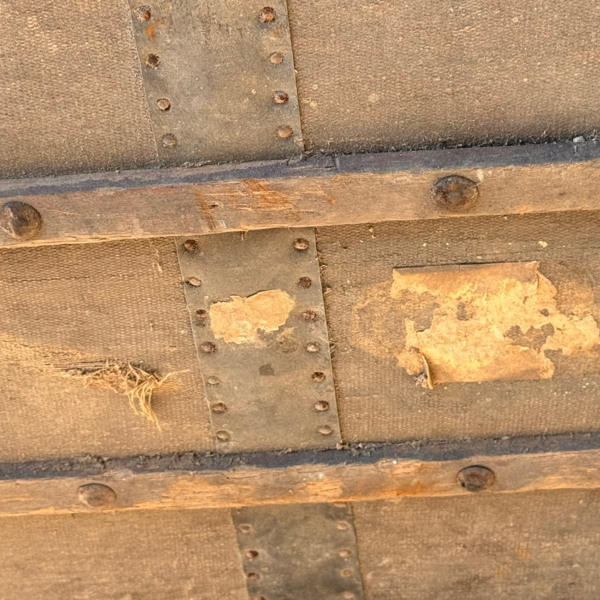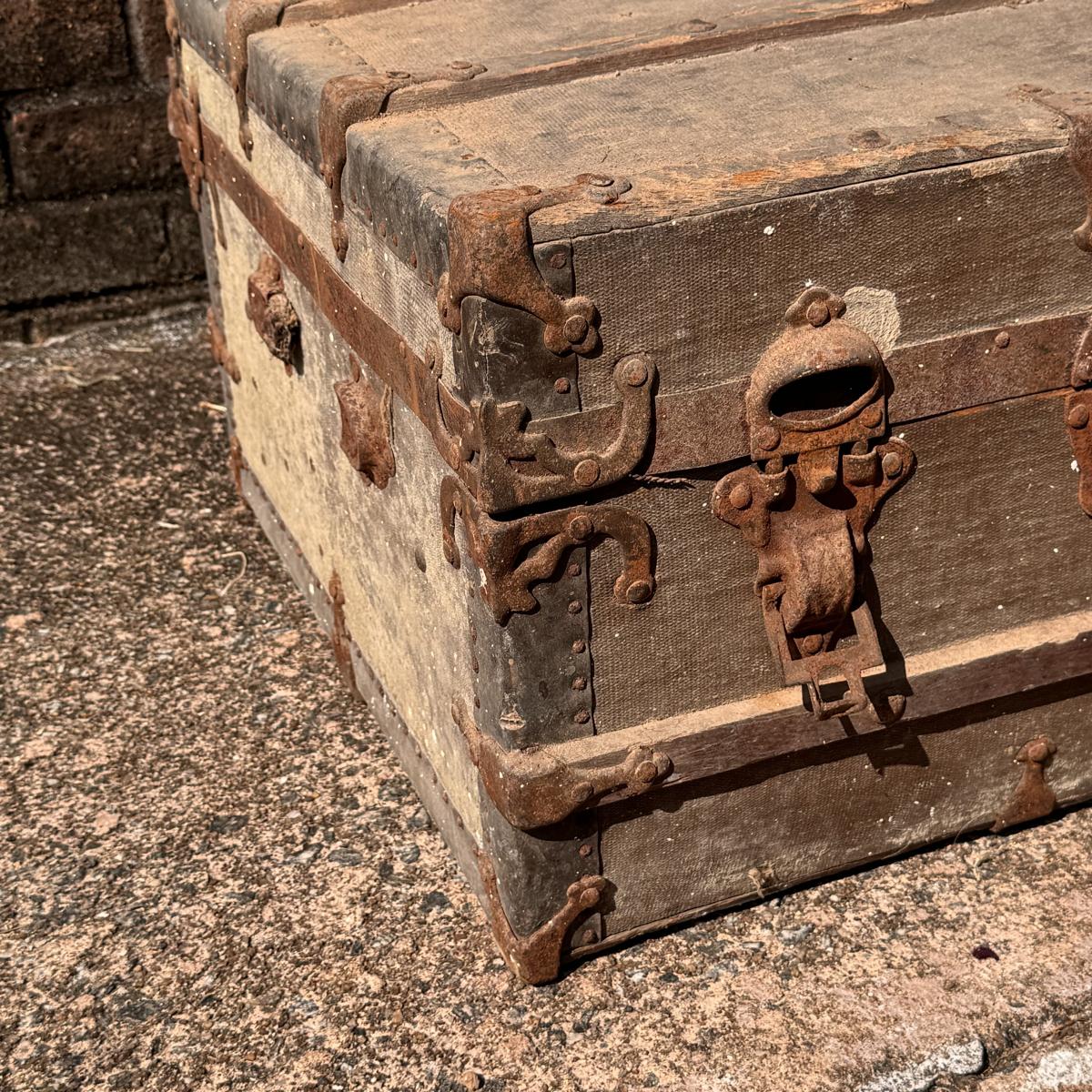 This lot includes one rustic steamer trunk that appears to be vintage. The material used is canvas over wood with metal accents. The trunk has signs of wear including rust and mold - see pictures included. The lock does not work. The trunk measures 30” x 18” x 12”H. Local pickup only.