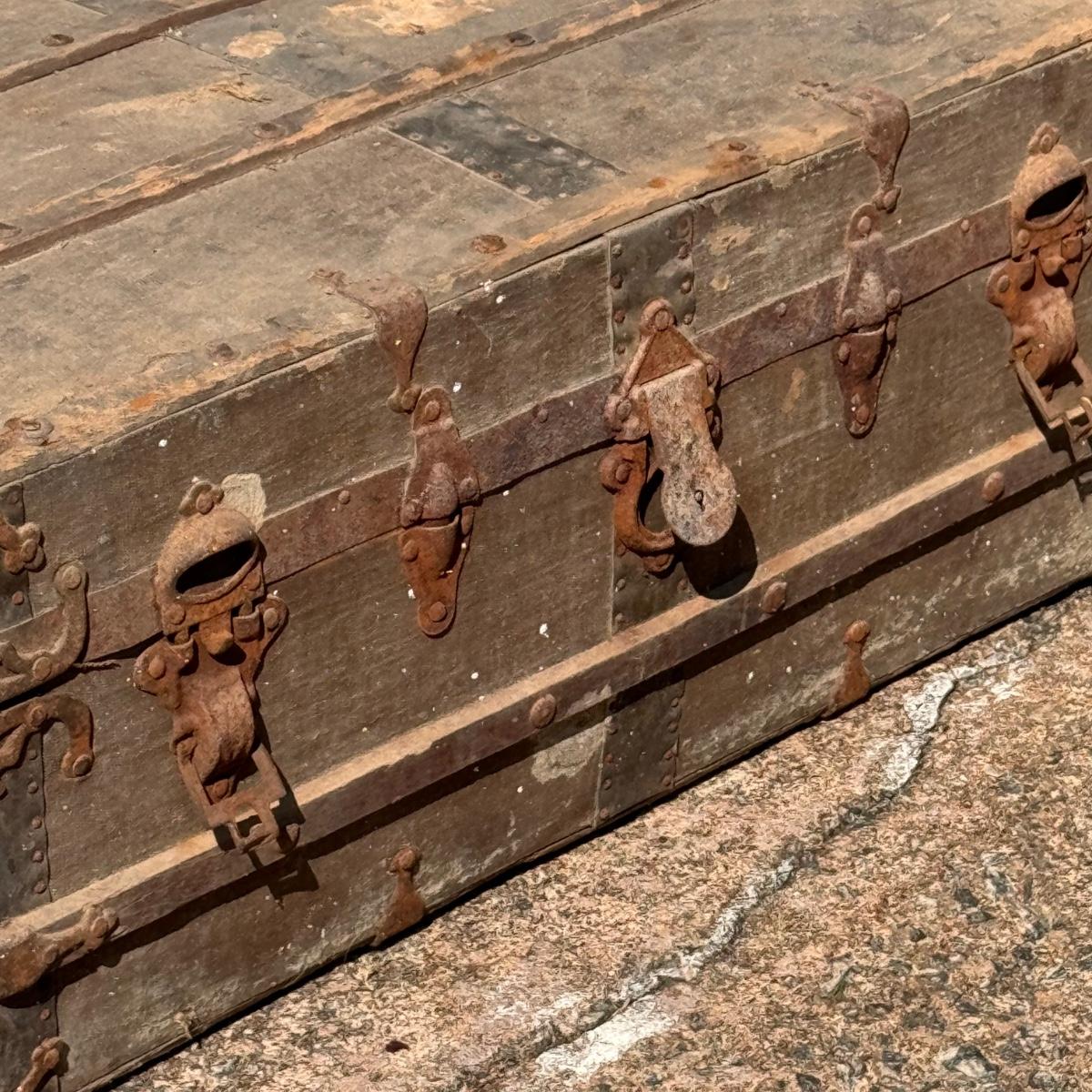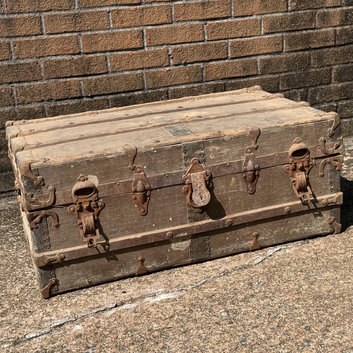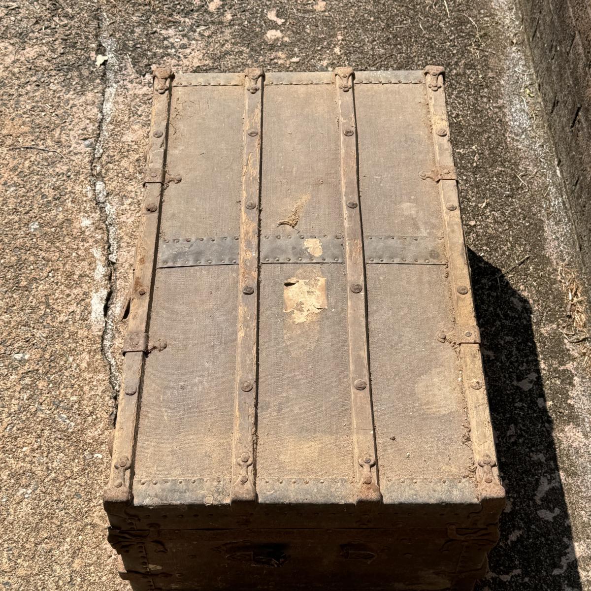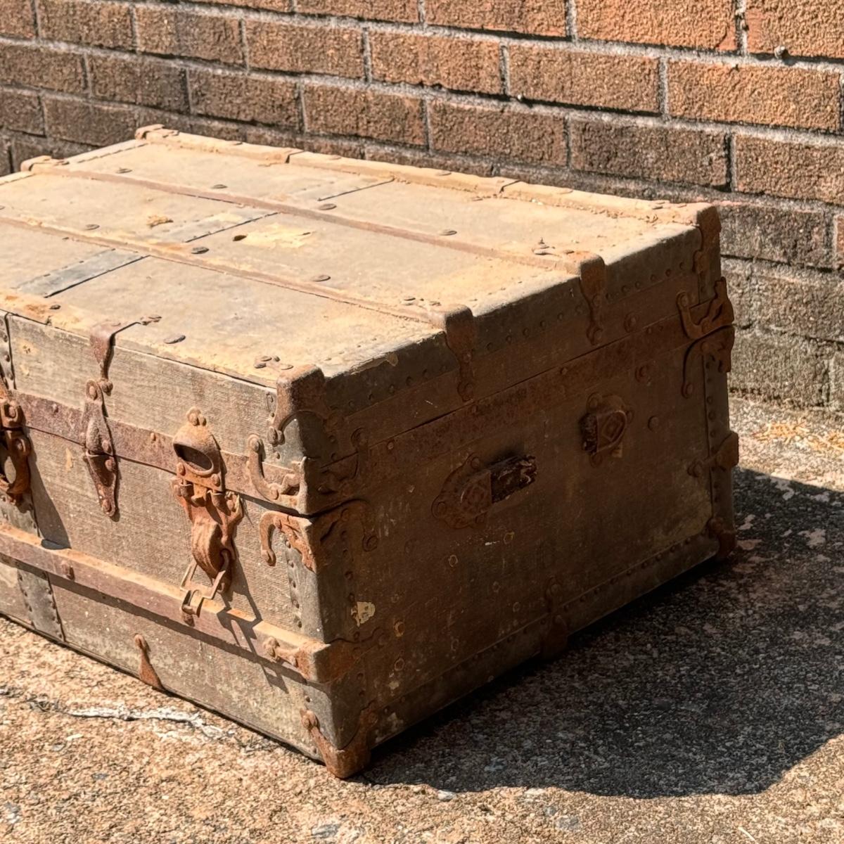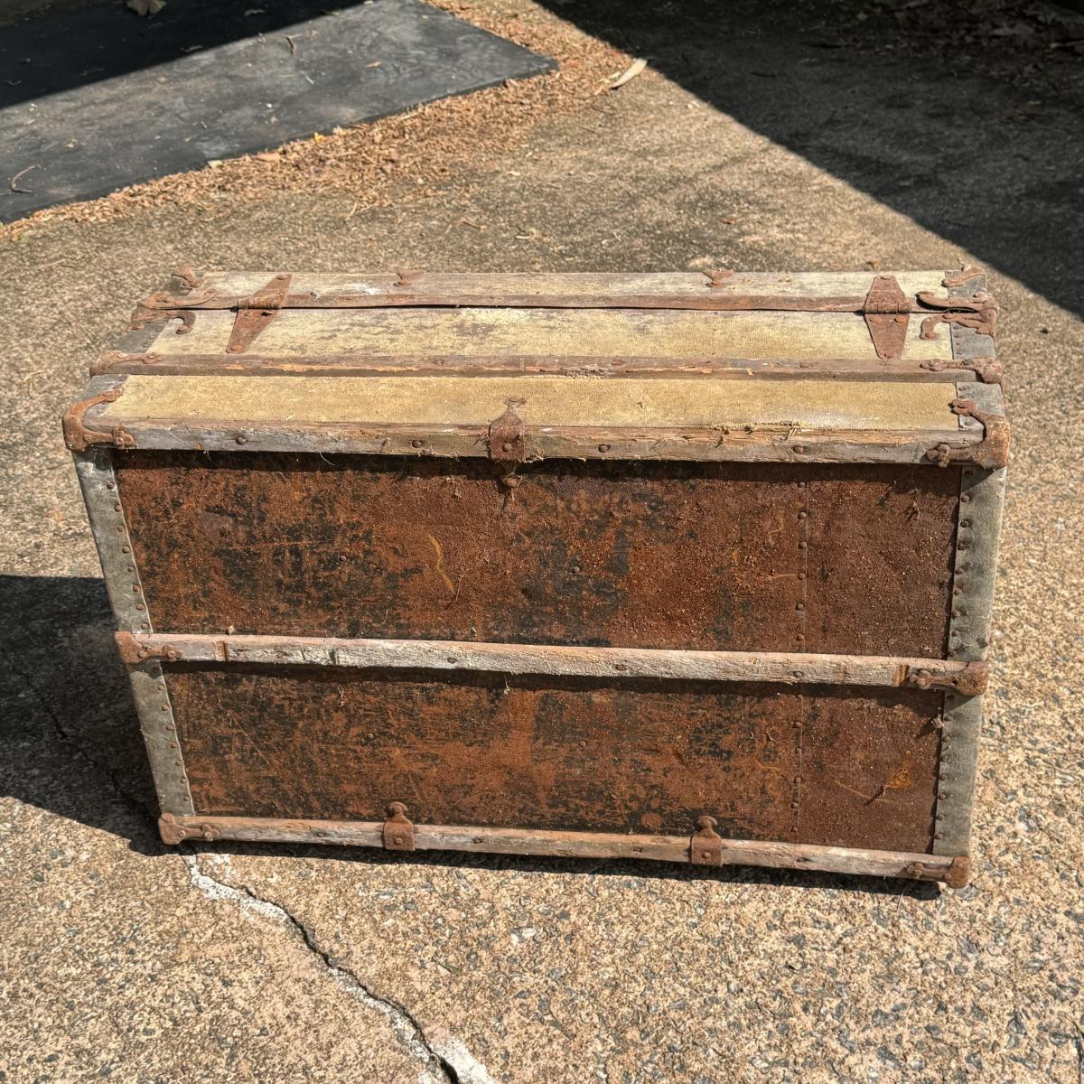 This lot includes one rustic steamer trunk that appears to be vintage. The material used is canvas over wood with metal accents. The trunk has signs of wear including rust and mold - see pictures included. The lock does not work. The trunk measures 30” x 18” x 12”H. Local pickup only.