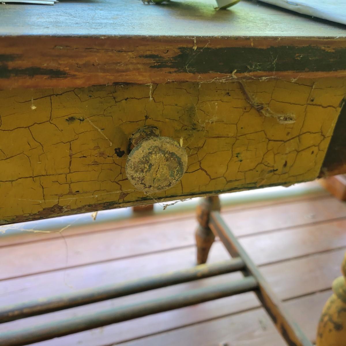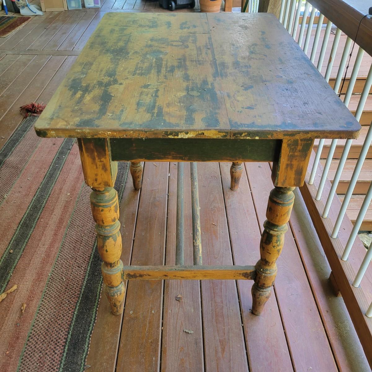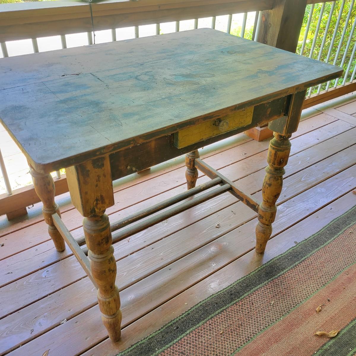 A rustic style table with a dovetailed drawer. Its finish is peeling off in some areas, but could be refinished or used as a gardening table. It measures approximately 39" x 27" x 32"H. Local pickup only
