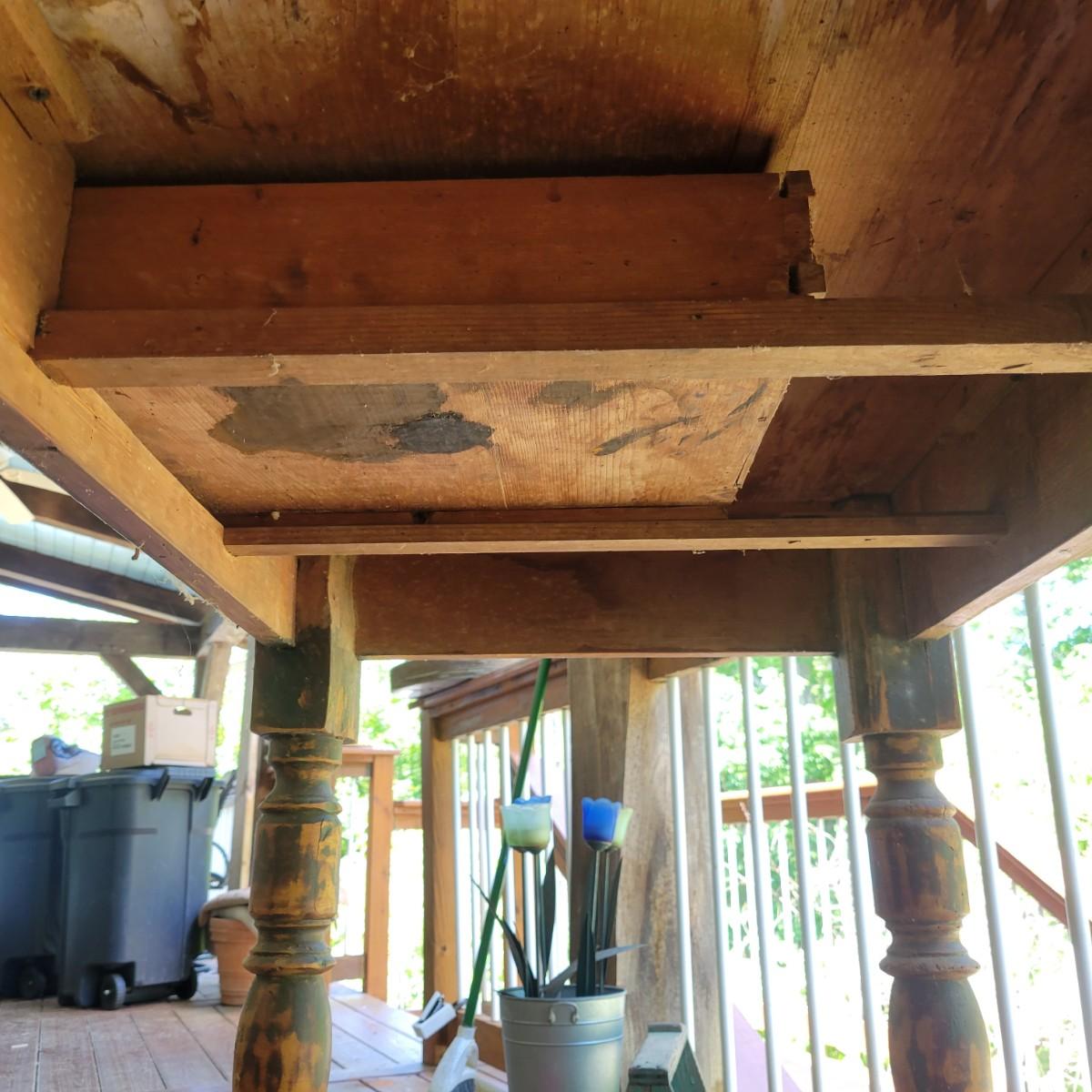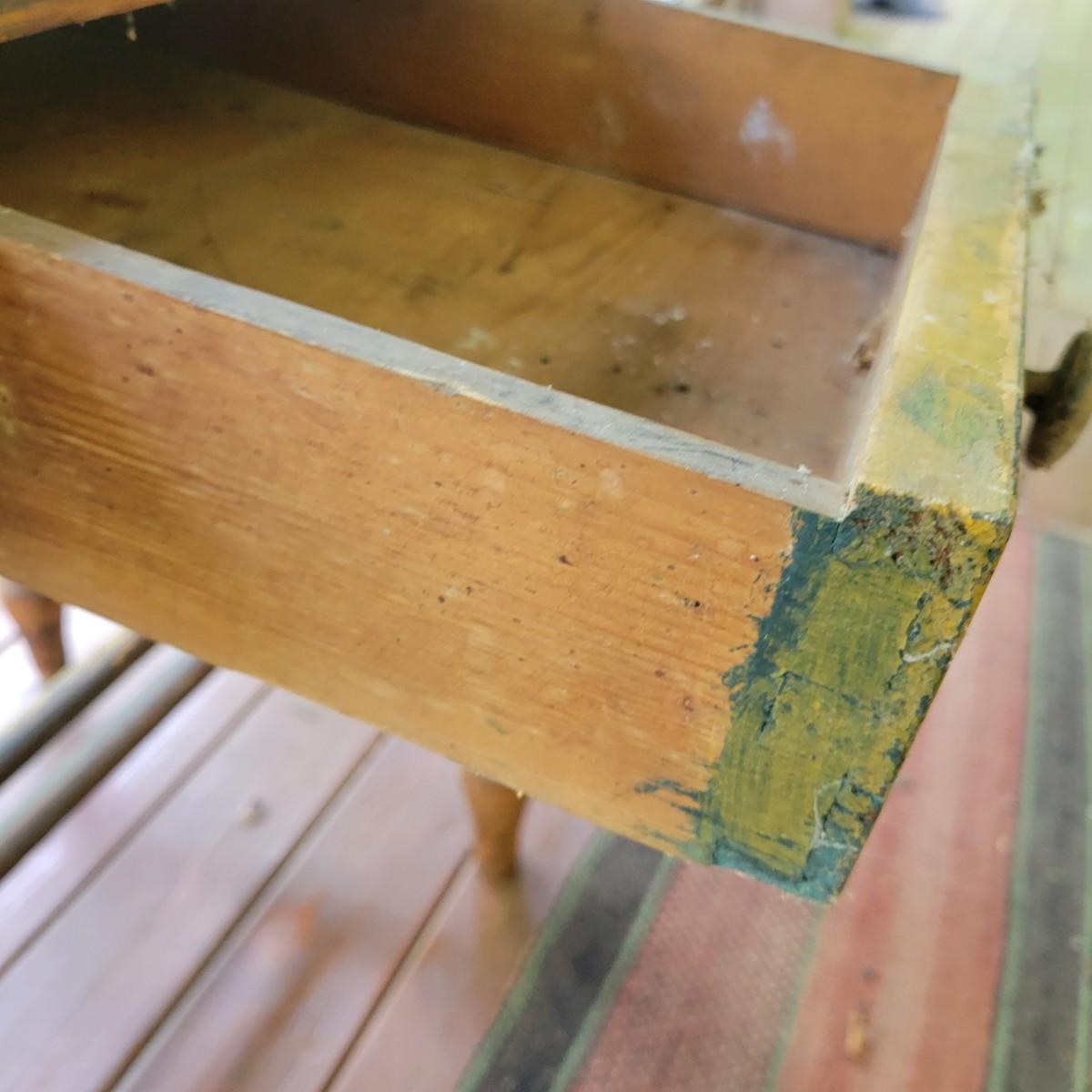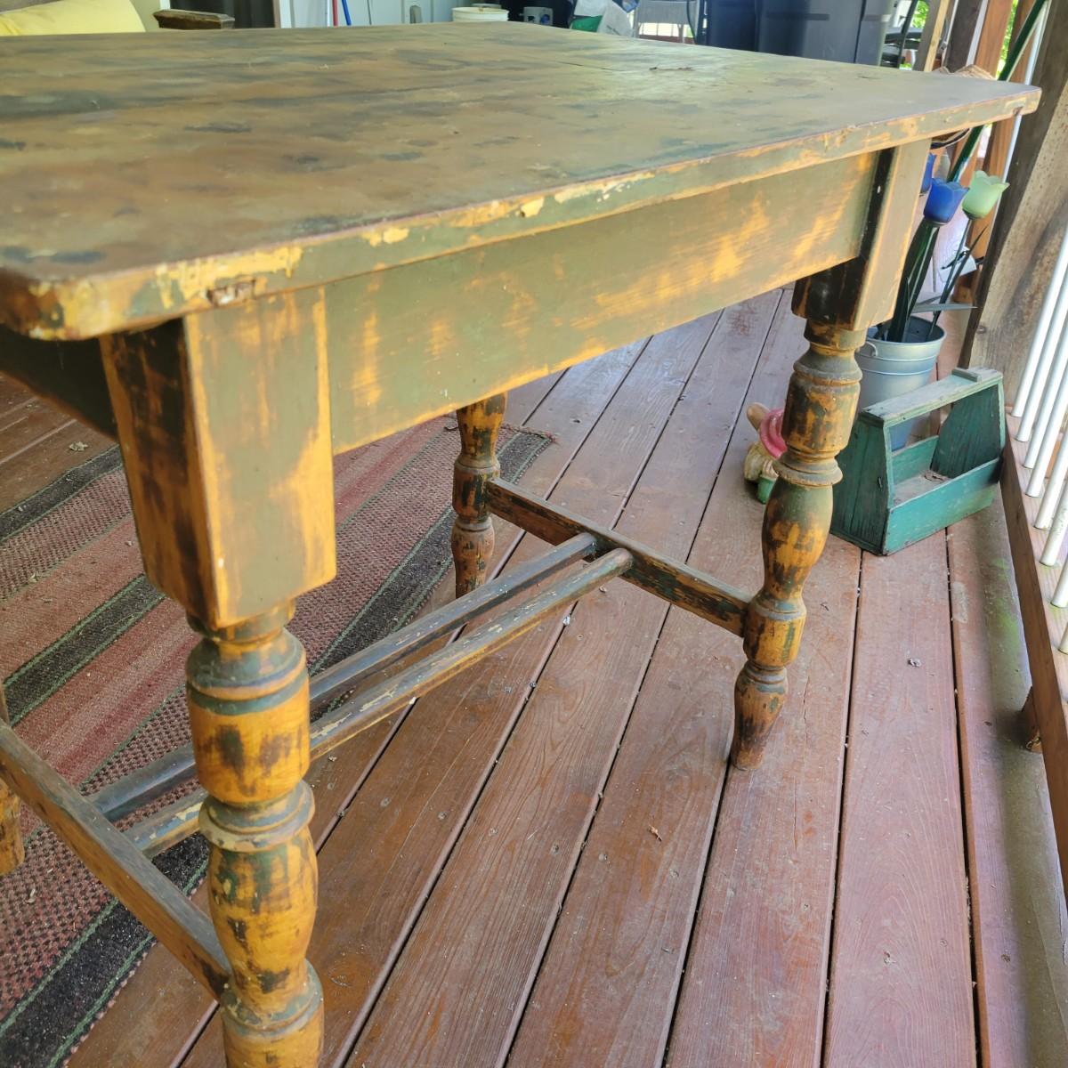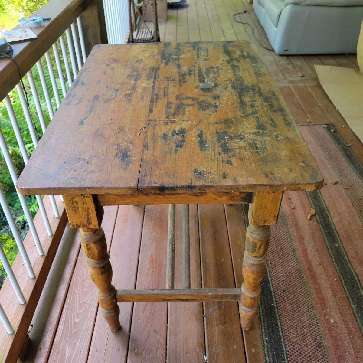 A rustic style table with a dovetailed drawer. Its finish is peeling off in some areas, but could be refinished or used as a gardening table. It measures approximately 39" x 27" x 32"H. Local pickup only