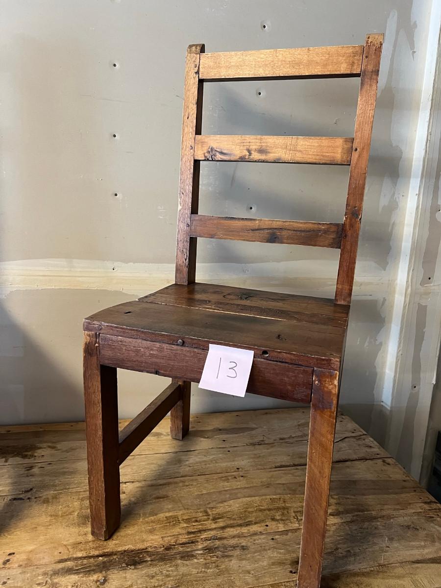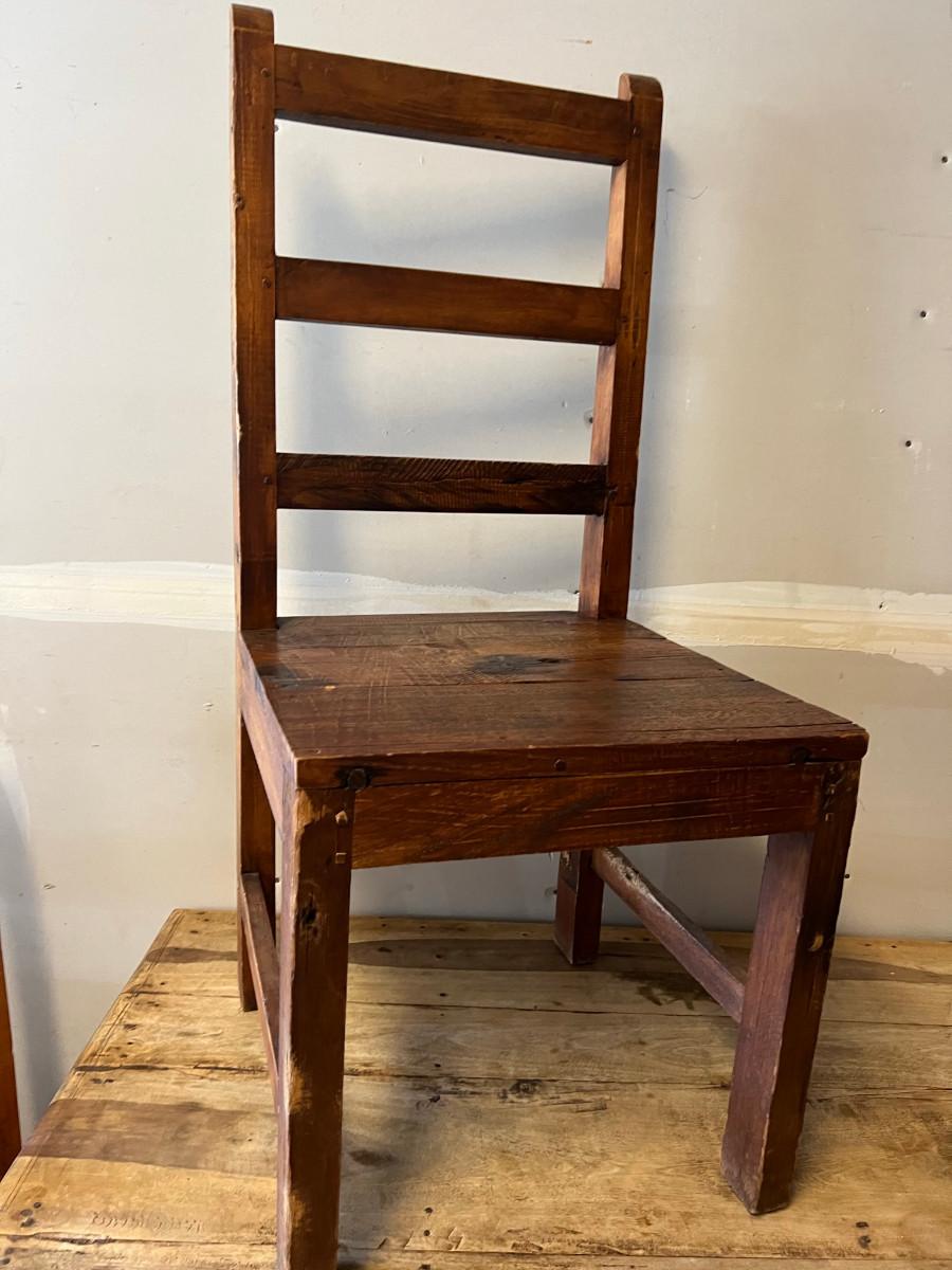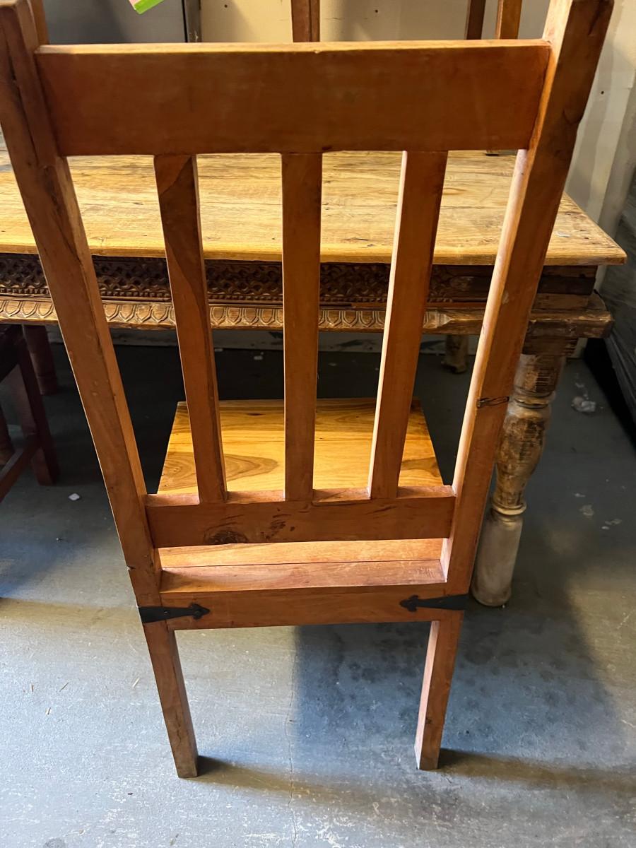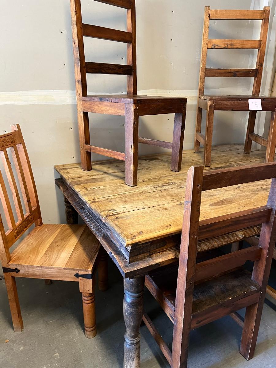 Rustic table and 4 chairs identical and 2 chairs different but similar style. Table: 69" wide x 46" deep x 31" tall. Chairs: 18" wide x 19" deep x 42" tall (back) 17 3/4" tall seat. Other chairs: 18" deep x 18" wide x 43" tall back 18" seat height.