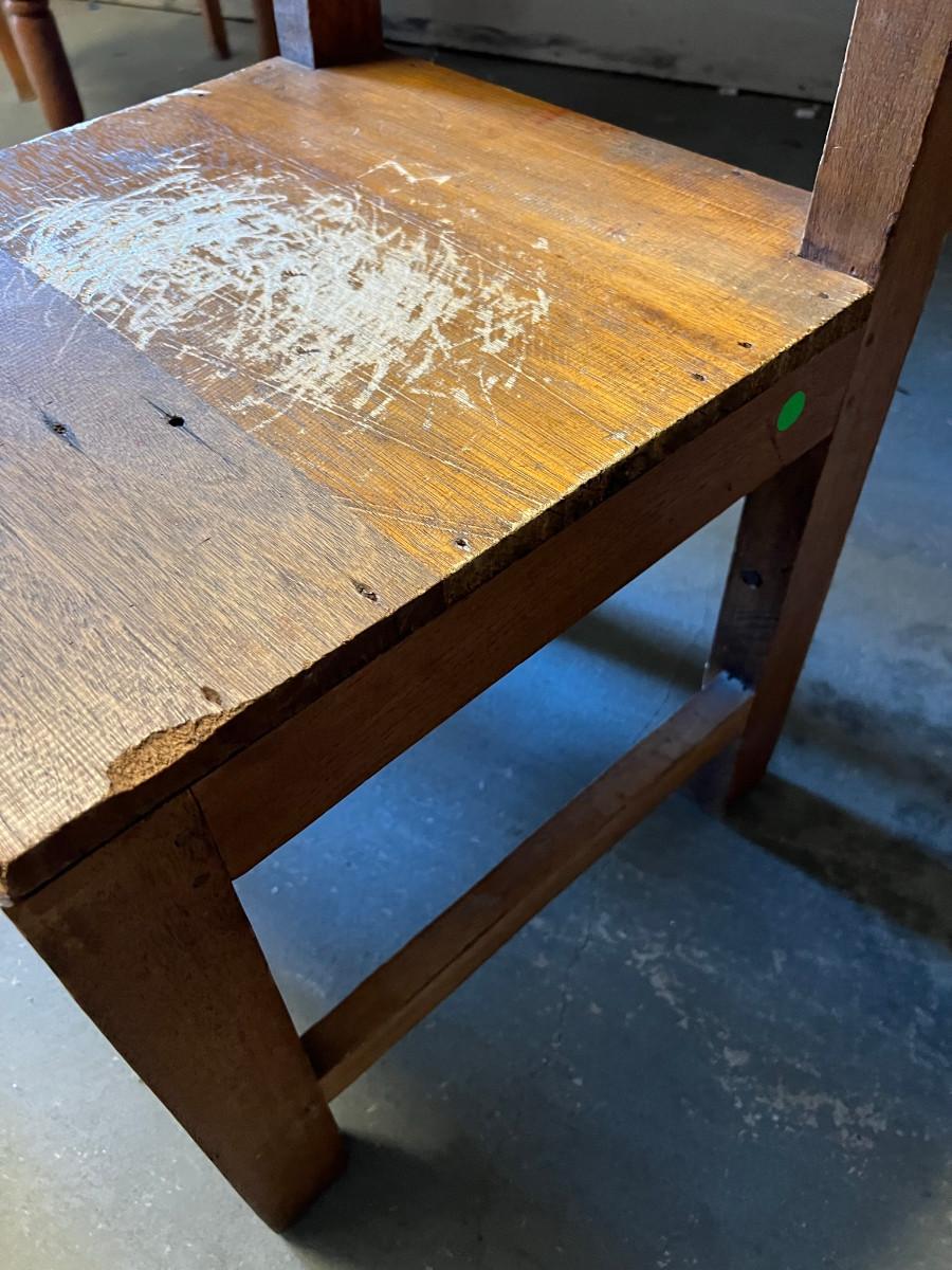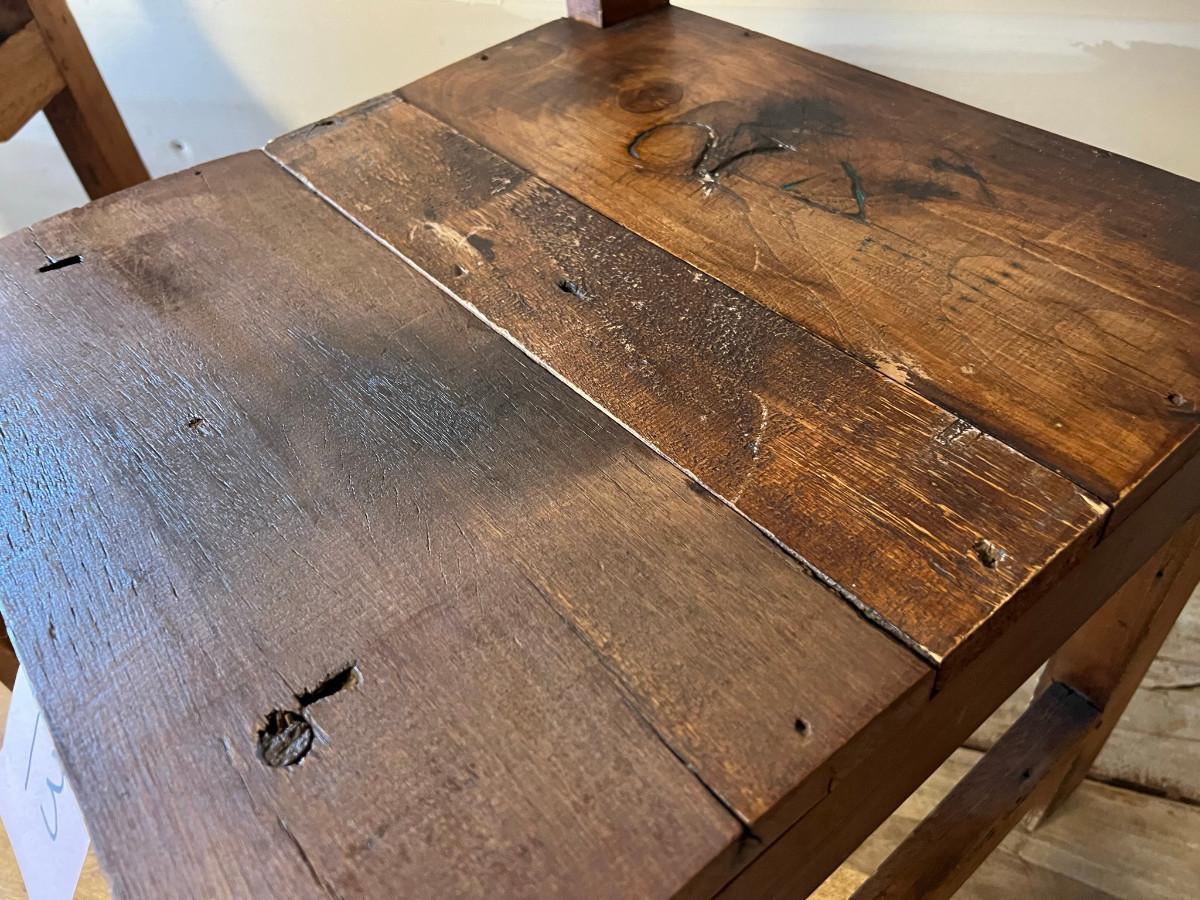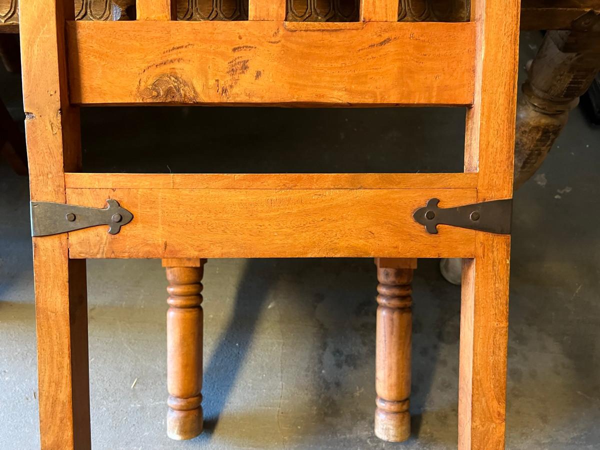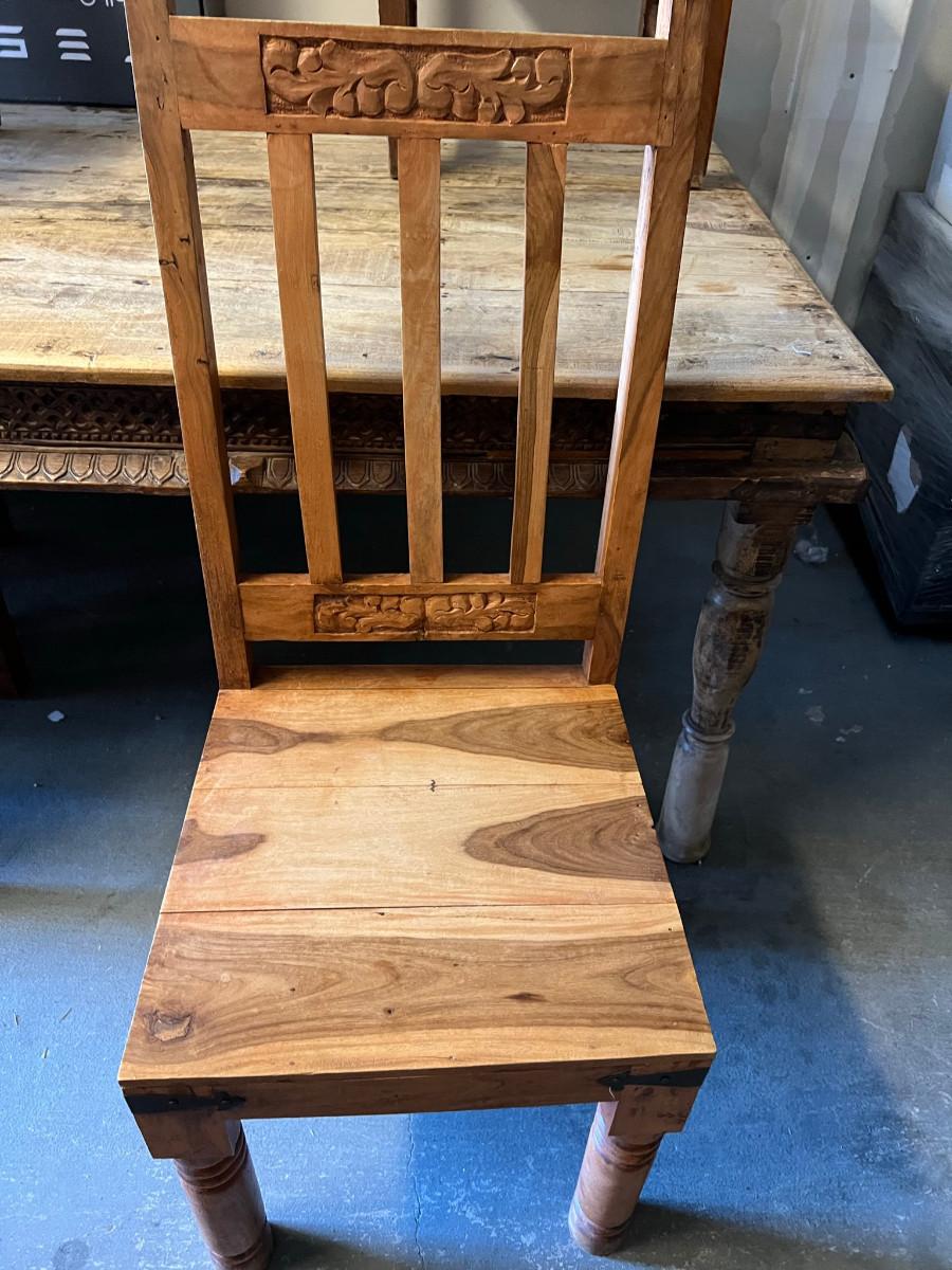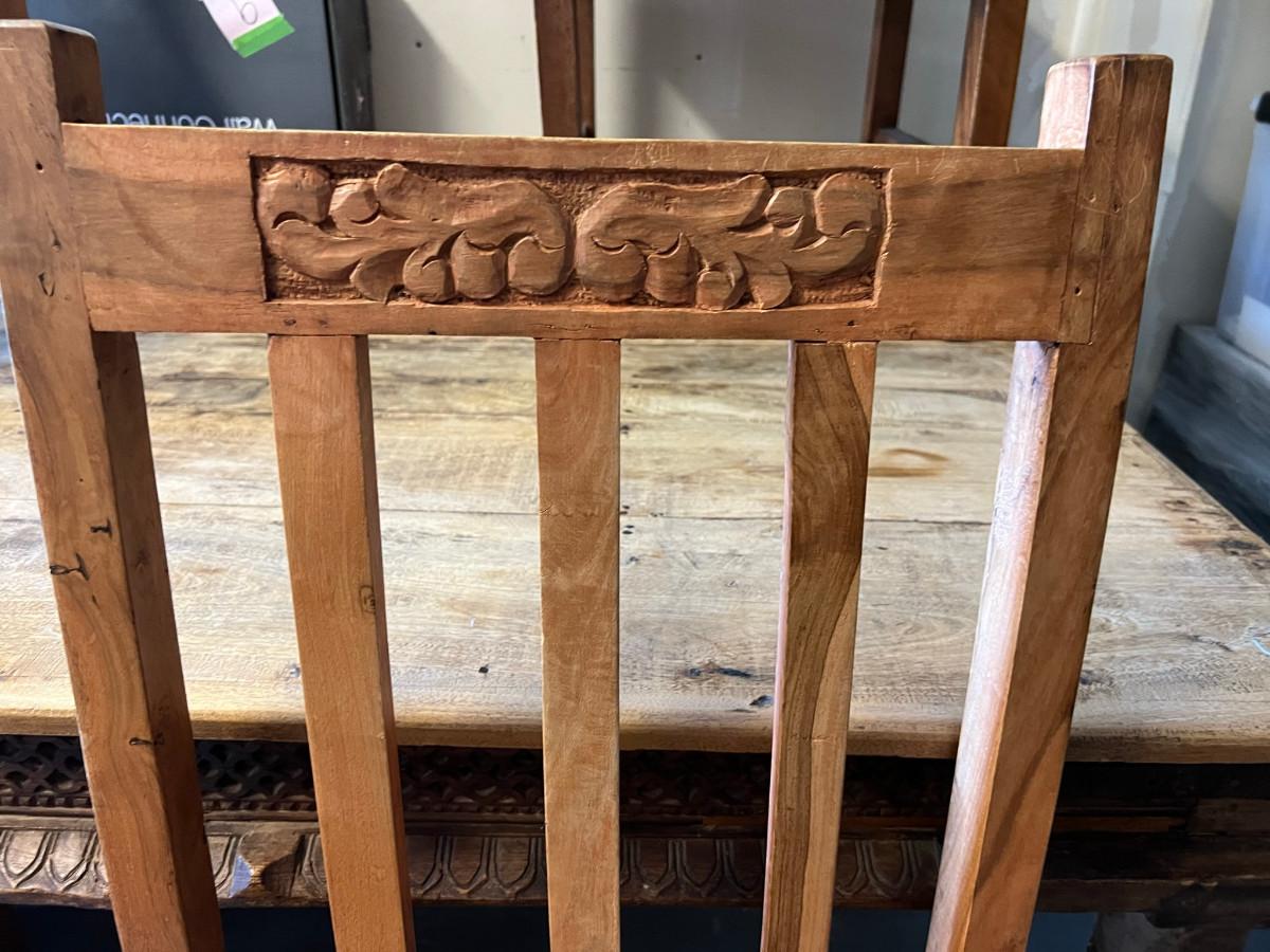 Rustic table and 4 chairs identical and 2 chairs different but similar style. Table: 69" wide x 46" deep x 31" tall. Chairs: 18" wide x 19" deep x 42" tall (back) 17 3/4" tall seat. Other chairs: 18" deep x 18" wide x 43" tall back 18" seat height.