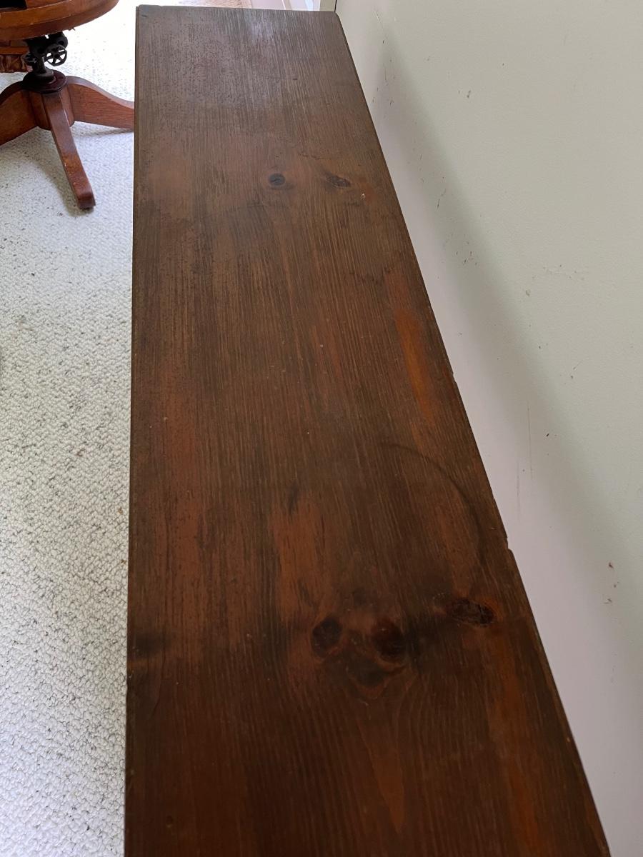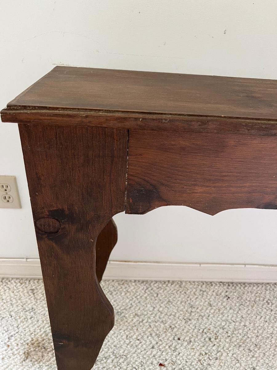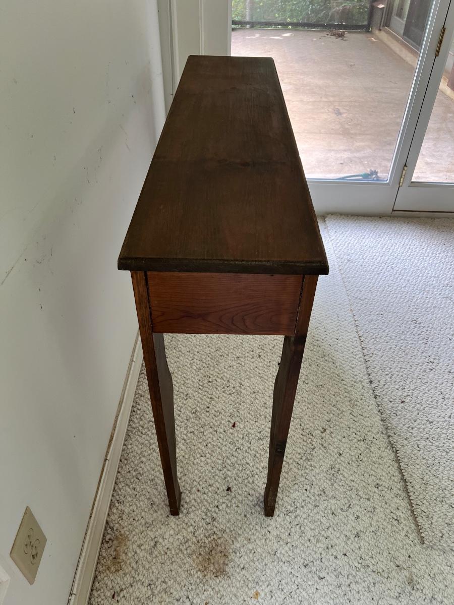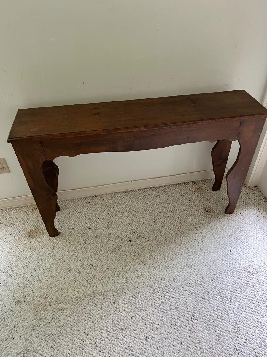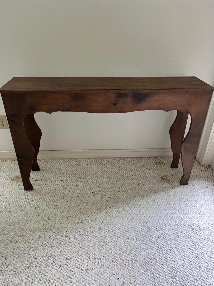 A narrow wooden table, excellent for behind sofa or hallway. The finish is stained a medium brown. The table measures 48” x 11” x 29”H.Table is light weight and the legs appear to be two pices cut from a thick plywood.