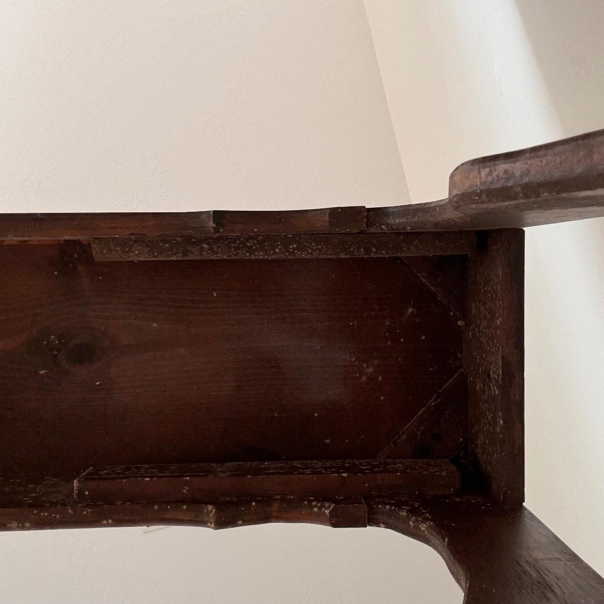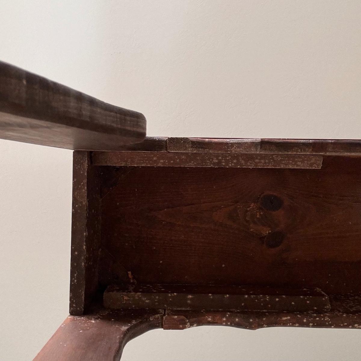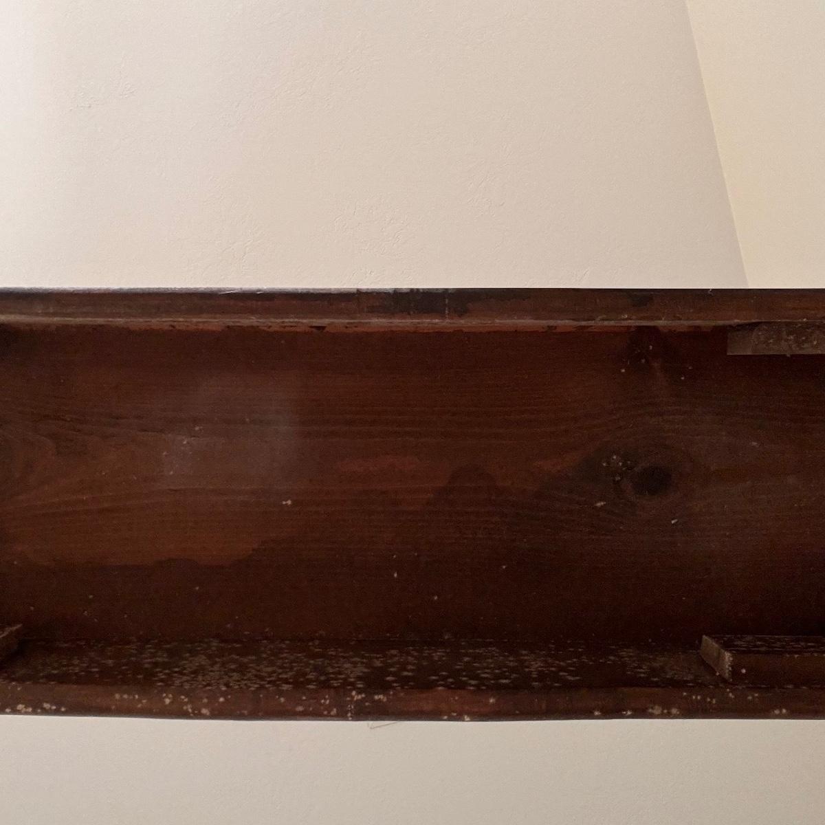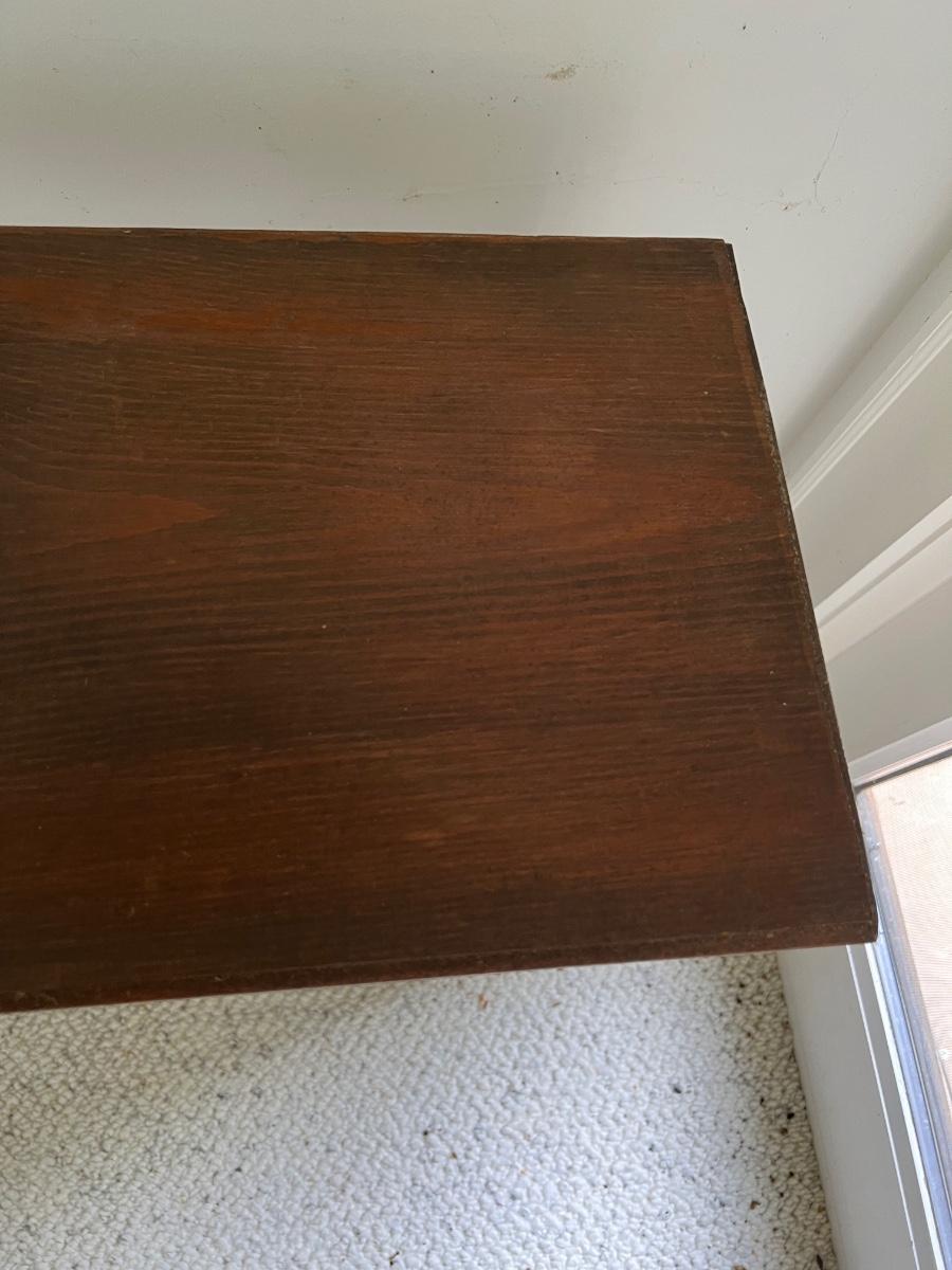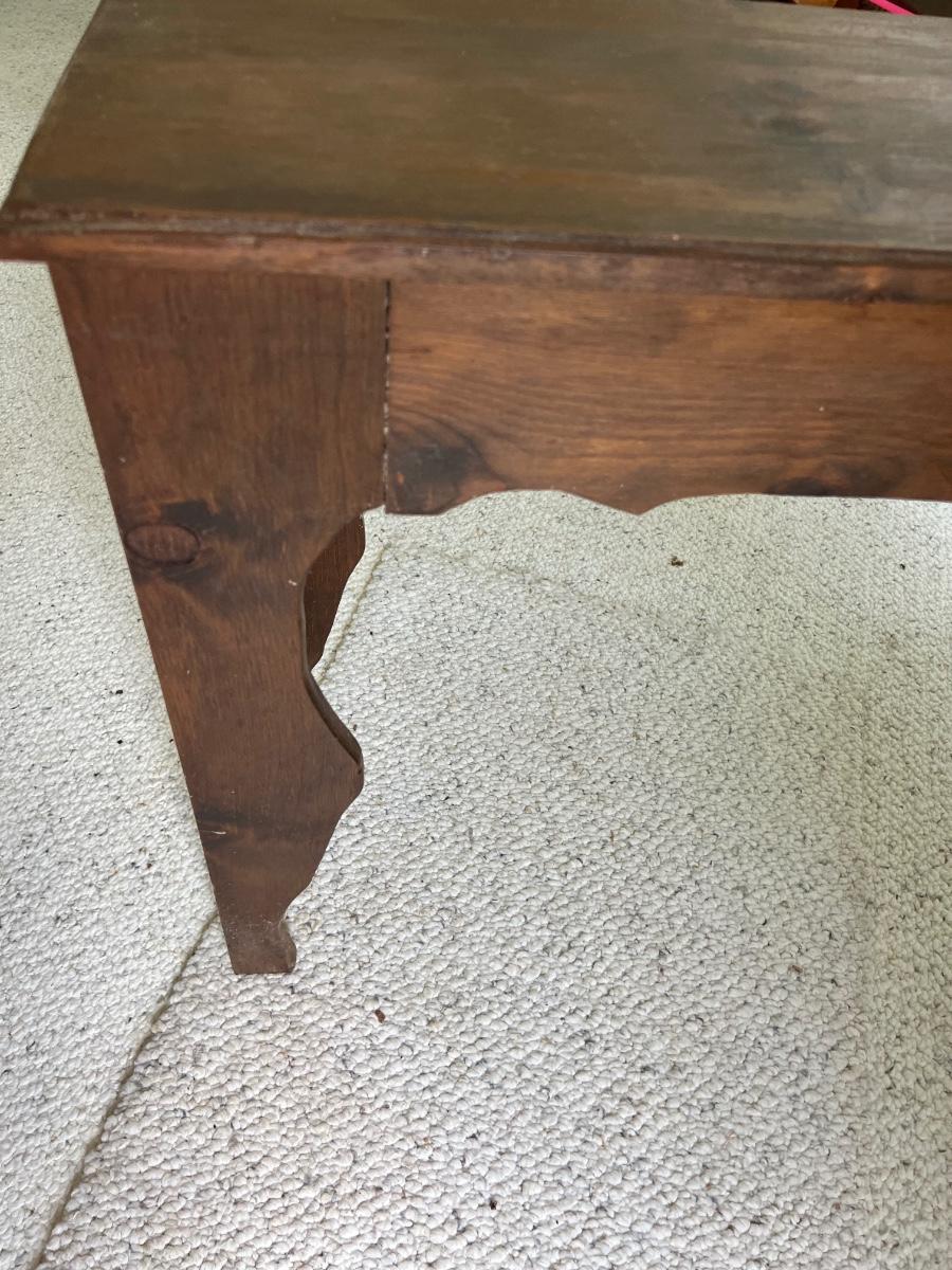 A narrow wooden table, excellent for behind sofa or hallway. The finish is stained a medium brown. The table measures 48” x 11” x 29”H.Table is light weight and the legs appear to be two pices cut from a thick plywood.