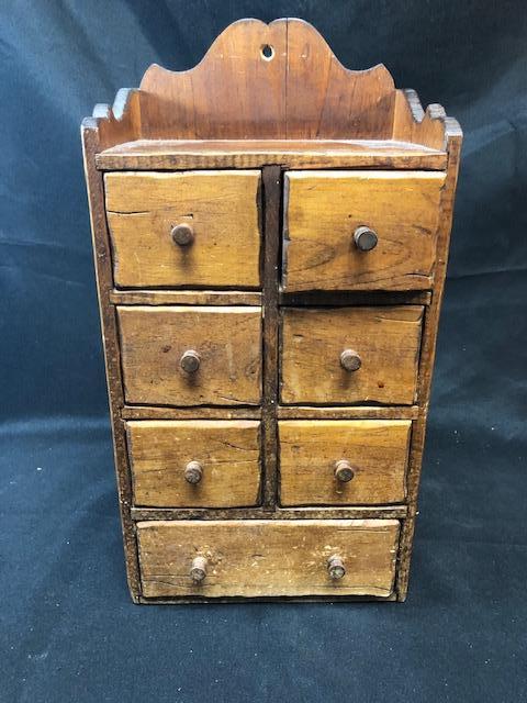 Rustic wood 7 drawer organizer. Jewelry box size. Made for sitting atop dresser or table. Could be hung from the center hole at the top.
