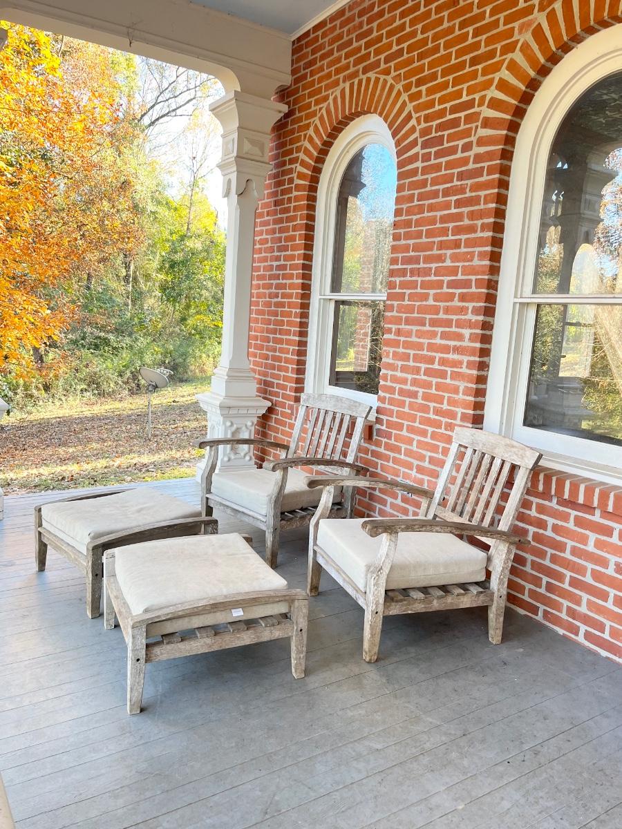 Porch Kept ~ THRESHOLD Linen Colored Cushions need cleaning ~ Chairs as you can see need painting or some type of restoring ~ See photos for wear ~ Chair 35” H x 31” W x 32” D ~ Ottoman 15” H x 28” W x 27” D
