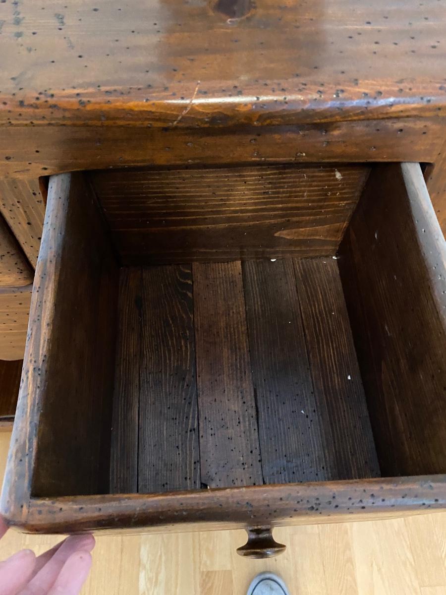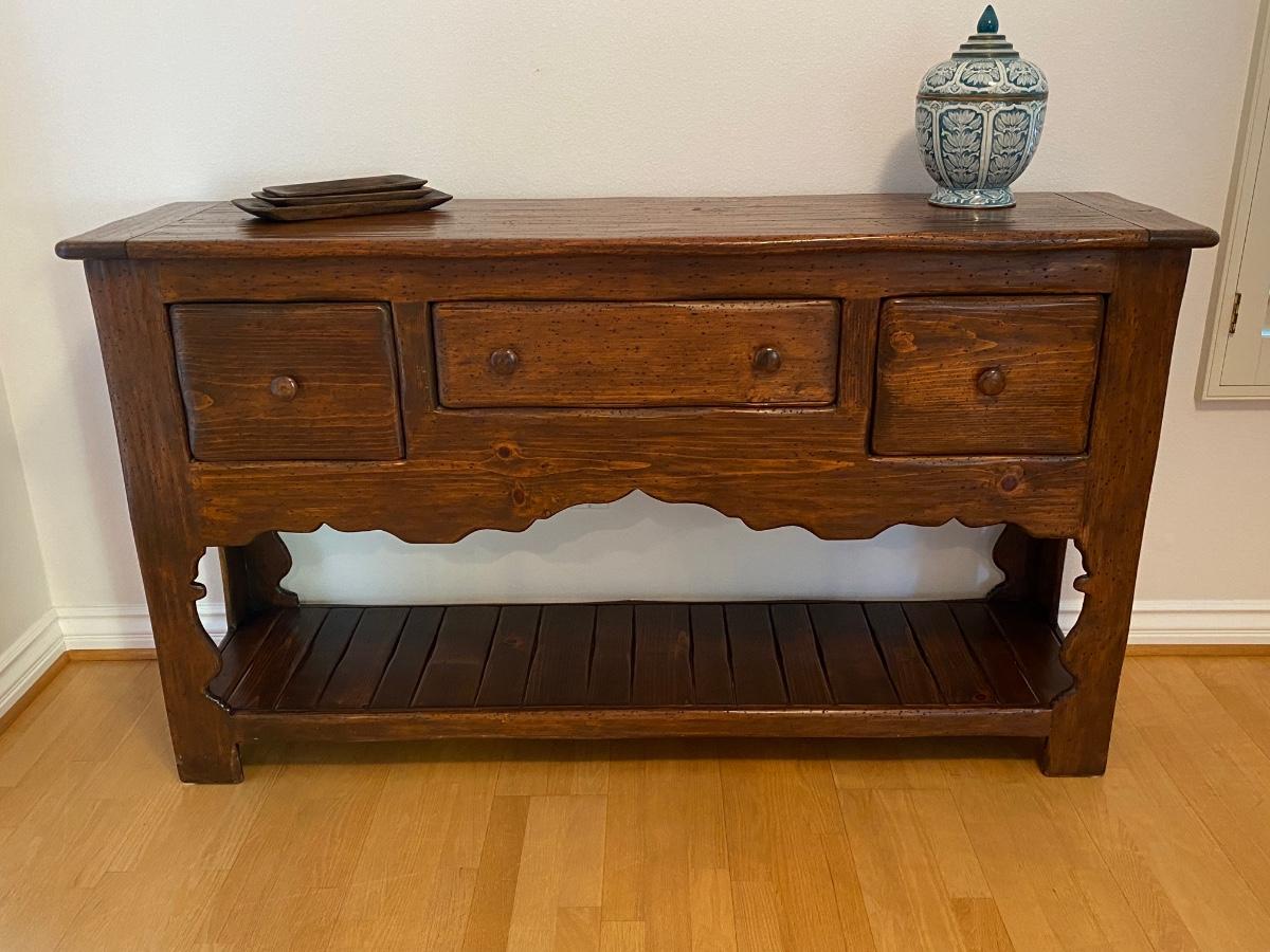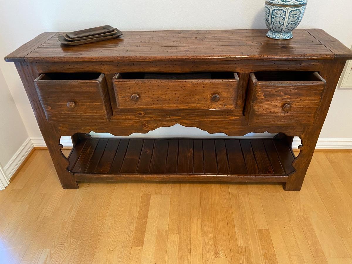 Rustic three drawer console table. Dark stain finished wood, has a rustic primitive look to it. Good condition. Measures about 5' long, 34" tall and 16" deep.